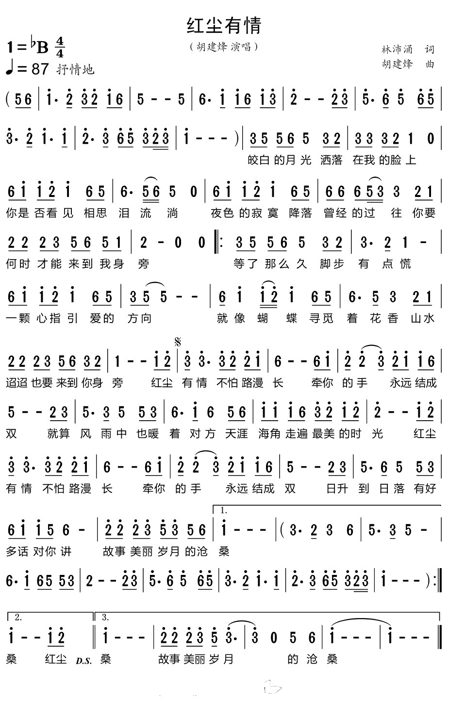 红尘有情简谱-胡建烽演唱歌曲-小叶子159曲谱