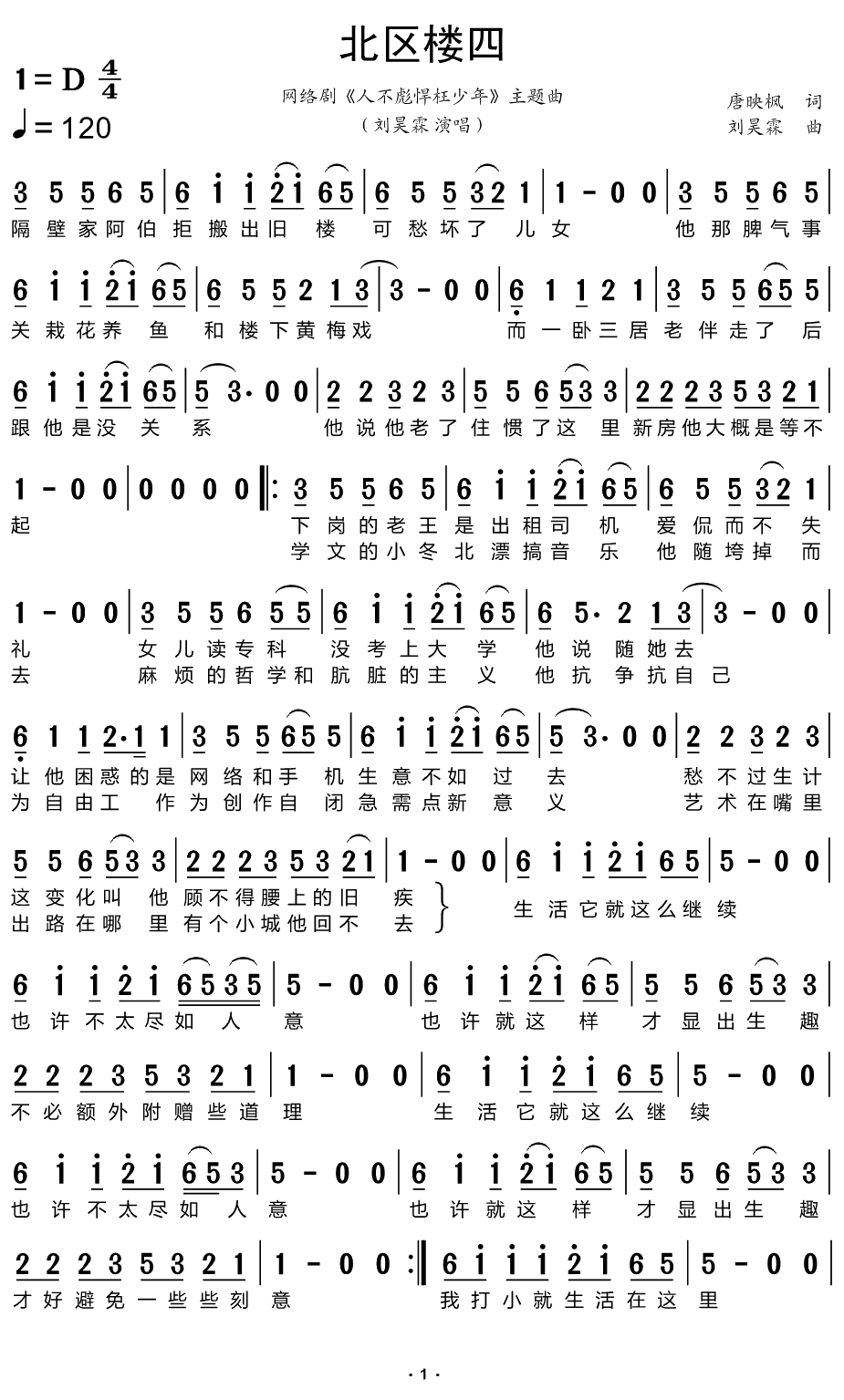 北区楼四简谱-刘昊霖演唱歌曲-小叶子159曲谱