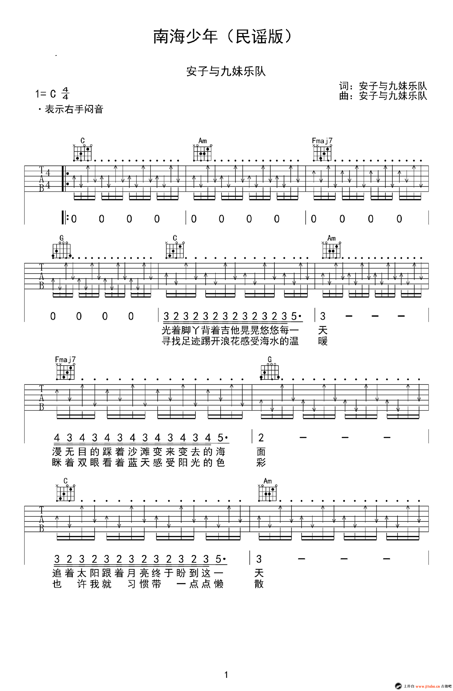 安子与九妹《南海少年》吉他谱,C调编配民谣版,南海少年吉他弹唱谱,六线谱格式,高清图片谱,曲谱为安子与九妹乐队提供分享,吉他吧网站整理上传。 一首清新洒脱的正能量民谣,就像歌词所唱,世界每天都在转,与其感伤不如歌唱。跟着安子与九妹一起歌唱生活,歌唱快乐吧。