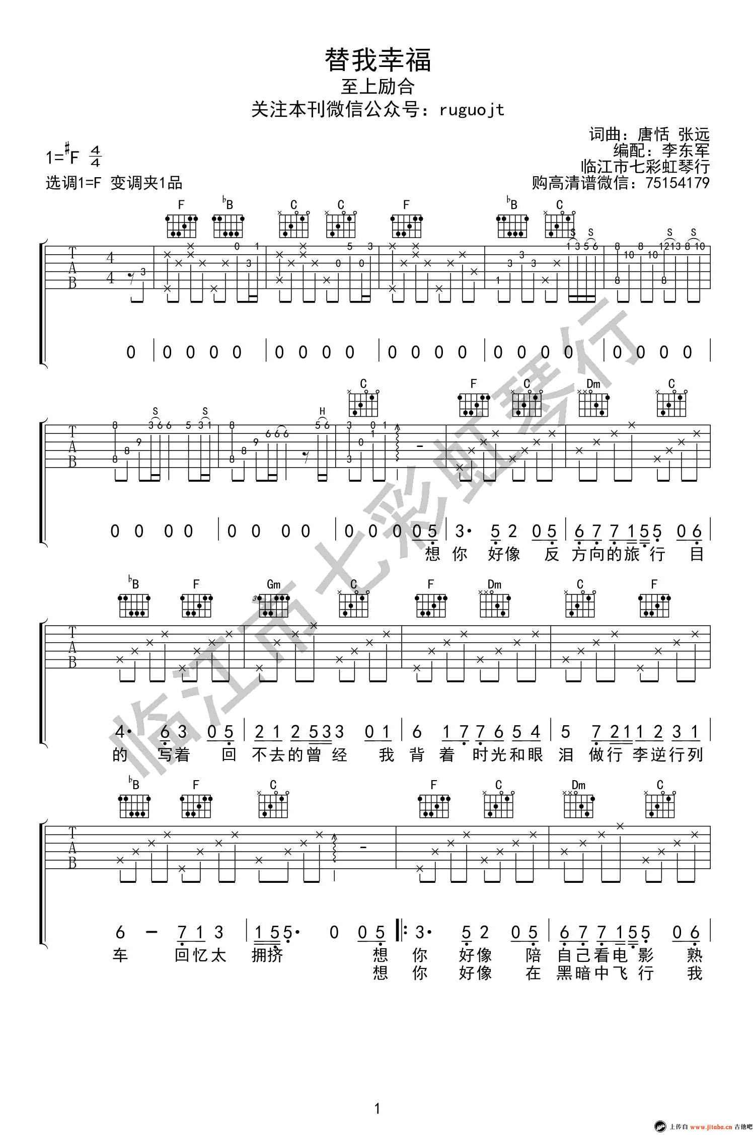 替我幸福吉他谱,至上励合演唱,替我幸福吉他弹唱谱,高清图片谱。歌曲原调升F,变调夹夹一品,选调F。据说这是至上励合成员张远亲身经历,在历经感情挫折后所写的一首心酸情歌,歌词里每句话都戳中失意人的软肋。 有些人一辈子也忘不了,魂牵梦萦,无法忘记!时隔多年都会梦中重编故事,现实中除了暗地里祝福别无选择,感谢这首歌。