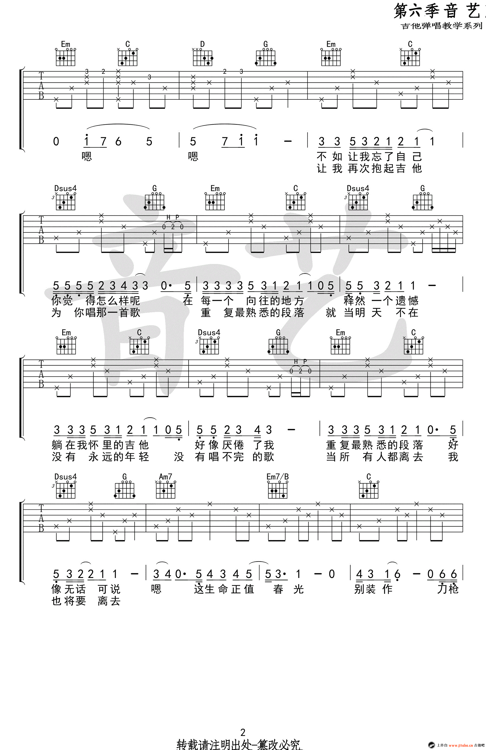 曹方张希《认真的老去》吉他谱,原调A,变调夹夹第二品,选用G调指法编配。认真的老去吉他弹唱谱,高清六线谱完整版共四张图片,感谢音艺吉他出品,吉他吧网站分两页呈现。 就是这样一首简单质朴的歌,从曹方清甜的女声与张希温暖暗哑的嗓音里,唱出了年少轻狂,叹出了时光的远去,听出来我们就如水般的老去。当年轻的时候,我们不懂得如何好好认真对待生活,会觉得找不到人生的方向。但是,我们在慢慢老去,慢慢错失了青春,还没来得及在年轻的时候选择认真对待一切,所以我们最终选择了认真的老去。