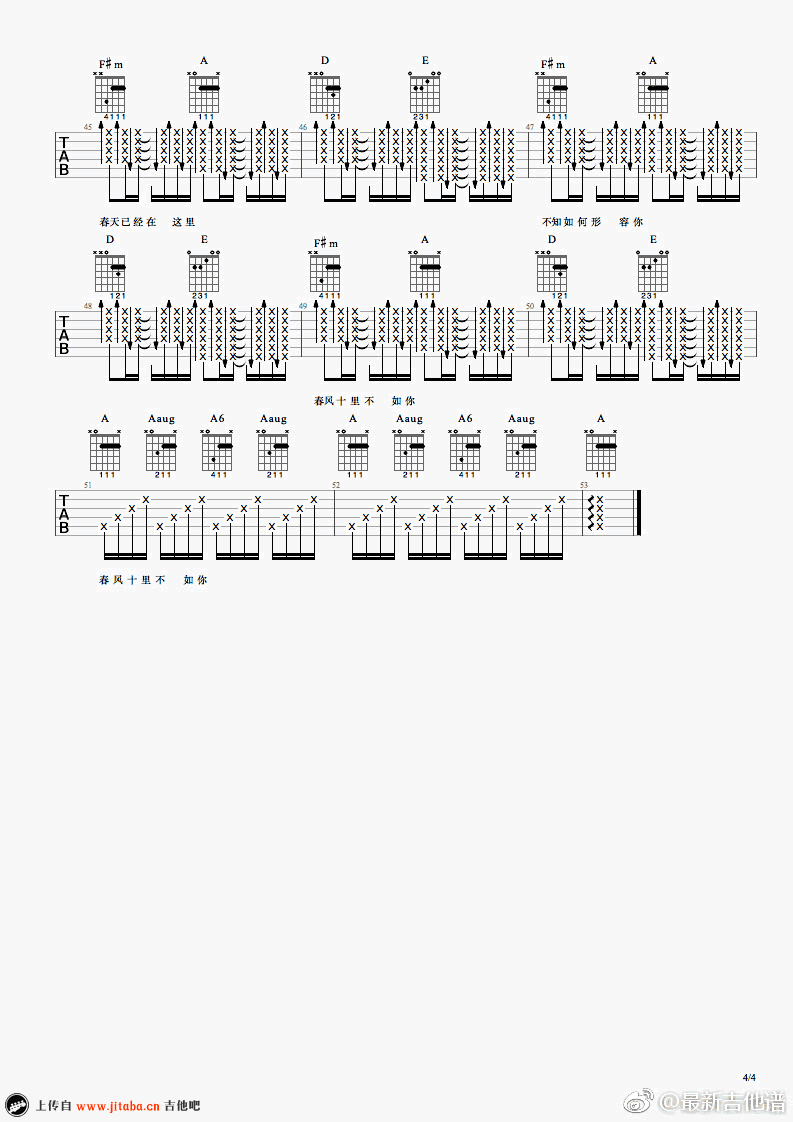 李健《春风十里不如你》吉他谱,六线谱完整版,四张图片谱。最新吉他谱编配。 周冬雨张一山主演的《春风十里不如你》同名电视剧主题曲,优美的歌声搭配富有年代感的剧情,曲调悠扬舒缓,细腻克制地讲述着初遇心爱之人的内心悸动。