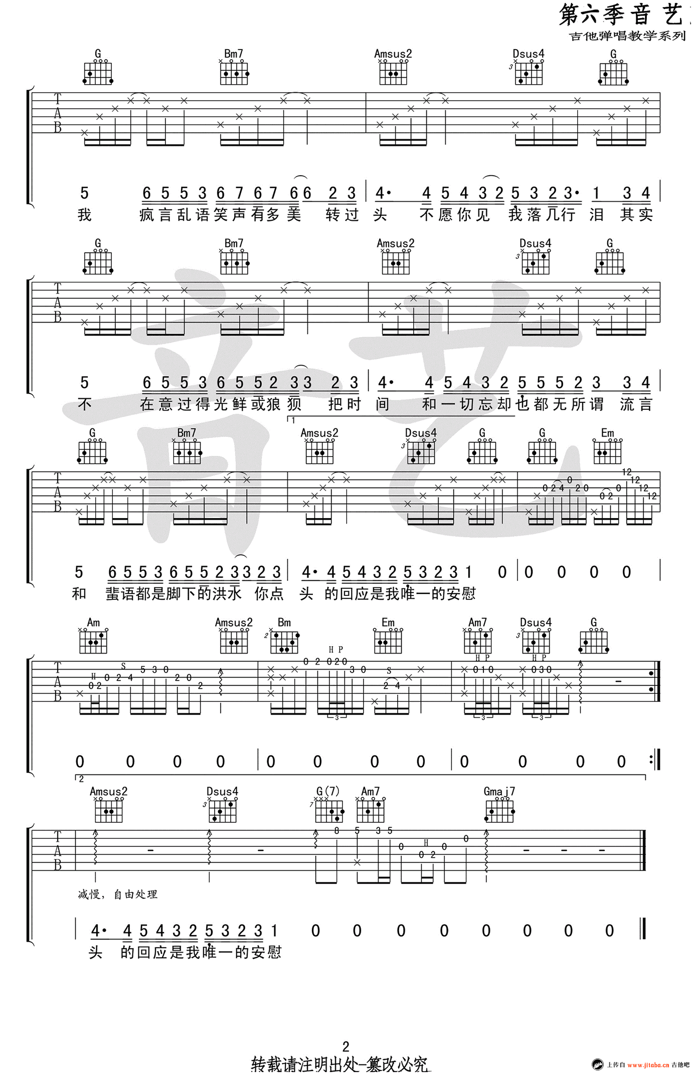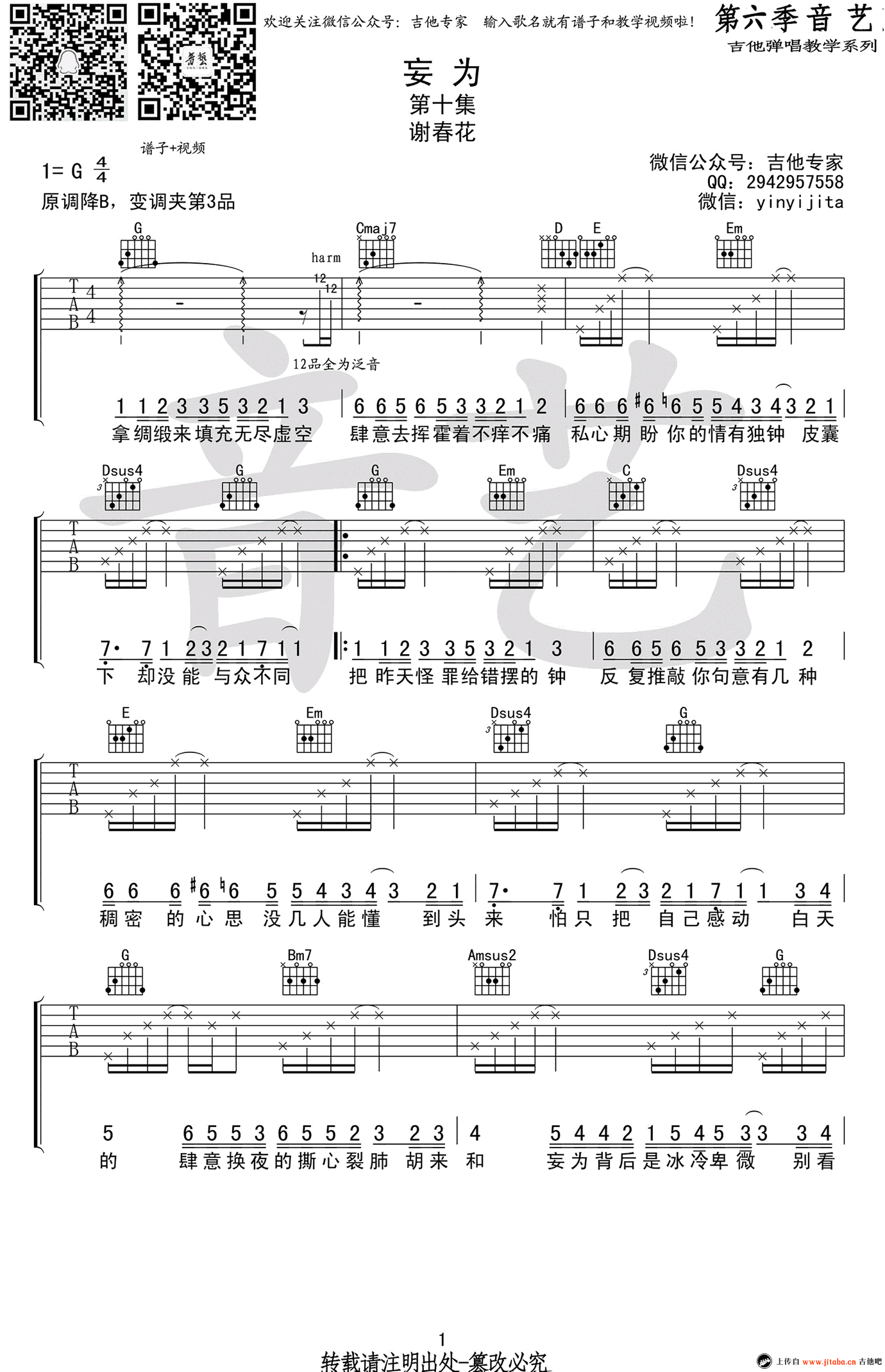 谢春花妄为吉他谱,G调弹唱谱,原版编配,妄为吉他弹唱谱,高清图片六线谱。“私心期盼你的情有独钟,皮囊下却没能与众不同。” 谢春花暖心演绎爱情里的光鲜与狼狈。音艺吉他出品,吉他吧网站上传。 最后还是自己,自己走出这片黑暗,自己把自己心里的积雪全部融化,光和春天都会到来的,不要太难过。相信吗,春光会把庸常生活撕开一个口子,那些明亮的美好的玩意儿,像巧克力糖豆一样都跑进来啦。春夜听民谣,有万事无挂碍的自在,又有身在此身的笃定。