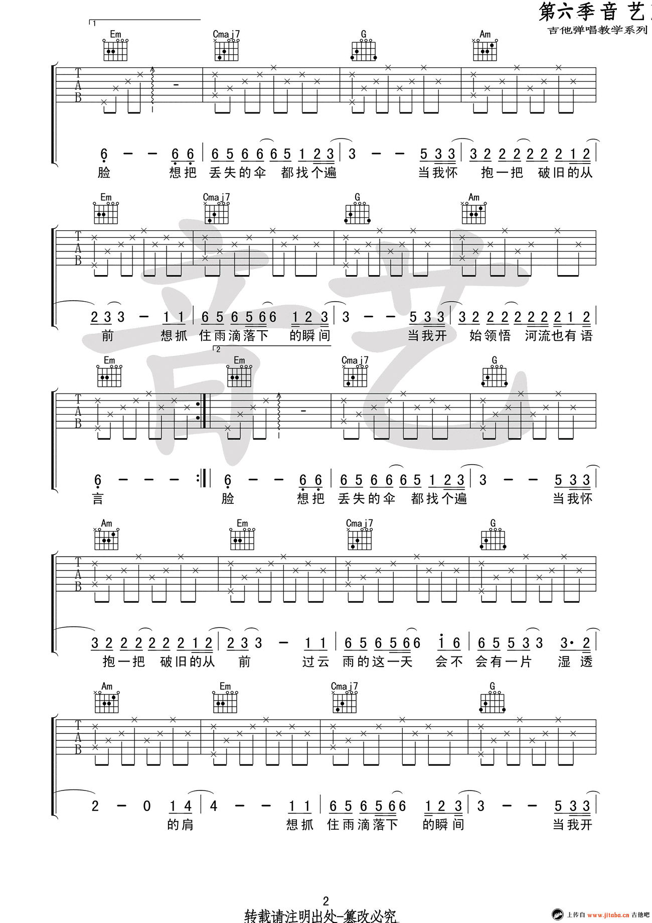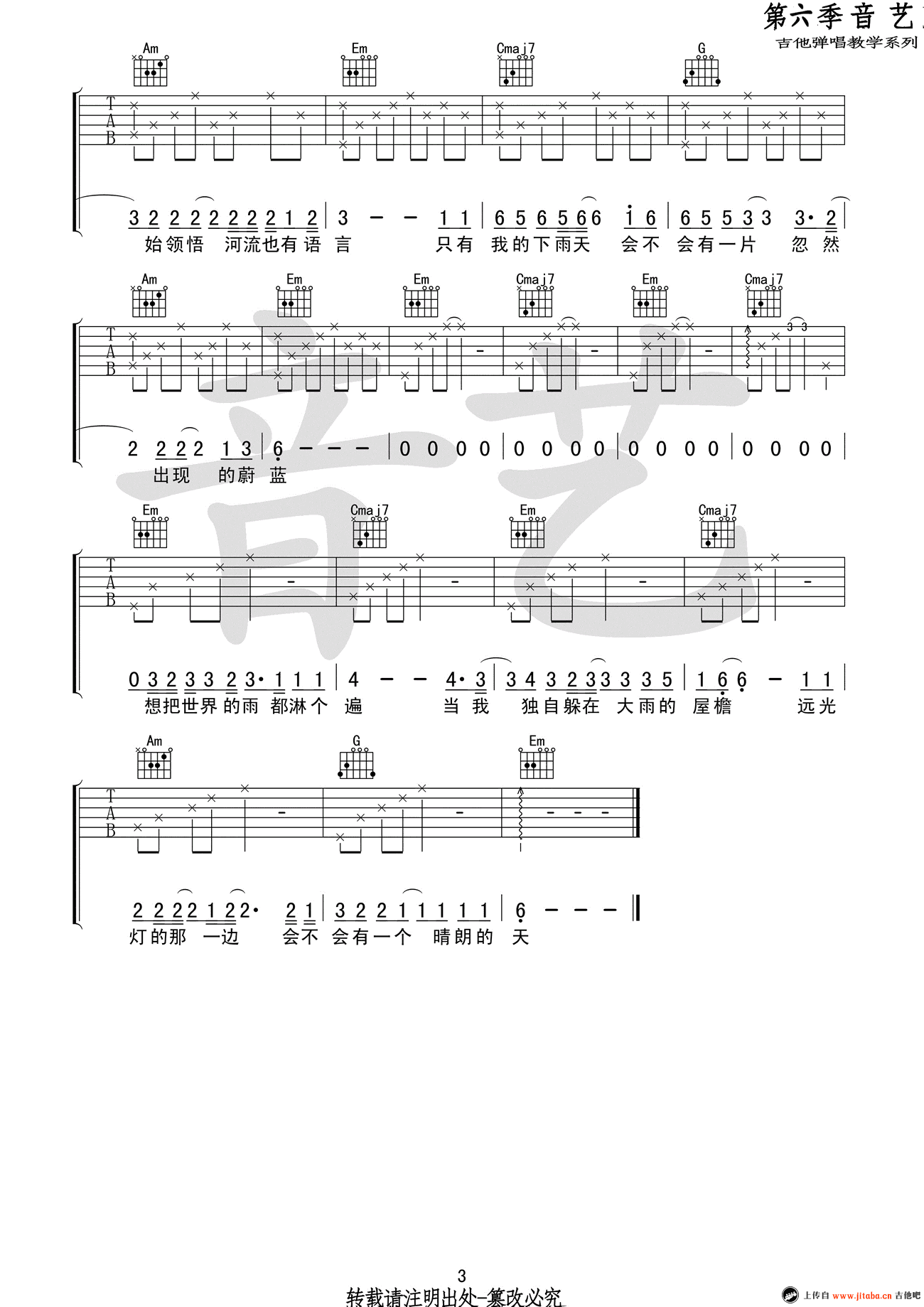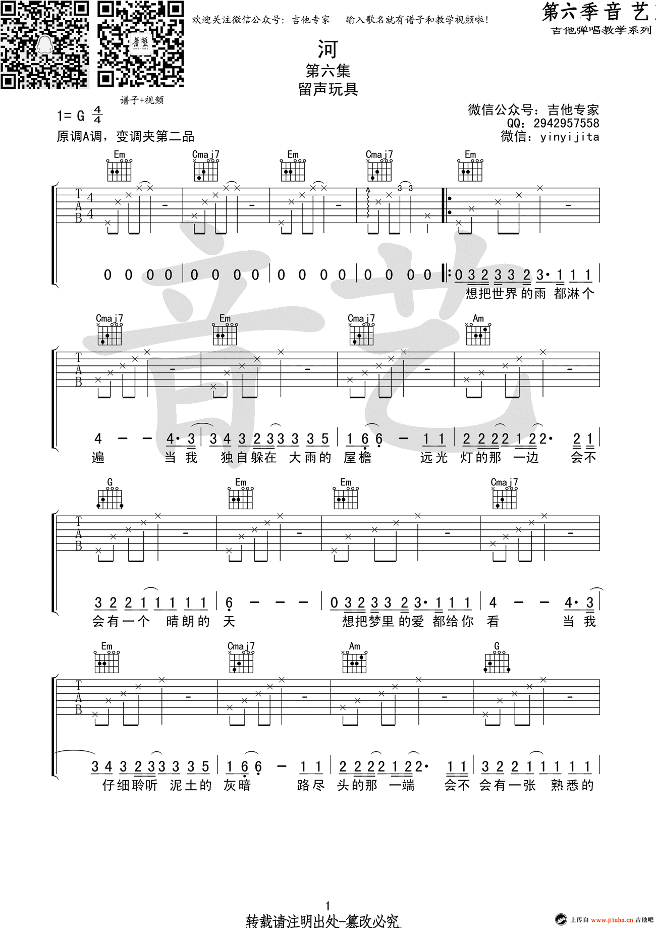 河吉他谱,留声玩具的一首原创民谣歌曲,变调夹夹二品,选用G调指法。河六线谱,高清弹唱谱,三张图片谱。音艺吉他编配,吉他吧网站上传。 雨下大了就成了河,我们都是那个过河的人。你现在所拥有的,不过是你错失千万后所留下来的。让人安静的歌曲,安抚了每一颗躁动不安的心。