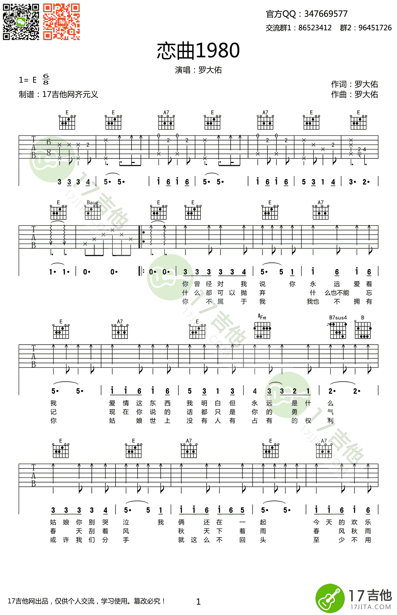 恋曲1980吉他谱,罗大佑经典老歌,恋曲三部曲之一,E调指法编配,恋曲一九八零六线谱,高清弹唱谱,感谢齐元义编配。吉他吧网站为琴友们上传推荐。 喜欢罗大佑这首柔情的怀旧老歌,收录于《之乎者也》专辑。 岁月带走了我们的青春,却带不走音乐里的记忆。那些明媚的欢快,那些晦涩的伤悲,再不会如此真实。