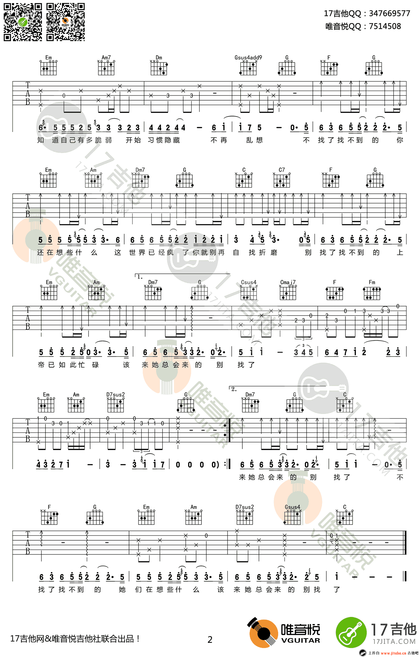 郭旭《不找了》吉他谱,六线谱编配,原调F,选调C,变调夹夹第五品。不找了吉他弹唱谱,高清图片谱。唯音悦吉他社编制,吉他吧网站上传。 一首好听的民谣歌曲,唱出了很多正处于单身状态的人的心境。也曾对爱情充满着向往,可感情的事毕竟不能仅凭着你的一厢情愿。嗨,别找了,该来它总会来的。