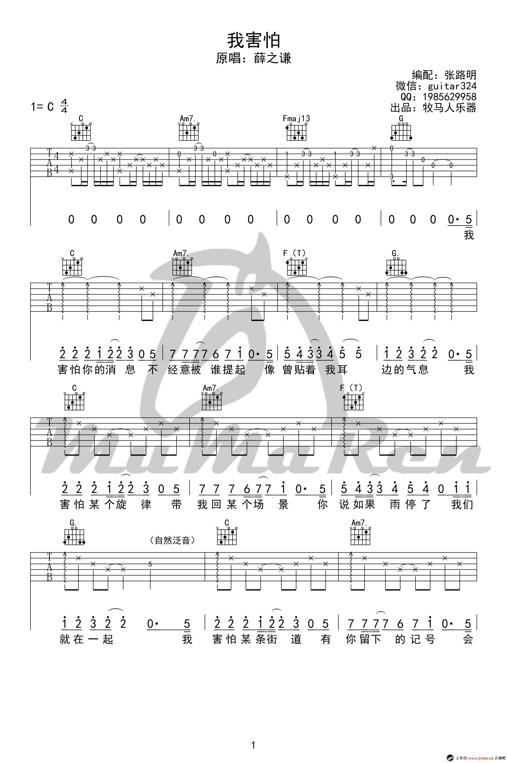 薛之谦《我害怕》吉他谱,C调弹唱谱,完整版四张图片谱。我害怕吉他六线谱,高清版本,感谢牧马人乐器编配出品,吉他吧网站为琴友们整理上传。 爱情的美好在于,能让相恋的两个人在一起无论做什么事都不觉得无聊,而这些在分手后又会像是印记一样刻在你的心里。哪怕时间已经过去了很久,还是会在某个瞬间让你一下子想起。爱情有遗憾也好,至少证明曾经的我们是真心的,哪怕最后我们无法再一次在一起,却会让彼此成为生命中美好的存在。