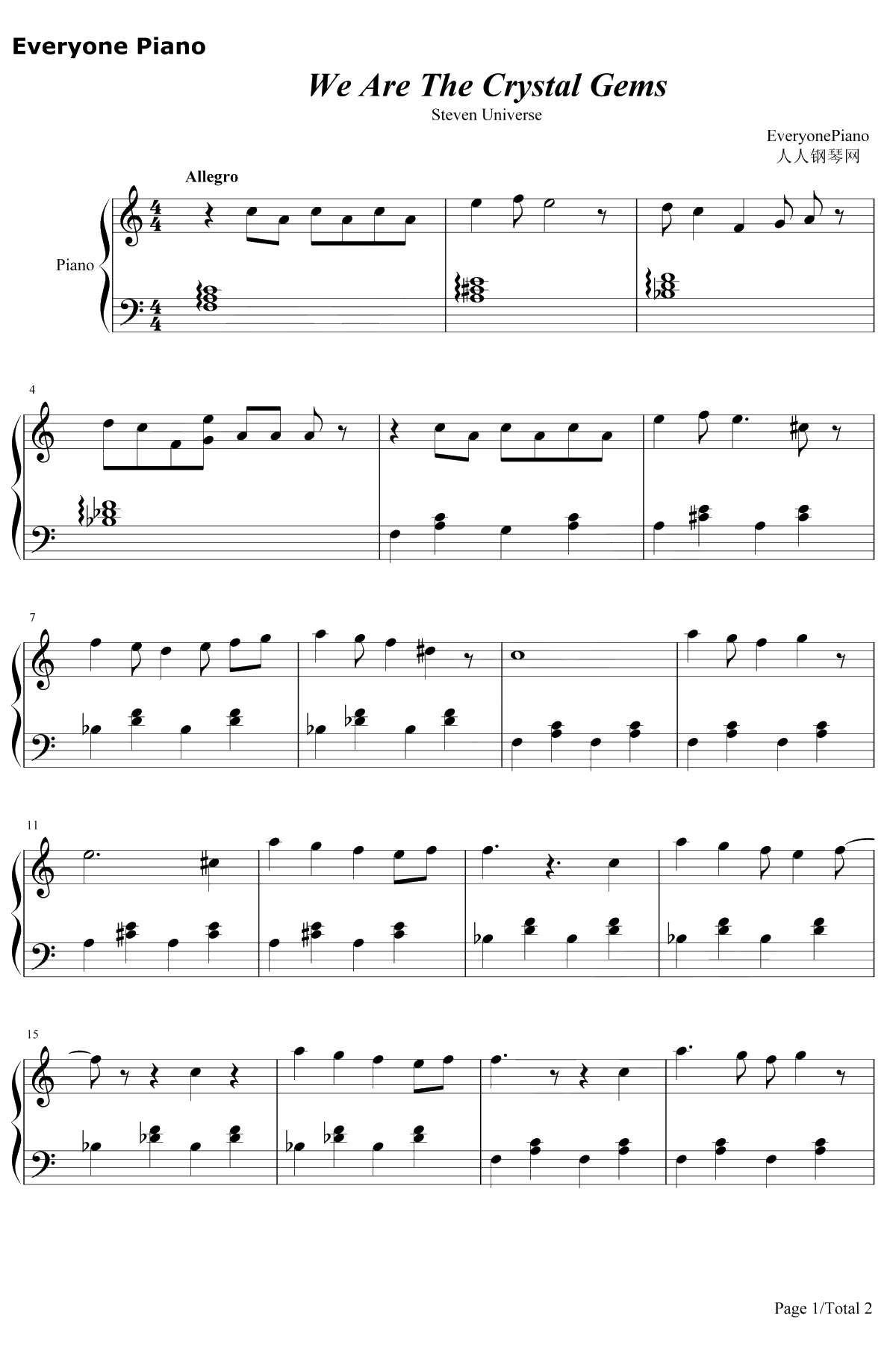 We Are The Crystal Gems双手简谱和五线谱完全对应。
