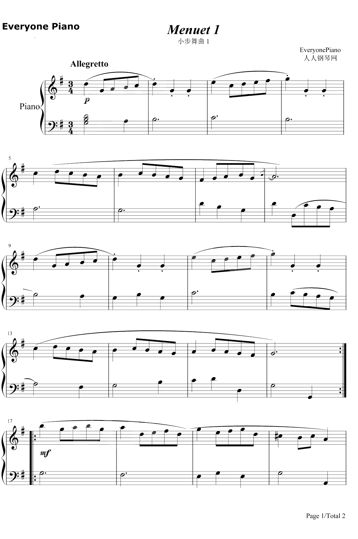 小步舞曲 1是作曲家巴赫的作品。小步舞曲(Minuet)一种起源于西欧民间的三拍子舞曲,流行于法国宫廷中,因其舞蹈的步子较小而得名。速度中庸,能描绘许多礼仪上的动态,风格典雅。十九世纪初,小步舞曲构成交响曲奏鸣套曲的第三乐章,后又被谐谑曲所代替。