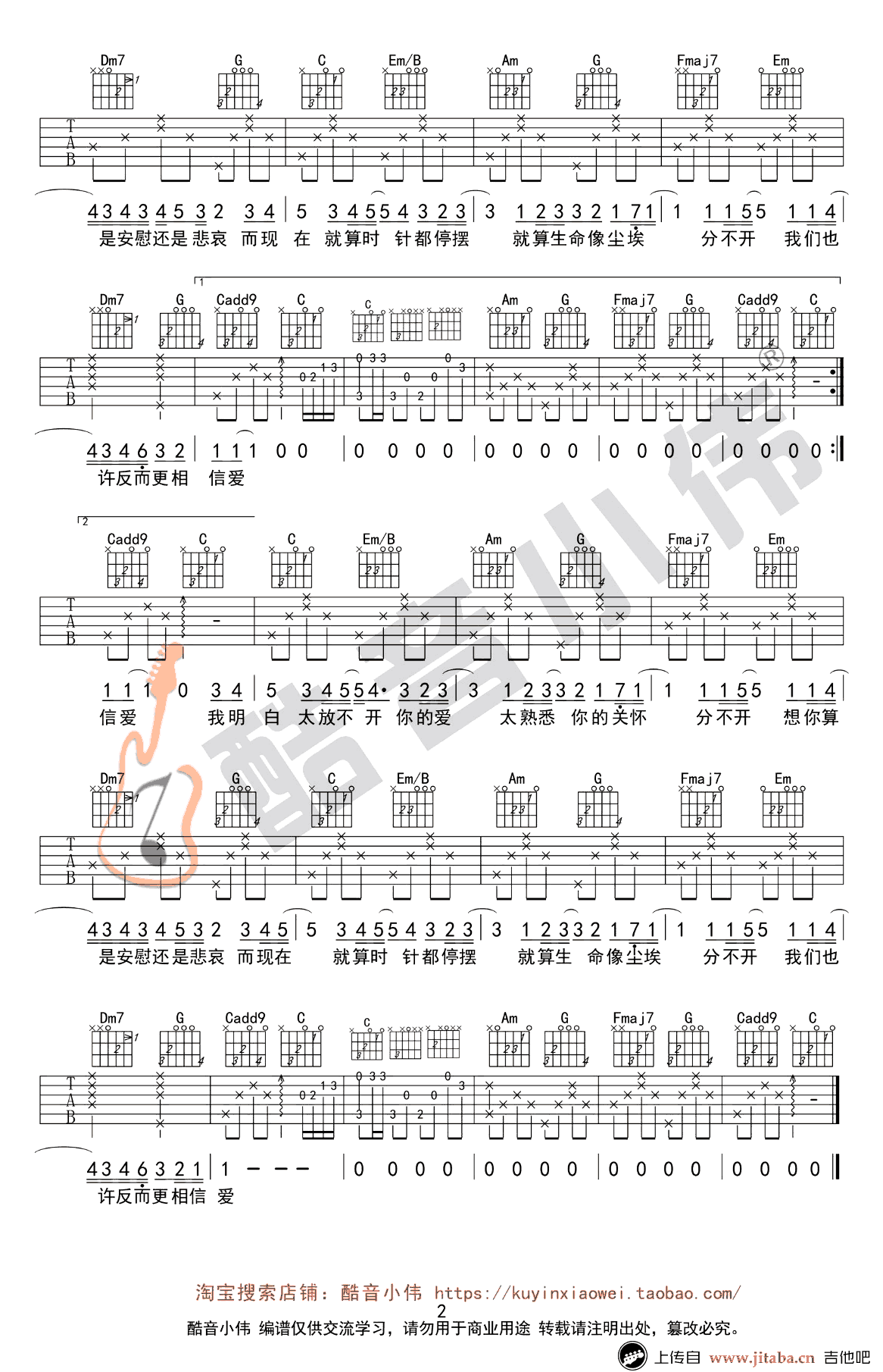 莫文蔚《忽然之间》C调简单版,男生5-7品,女生0-2品,忽然之间吉他六线谱,图片谱高清版。吉他的伴奏琴音,勾起对于往事的深深的回忆,莫文蔚的歌声细腻真挚。唱出在天昏地暗中对情感的珍惜与怀念。总是在忽然之间想起你,想起你笑的样子,想起你弹唱吉他的时候…… 感谢酷音小伟出品,吉他吧也为大家准备了G调弹唱谱和吉他教学视频,琴友们可以选择练习。