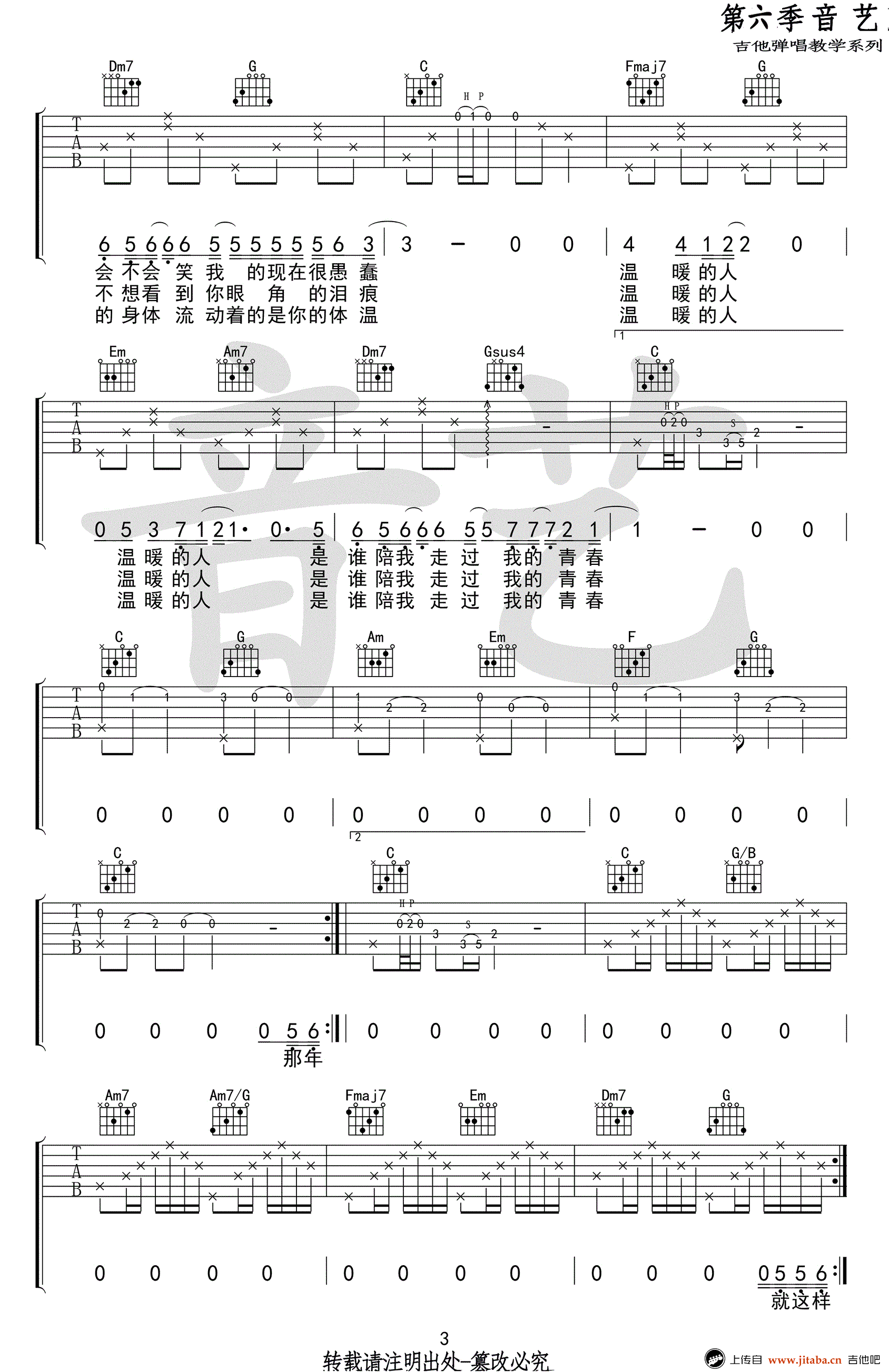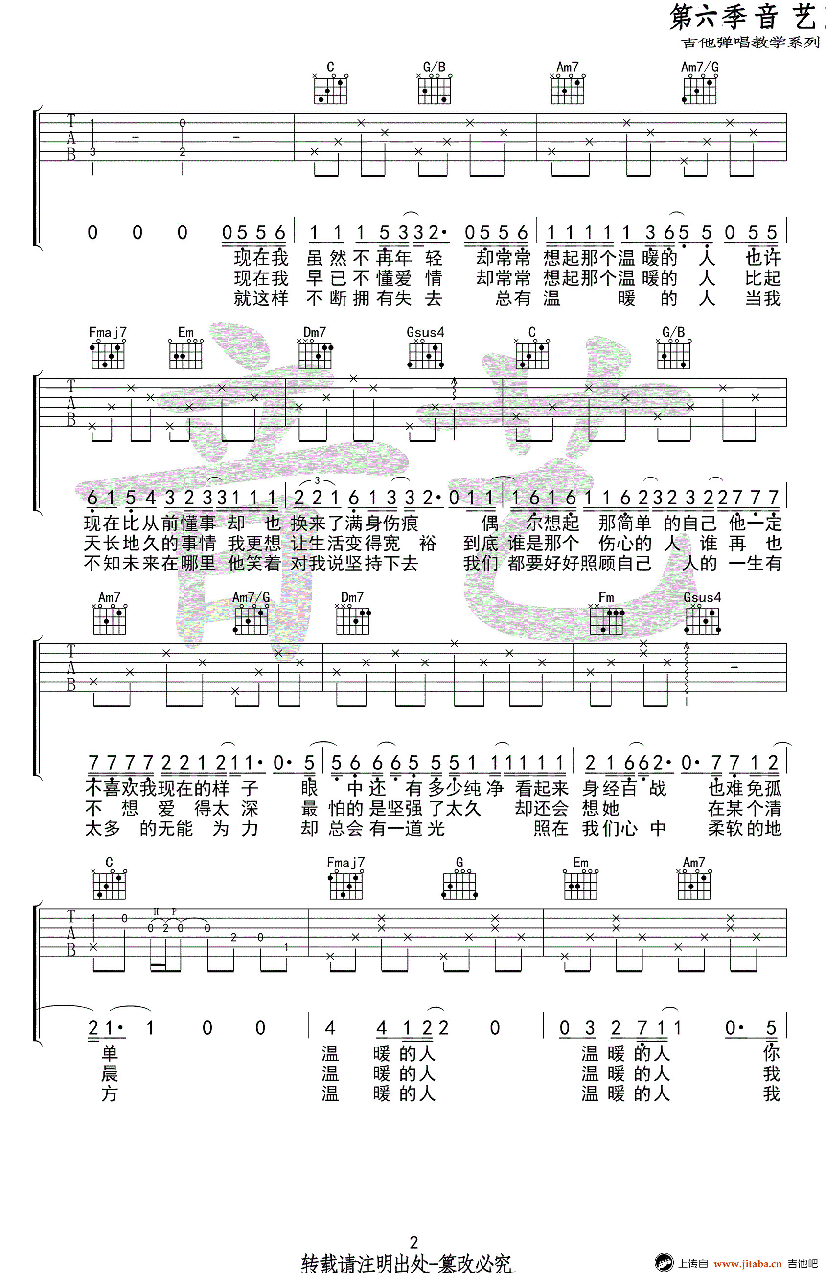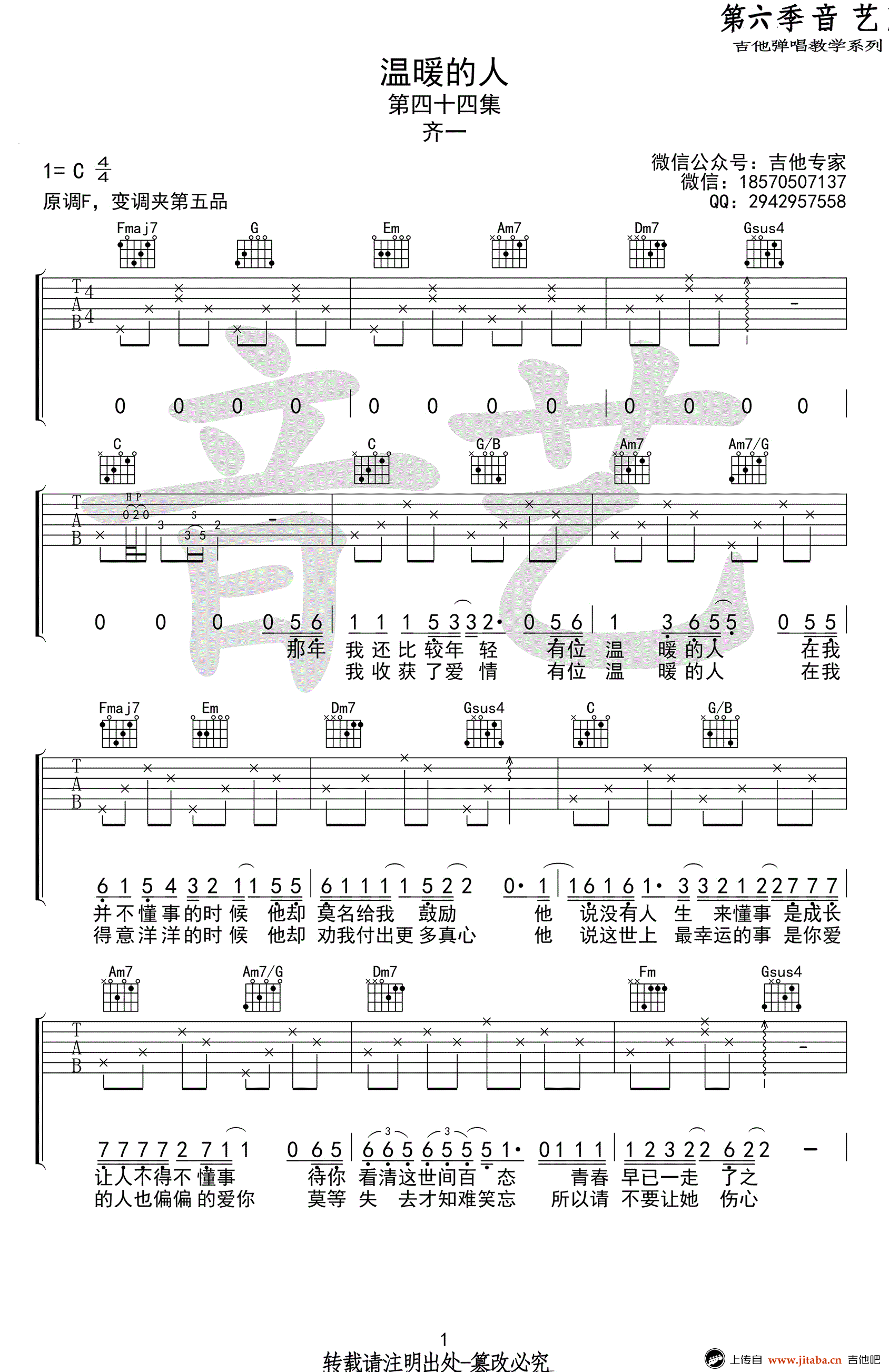 齐一《温暖的人》吉他谱,原调F,C调指法,变调夹夹五品。温暖的人六线谱,高清图片谱,完整版四张谱例。音艺吉他编配,吉他吧网站上传收藏。 我们总会在人生的路上遇到一些温暖的人,陪我们走过一段旅程,给我们鼓励和援手,如暖阳一样照亮我们前行的方向。一首温暖的人,送给大家。愿我们,也变成了那样的人,变成那个分享彼此人生感悟和传递正能量的那个温暖的人。
