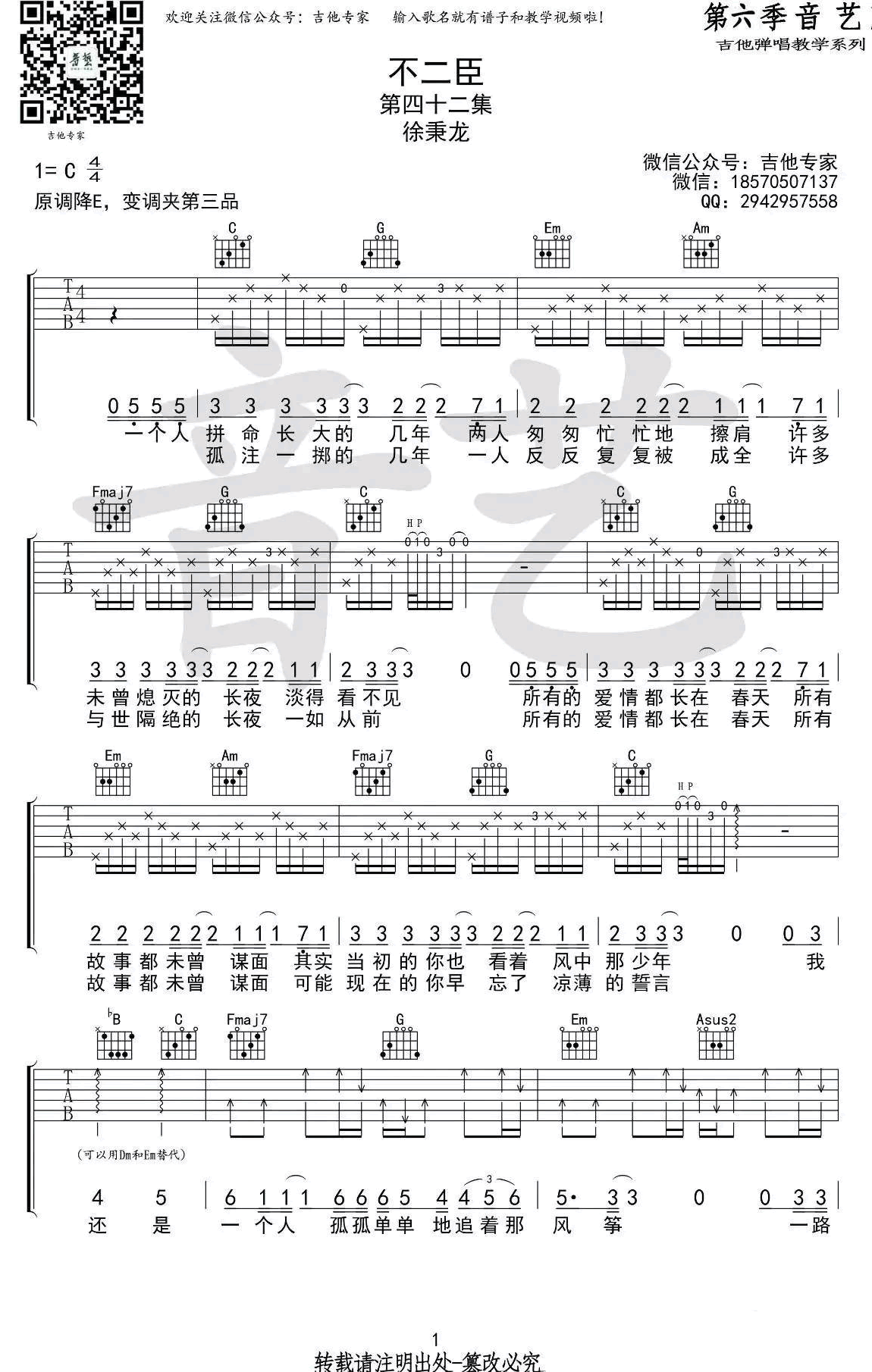 不二臣吉他谱,徐秉龙演唱,原调降E,变调夹夹三品,选用C调指法。不二臣六线谱,原版弹唱谱,共三张高清图片谱例。感谢音艺吉他出品,吉他吧网站推荐收藏。 一个00年的原创音乐人的作品,他独特的嗓音,阳光男孩的外表,清淡的吉他,无需炫技,我也想有这么一个人,轻轻的为我唱歌,我愿意做你的不二臣,你愿意吗?