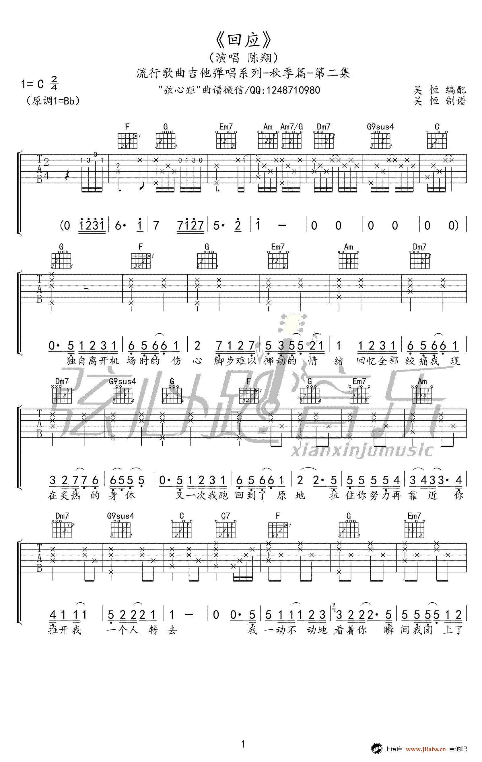 回应吉他谱,C调弹唱谱,陈翔演唱的一首好听的歌曲,收录于《初告白》专辑里面,回应六线谱,高清图片谱,三张谱例。感谢弦心距出品,吴恒编配制谱,吉他吧网站上传分享。 快男出道的歌手,很多已经淡出了舞台和视野,不过,有些动听的歌声,依然回应在我们的脑海。清澈的嗓音,感伤的旋律,在爱情难以继续的时候,一个人离开的心碎场景……