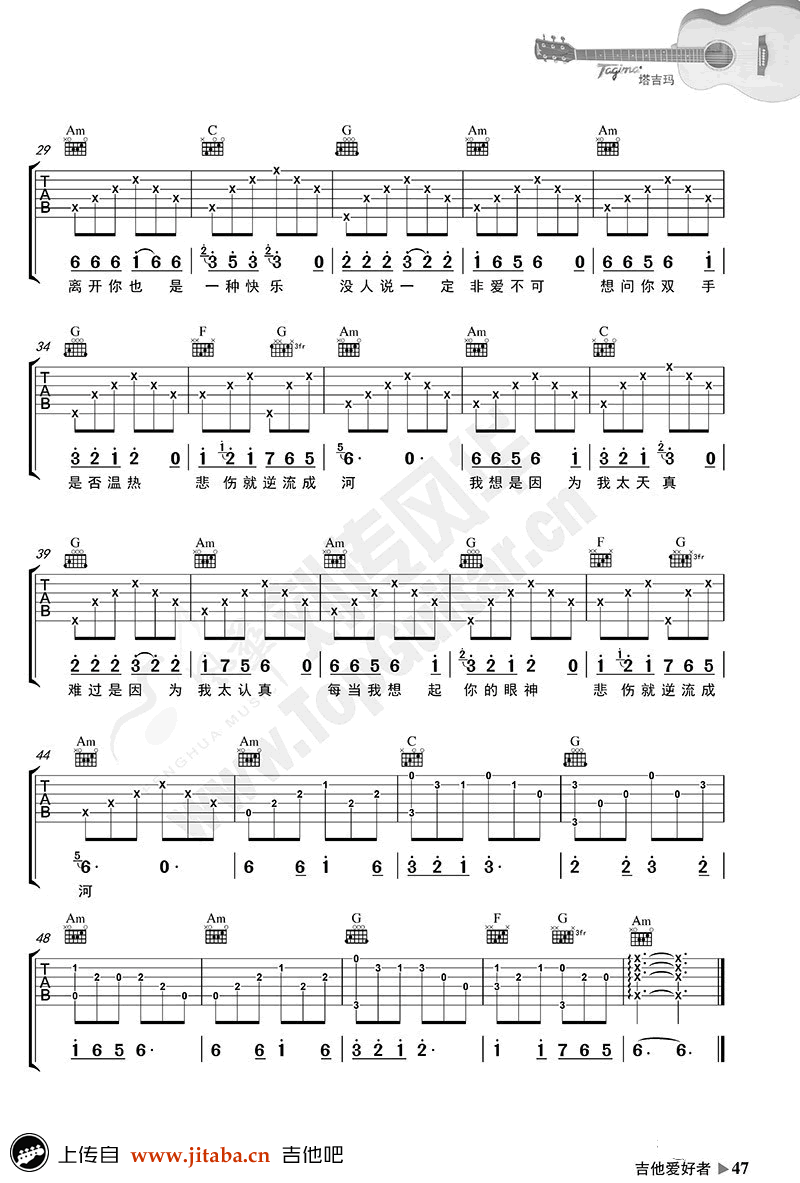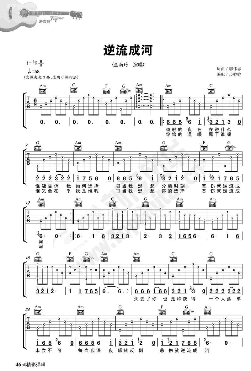 金南玲《逆流成河》吉他谱,原调降E,变调夹夹3品,选用C调指法,逆流成河六线谱,两张图片谱例,感谢步婷婷编配,曲谱收录于《吉他爱好者》中,吉他吧网站推荐分享。 寂静的时候,听着歌,感受着忧伤的旋律,忧伤点点堆积,逆流成河。仿佛看到另一个灵魂心碎的悲伤,但更多的是倔强和不屈。梦境是美好的,强悍的却永远是命运,但我们总是倔强而不屈的在命运之中点缀上属于自己的美好,创造着属于自己的天堂。