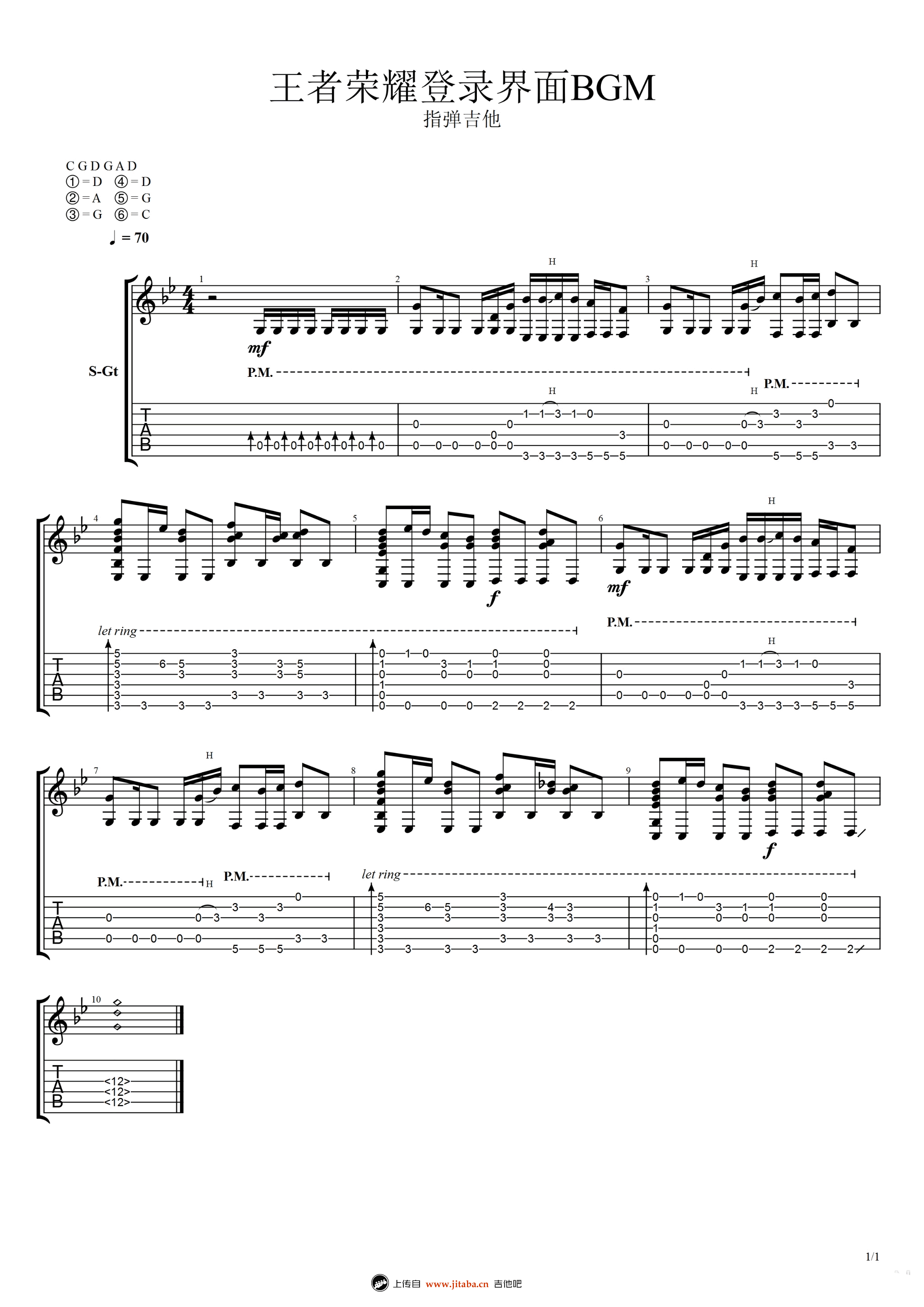 王者荣耀指弹吉他谱,曲谱改编自热门手游《王者荣耀》登录界面的BGM,王者荣耀背景音乐指弹吉他独奏谱,图片谱高清版。王者荣耀这款游戏有一个很大的吸引人的地方,就是和全球一流的音乐家合作,创作出一系列动听的背景音乐。 如今游戏的音乐总是让人印象深刻,甚或成为经典。大厅开场曲、主旋律音乐、选角背景配乐,每一场次的BGM也都各有专属,烘托气氛,将玩家带入相应情境。