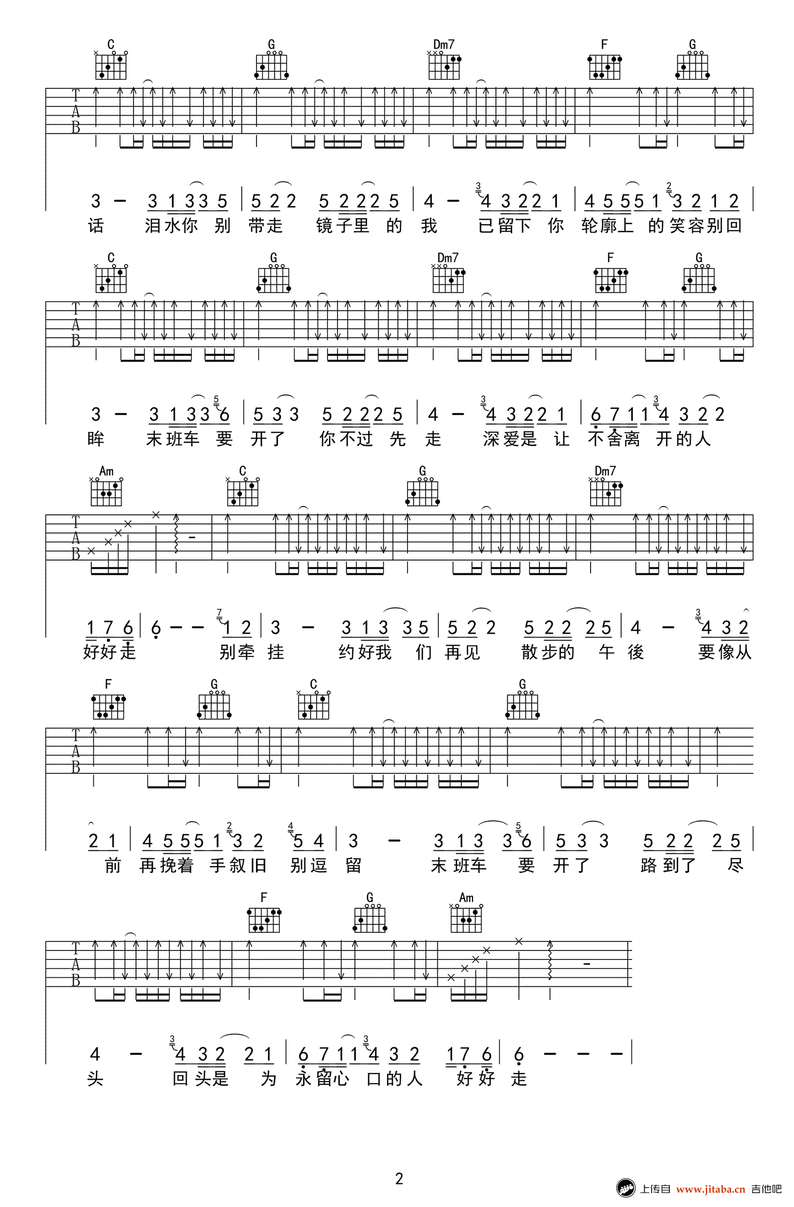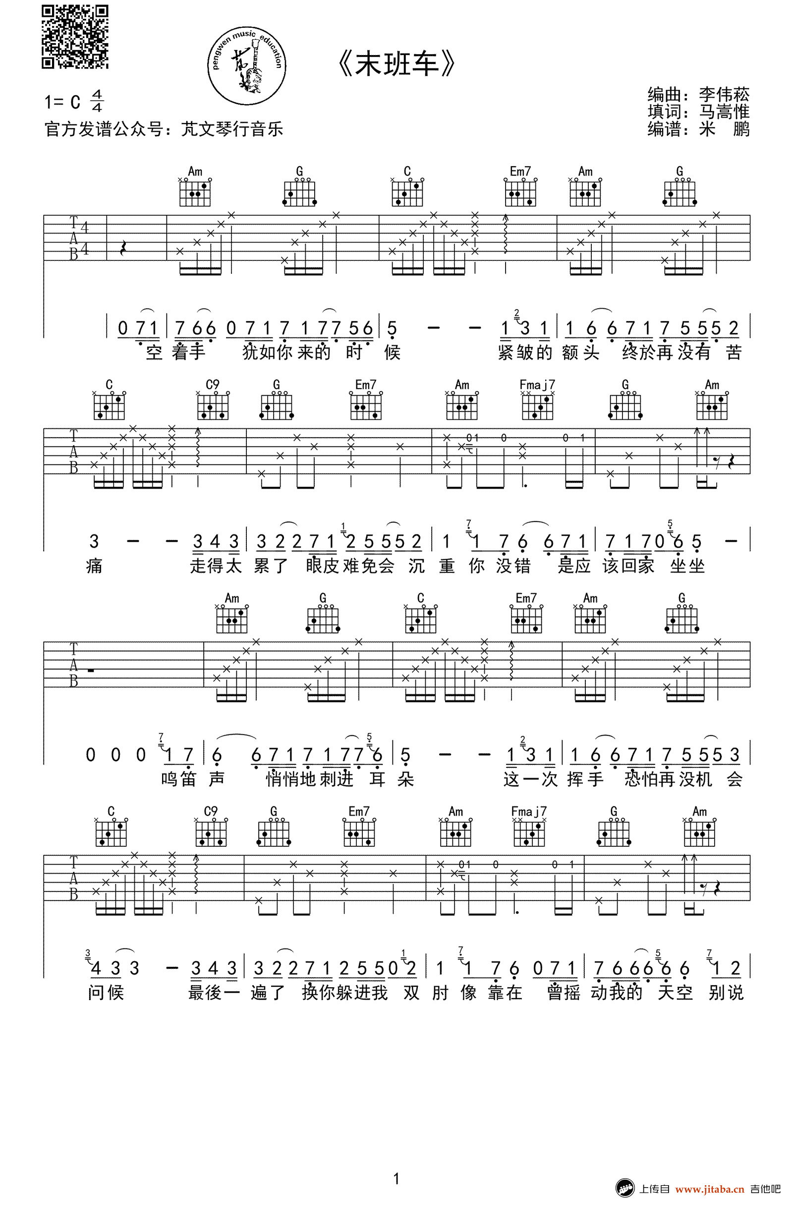 末班车吉他谱,台湾盲人歌手萧煌奇的代表作品,末班车六线谱,C调指法,歌曲简析:本首歌曲以林俊杰的演唱版本为基础,加入编者自己的灵感编写,适合初学以及初学以上琴友。 《梦想的声音》上金曲歌王林俊杰改编的来自萧煌奇的《末班车》,加入了中国风的笛子与古筝。吹笛子的姑娘就是唱功越来越好的叶炫清。