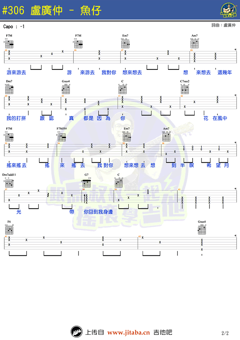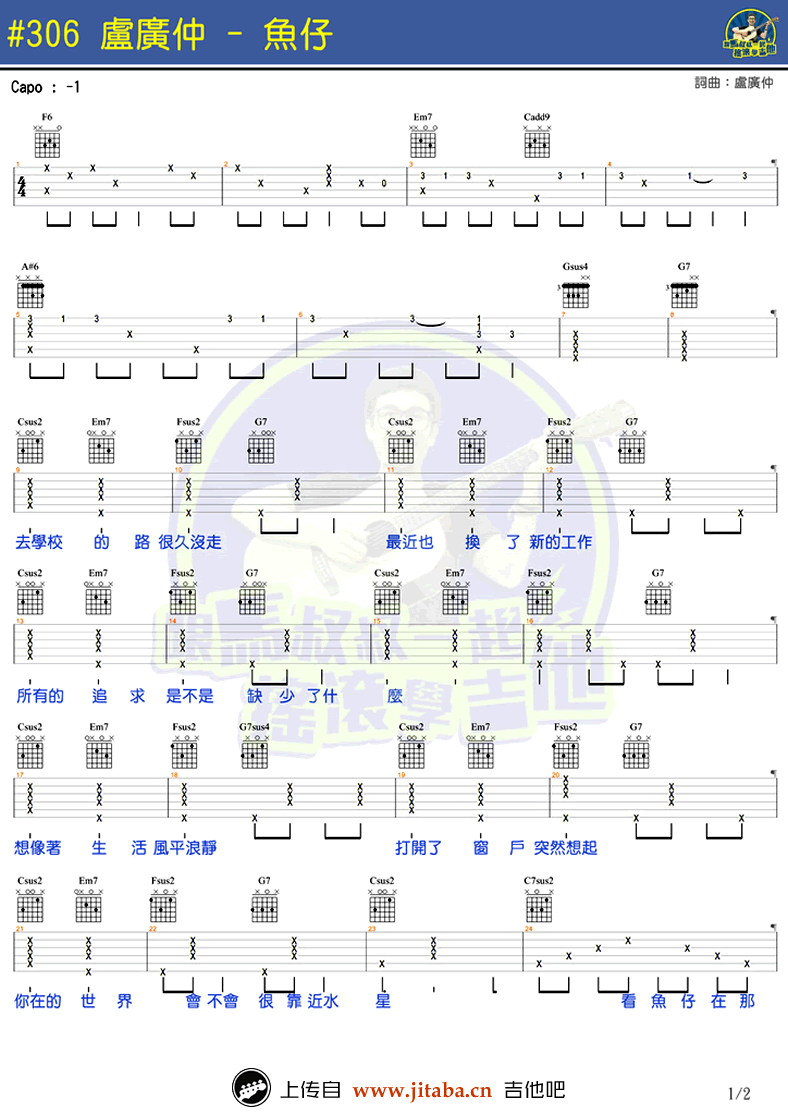 卢广仲《鱼仔》吉他谱,马叔叔吉他教室编配。花甲男孩转大人主题曲,鱼仔六线谱,图片谱格式。吉他吧网站为琴友们上传分享。 如果我也变成一条鱼,如果你也变成了氧气。卢广仲这首新歌《鱼仔》热度很高,闽南语和国语的结合。期待马叔叔很快将歌曲的弹唱教学视频录制完成。