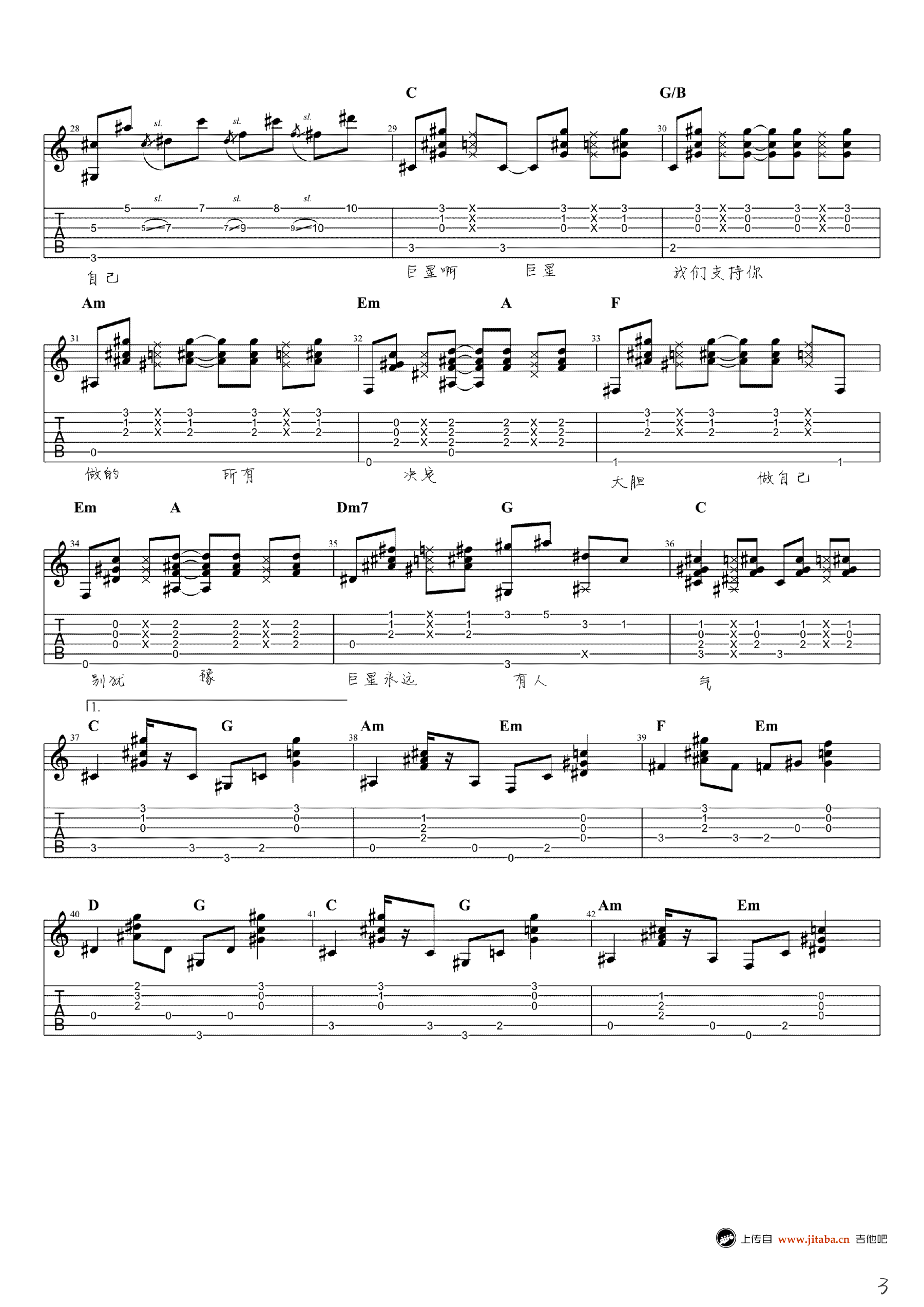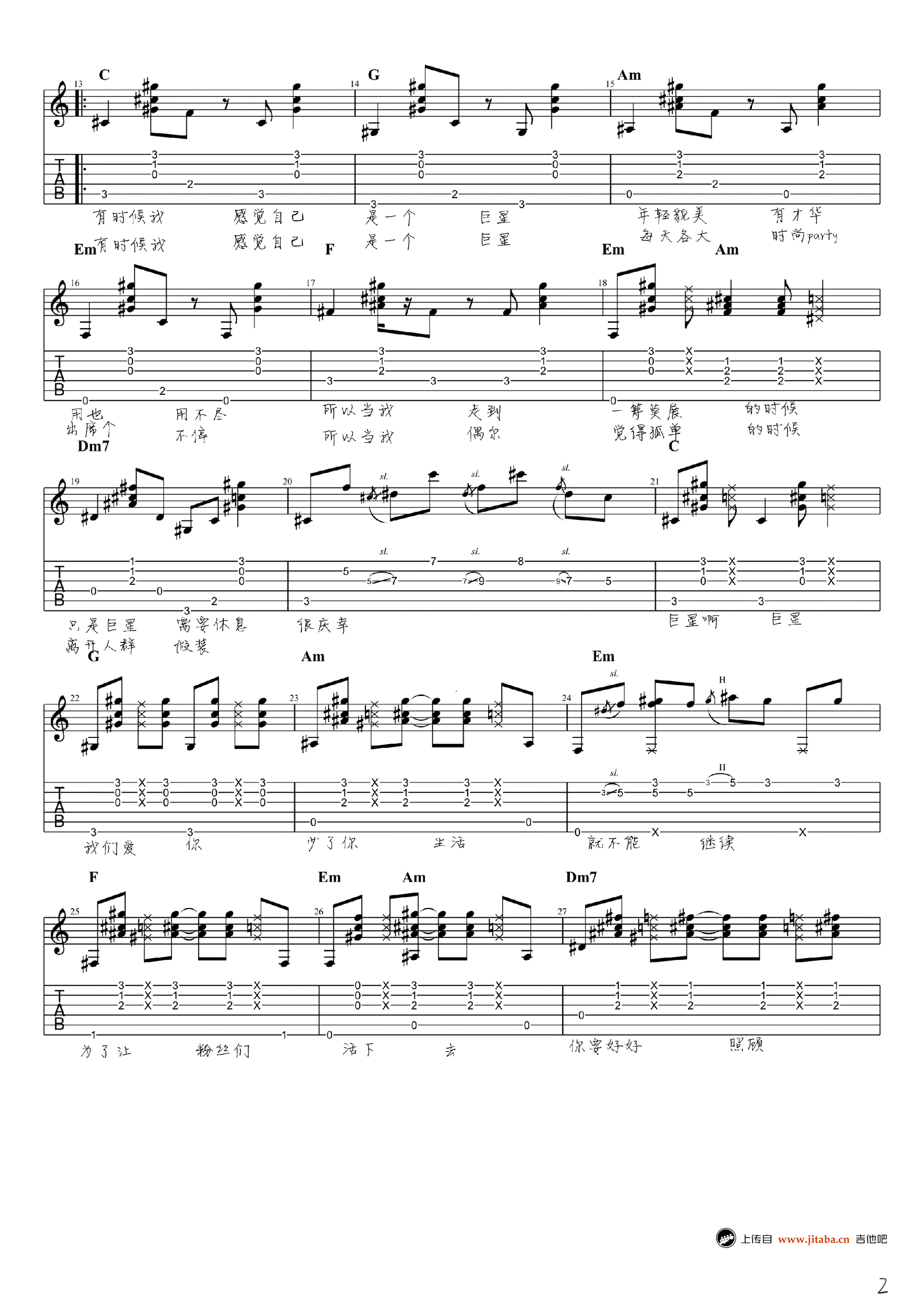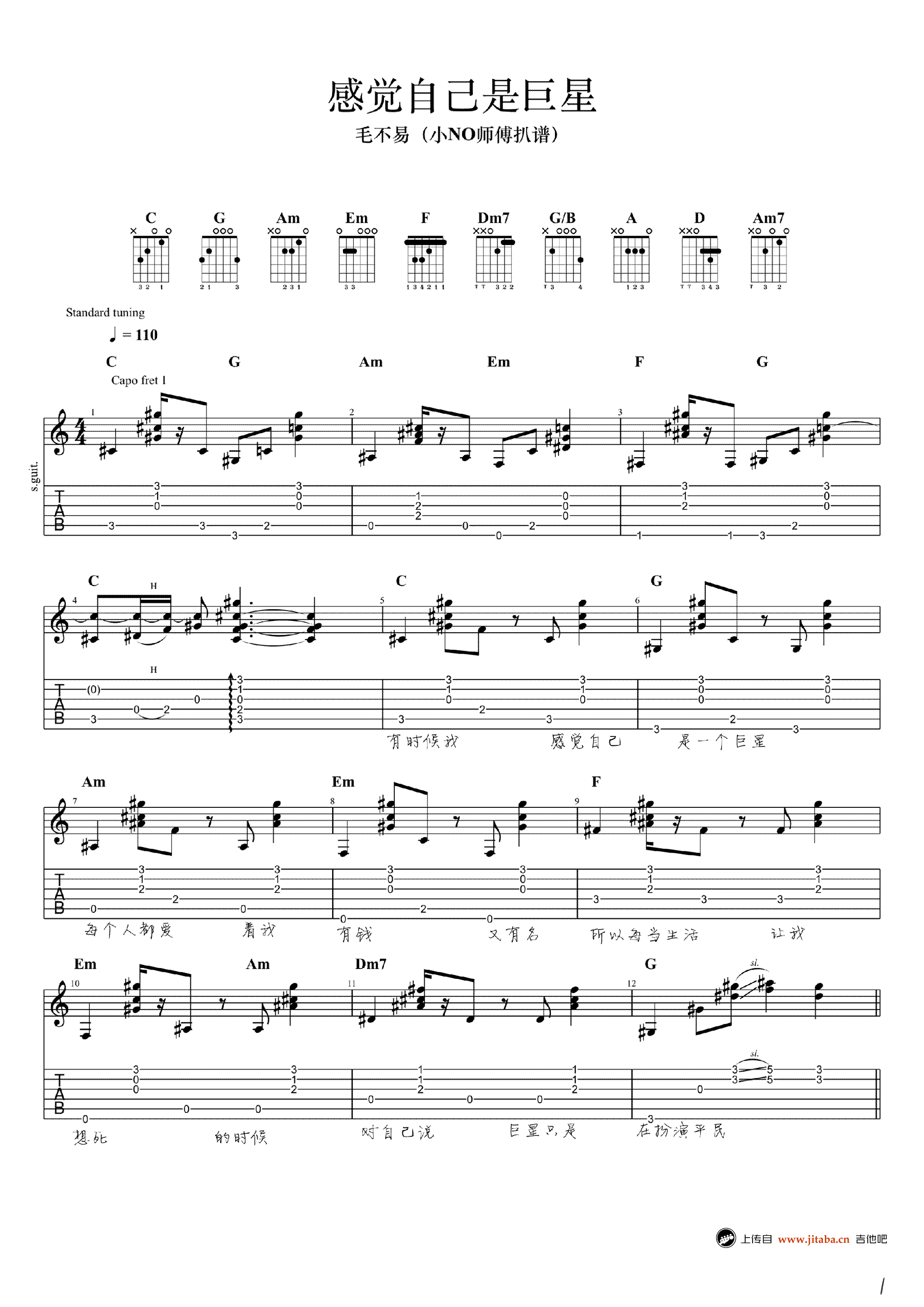 毛不易《感觉自己是巨星》吉他谱,高清弹唱谱,《明日之子》节目,毛不易的原创民谣歌曲,感觉自己是巨星六线谱,完整版四张图片谱例。感谢小NO师傅扒谱,吉他吧网站整理上传。 毛不易极具个人特色的原创音乐,一把吉他,直白的歌词、极简的旋律,就能在立刻直戳人心。每个人都爱幻想,幻想自己一身才华有朝一日成为万世巨星,备受追捧大放异彩……但是,让幻想照进现实才是理想。在浮躁的生活里,毛不易显得别具一格,只要他拿起吉他、开始吹起他那熟悉的口哨声时,就会感受到他的与众不同。