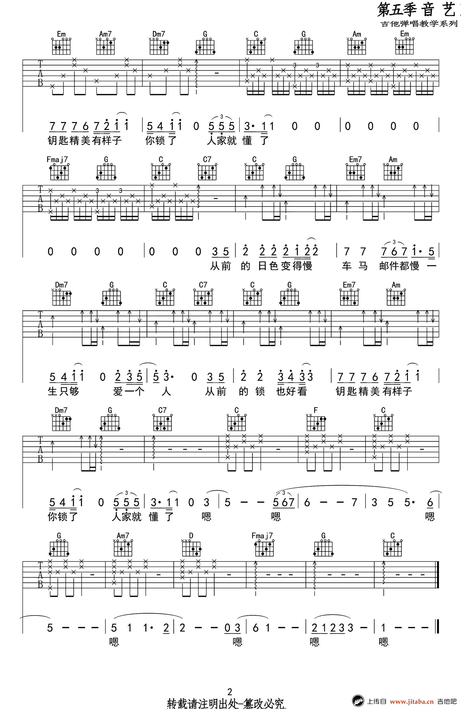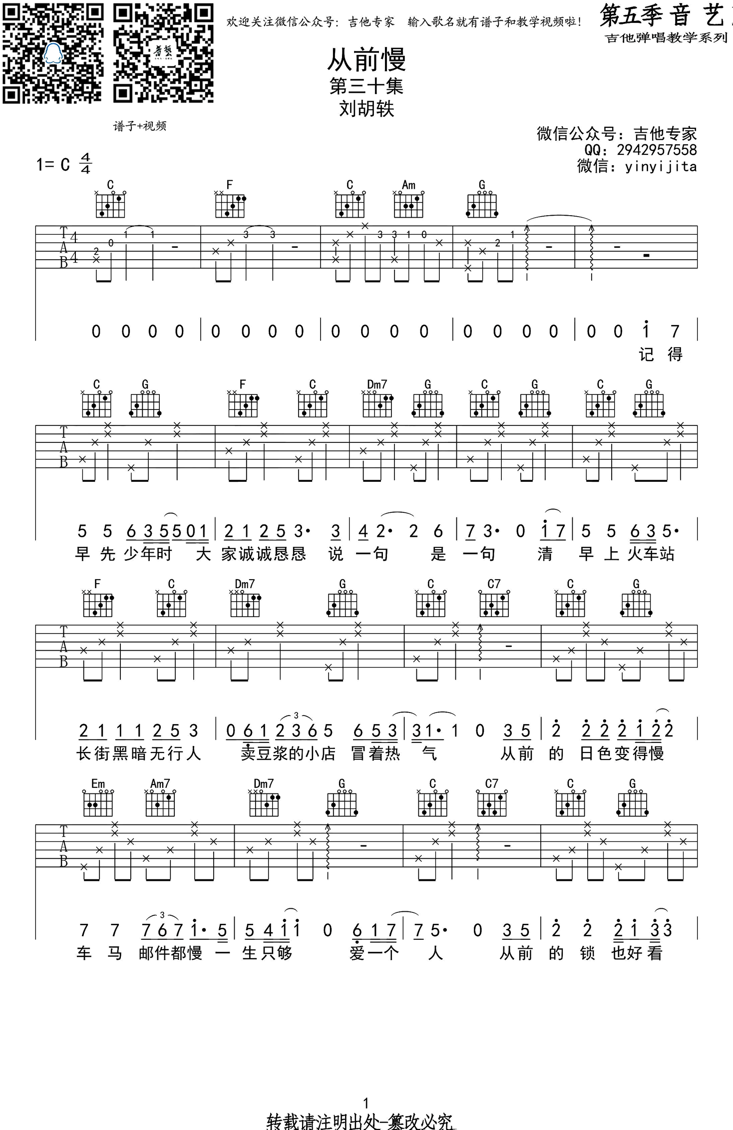 从前慢吉他谱,C调简单版,适合吉他弹唱,从前慢六线谱,高清图片谱,中国好歌曲刘胡轶的原创作品。新一季《中国新歌声》节目开播,19岁学员叶炫清仿佛炎夏的一阵清风,凭借《从前慢》的精彩的演唱,得到四位导师肯定。 本曲谱为音艺吉他编配改编,琴友们在节奏上可随意一些,不必把节奏弹得那么稳,按照自己的习惯和感觉来,关键是注意情感的把握。