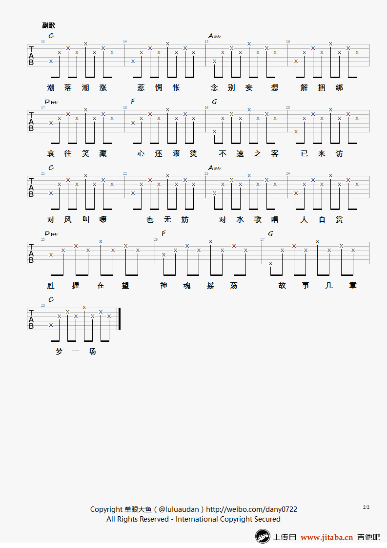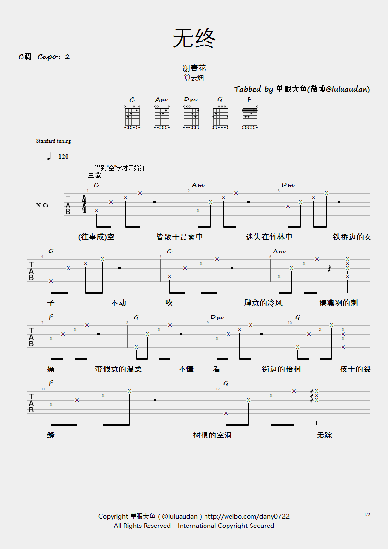 无终吉他谱,谢春花演唱的一首民谣歌曲,无终六线谱,C调指法,CAPO夹二品,两张图片谱。感谢单眼大鱼编配分享,吉他吧上传推荐。 词如其人忽而沉静忽而诗意,曲如其人忽而爽朗忽而明媚,谢春花唱出了这个年纪的多愁善感,用自己最擅长和喜爱的笔触,去接近自己的内心,进而靠近每个人的心灵。
