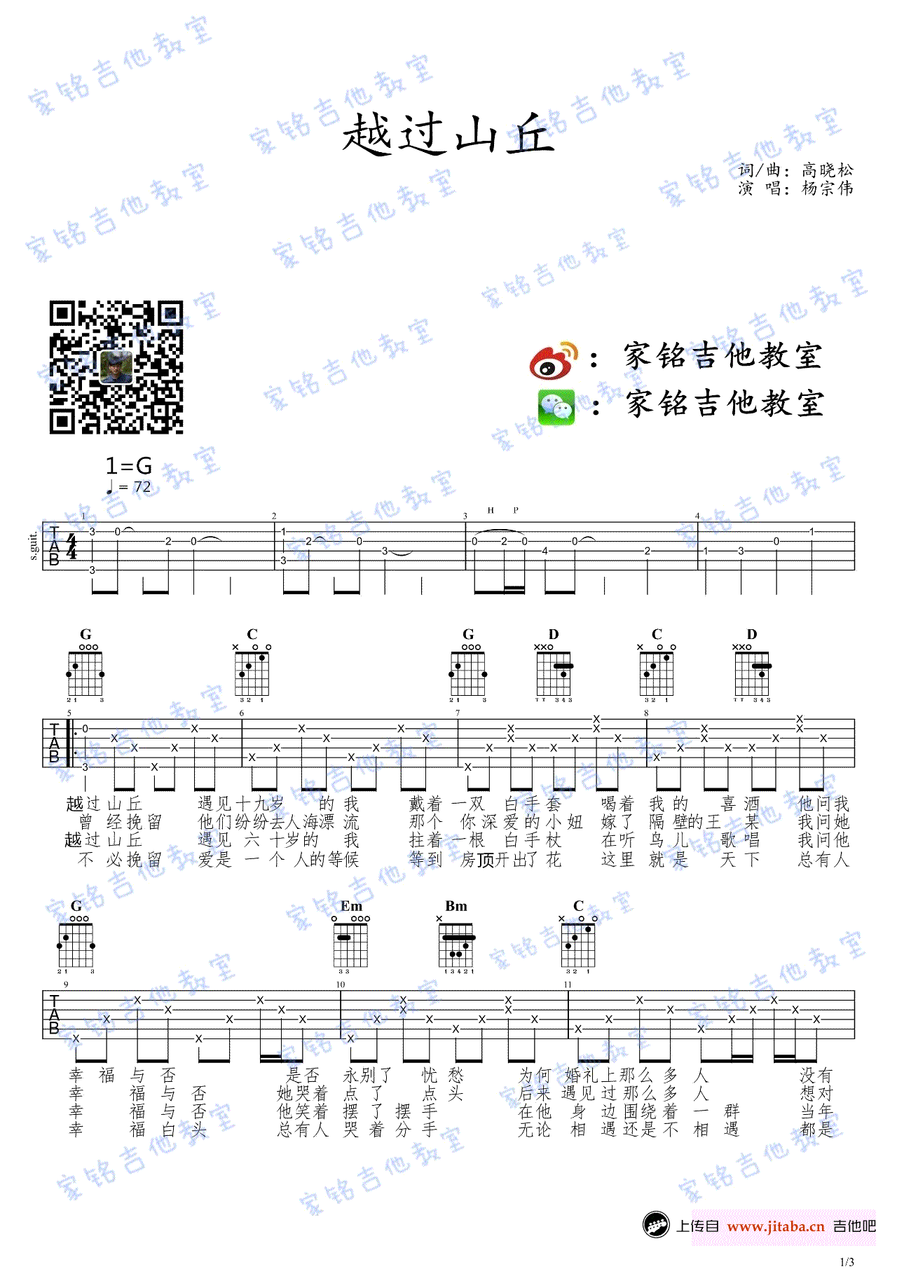 越过山丘吉他谱,杨宗纬演唱,越过山丘六线谱,G调指法,高清弹唱图片谱,三张谱例。这是高晓松词曲的一首歌曲,是音乐人对前辈李宗盛最诚恳而单纯的致敬,相同的山丘和忧愁,不一样的人生况味。感谢家铭吉他编配,吉他吧网站上传分享。 杨宗纬用简单的方式,直抒胸臆,赋予了这首歌光阴怀恋的灵魂。从歌声中仿佛听到了过去的忧伤,未来的美好以及对现在的领悟。