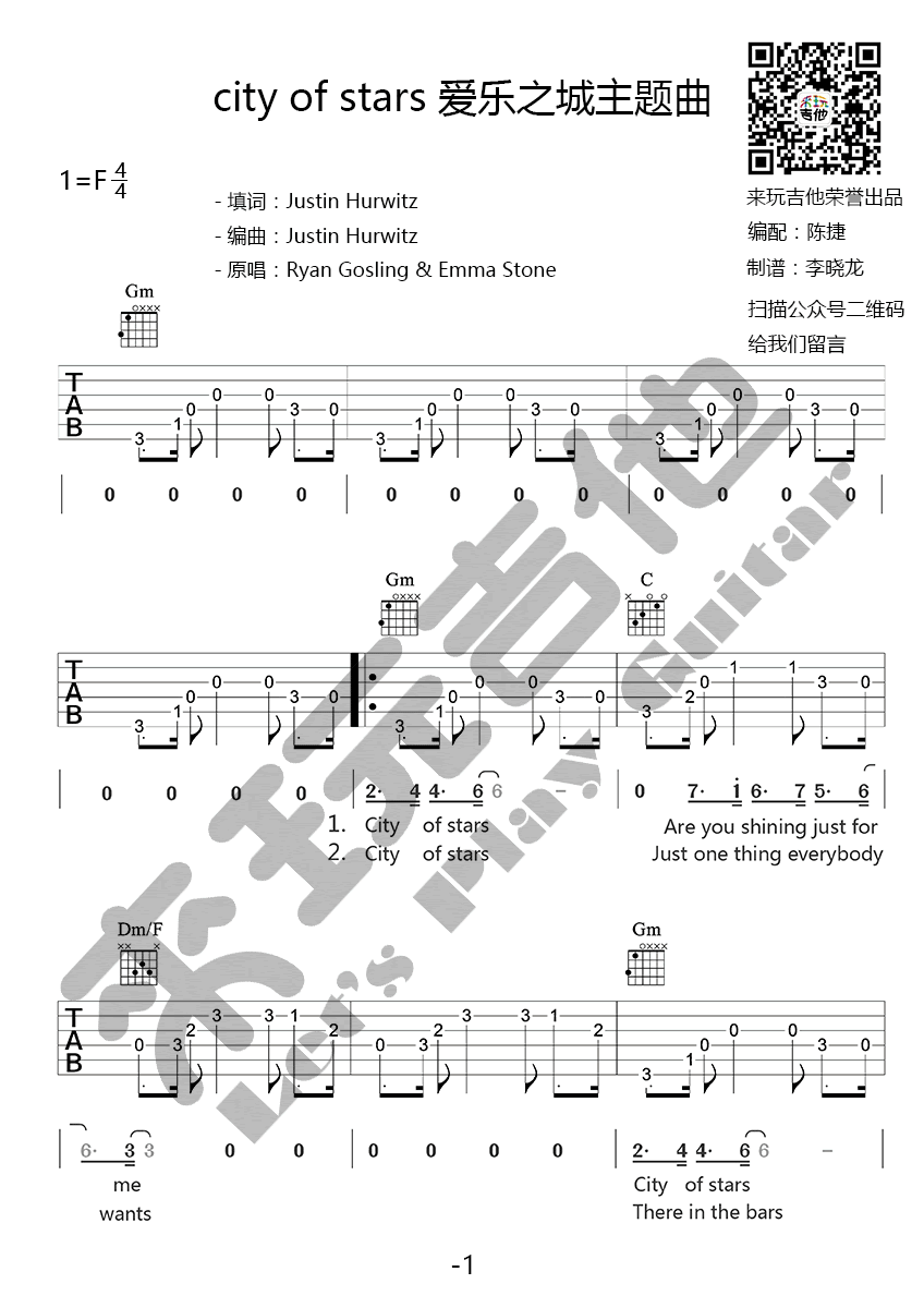 city of stars吉他谱,爱乐之城主题曲,轻浅歌声婉转动听,LA LA LAND《City of Stars》六线谱,原版吉他谱,感谢来玩吉他出品,吉他吧网站为喜欢英文歌曲的琴友们上传分享。 繁星之城,为谁闪耀?满世繁华我应接不暇,谁又知道这是美好的最初,或是又一个无法成真的美梦。谢谢电影给了我们一场好梦,把所有私密的情感回忆都放在梦里。而醒来,仍然得独自前行。