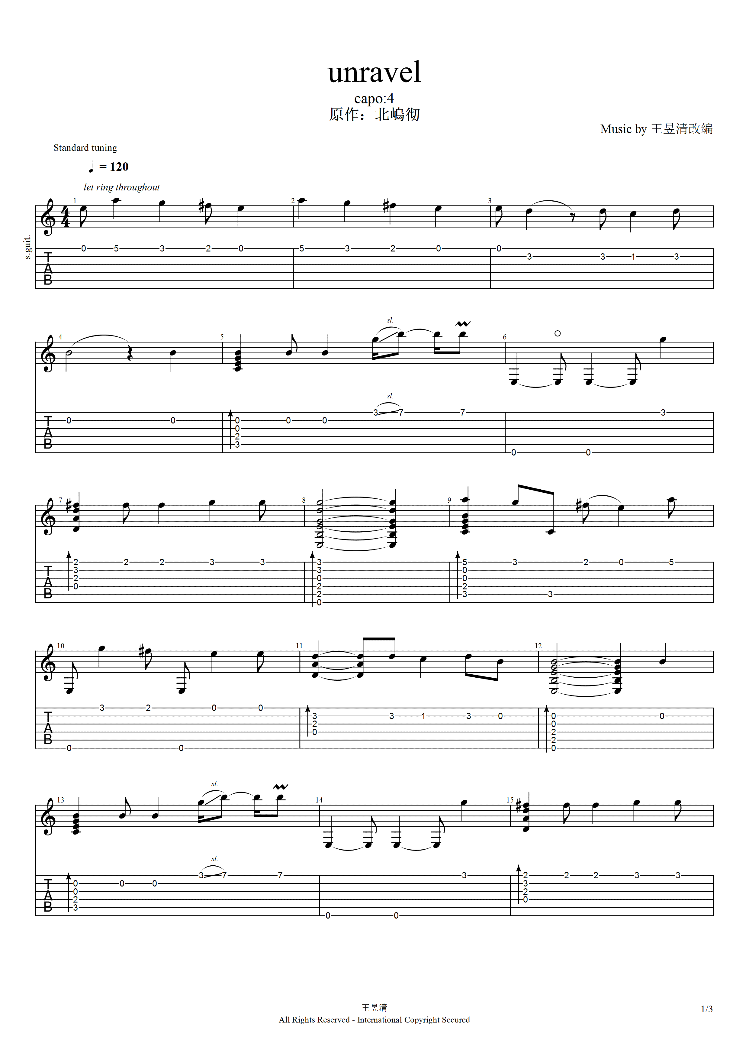 《unravel》吉他谱指弹版,改编自动画《东京食尸鬼/东京喰种》的主题曲,是日本音乐人TK北嶋彻词曲创作的。unravel吉他独奏谱,变调夹夹四品,高清图片谱共三张谱例,感谢王昱清编配六线谱,吉他吧网站上传推荐。