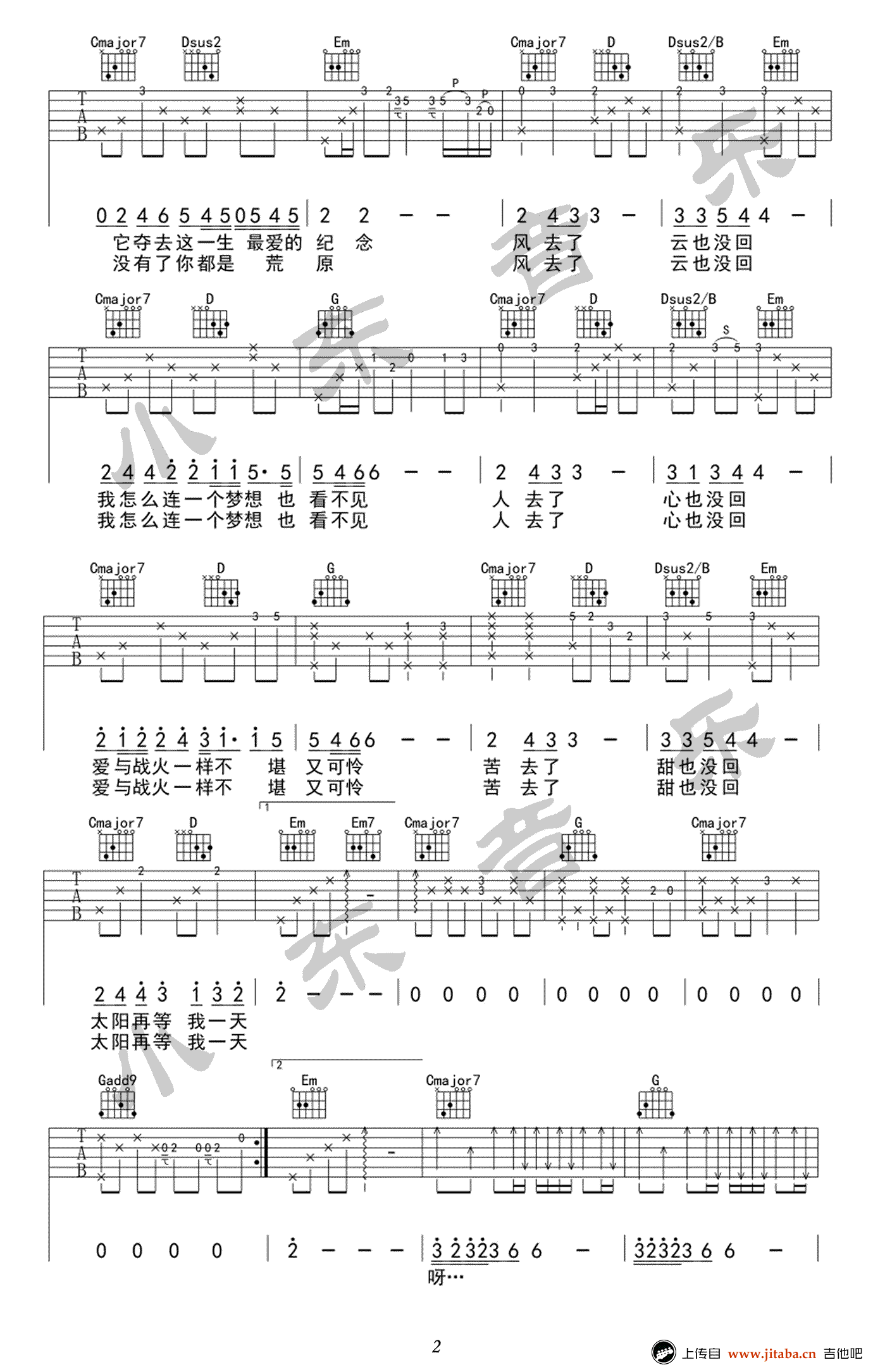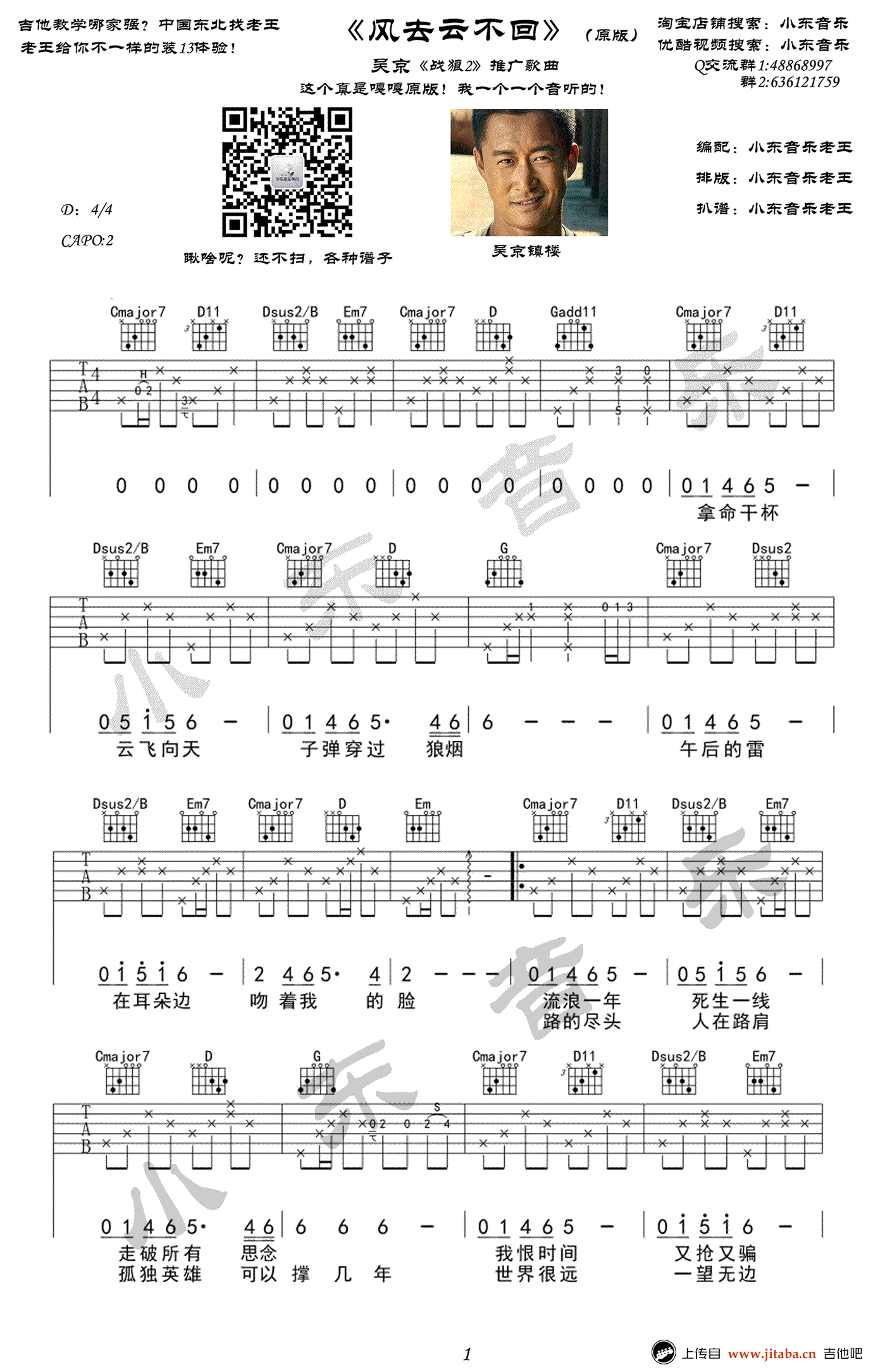 风去云不回吉他谱,吴京《战狼2》推广主题曲,风去云不回六线谱,高清弹唱谱,三张图片谱。感谢小东音乐原版编配,吉他吧网站上传。 这是一曲男主角的内心独白,一个铁血的男人也有如此柔情的一面,吴京温柔演绎冷锋与龙小云的战地恋曲,深情眷恋意境清澈而悠远。