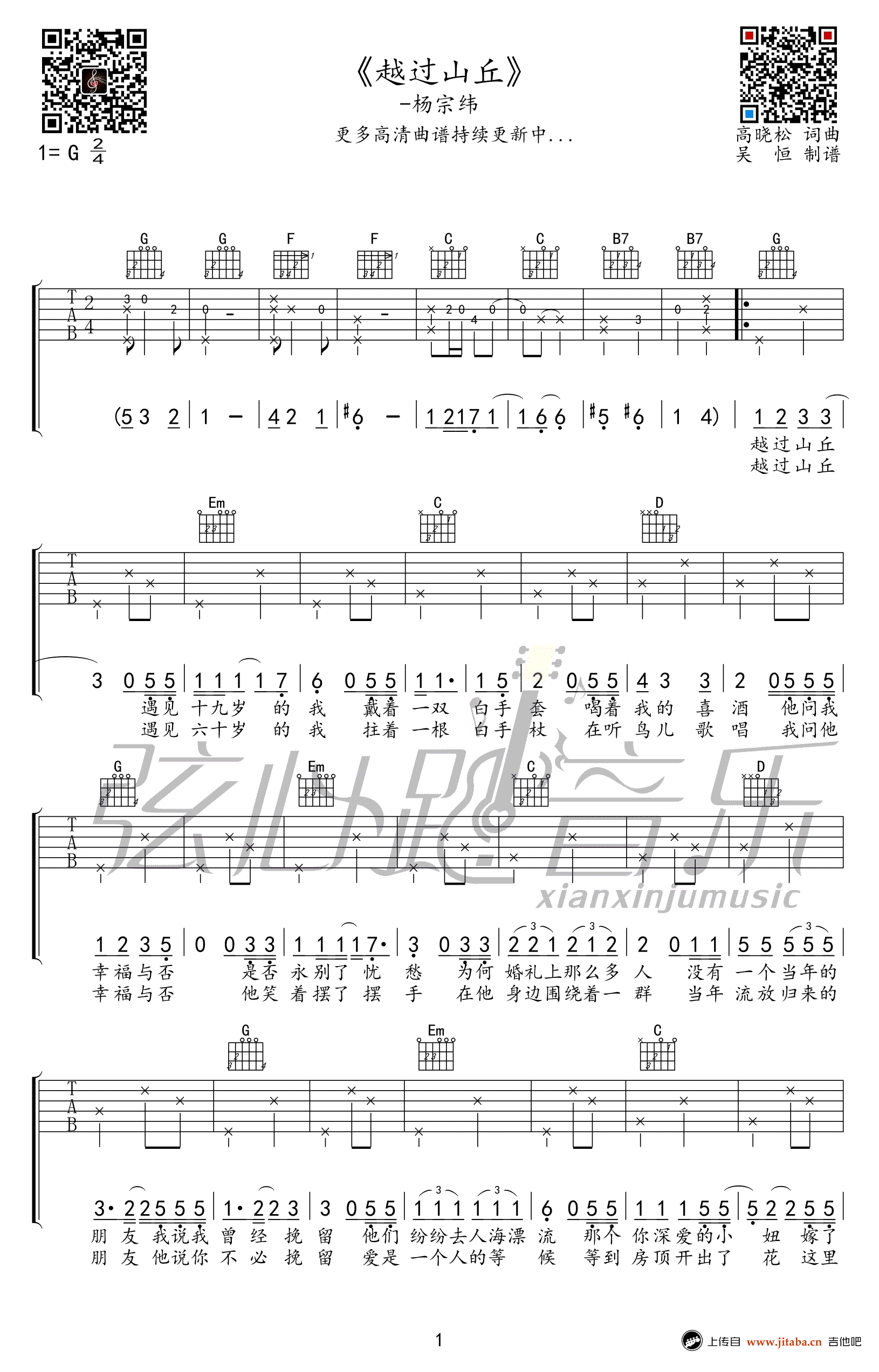 越过山丘吉他谱,杨宗纬演唱,高晓松一首致敬李宗盛的歌曲,越过山丘吉他弹唱谱,G调指法,高清图片六线谱。感谢弦心距出品,吉他吧网站推荐。 年少时候,总以为攀越山丘就是功成名就,付出很多,失去更多。老来才明白,即便翻越了那无数山丘,也不过如此,不会有理想的成就在那。似乎,一切的奋斗努力突然没了意义,所有的苦难都只是苦难。终于有一天会突然发现,原来山丘本身就是越过山丘的奖励。那些累积的故事,那些感悟过的人生,就是最好的收获。