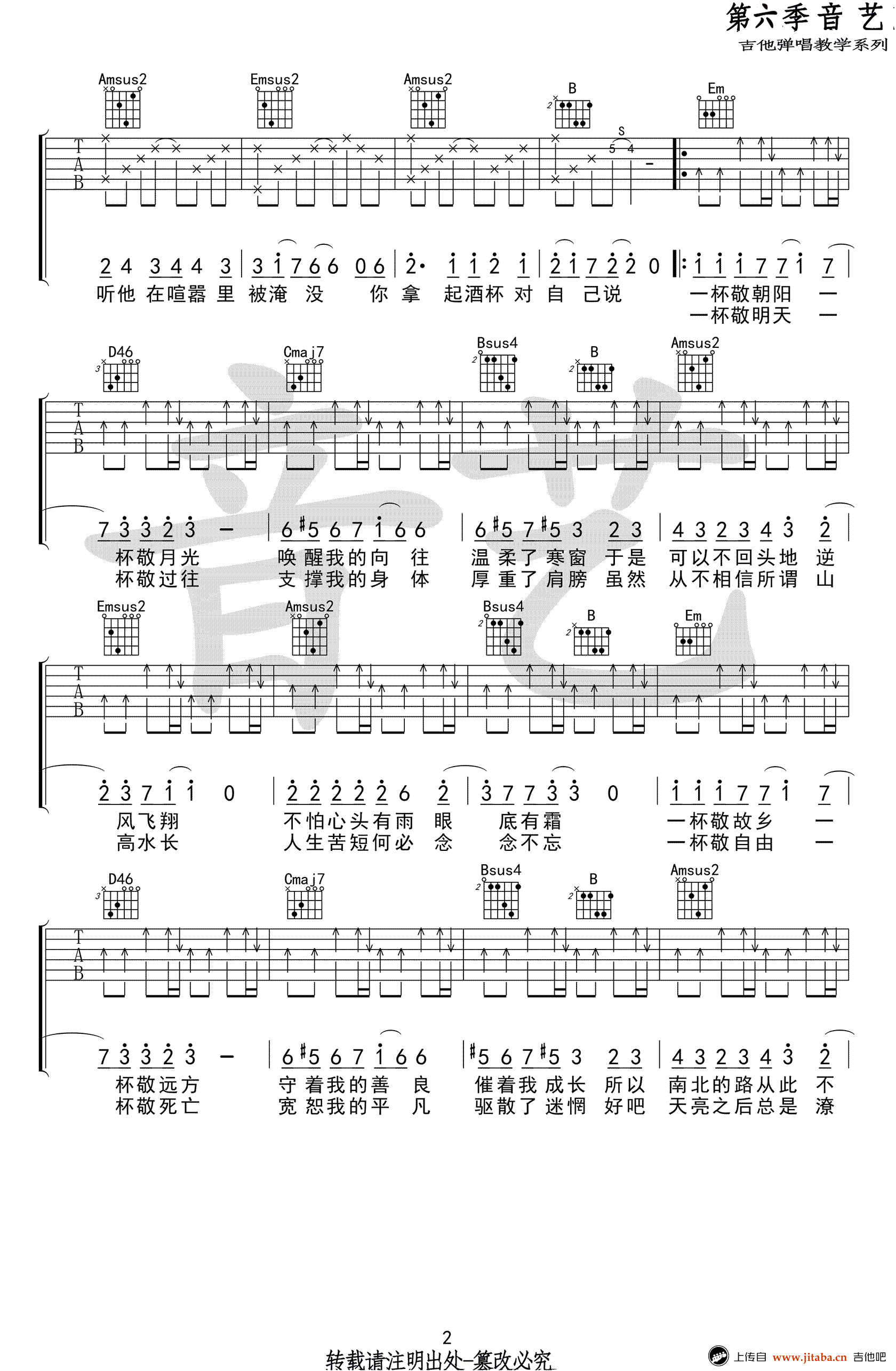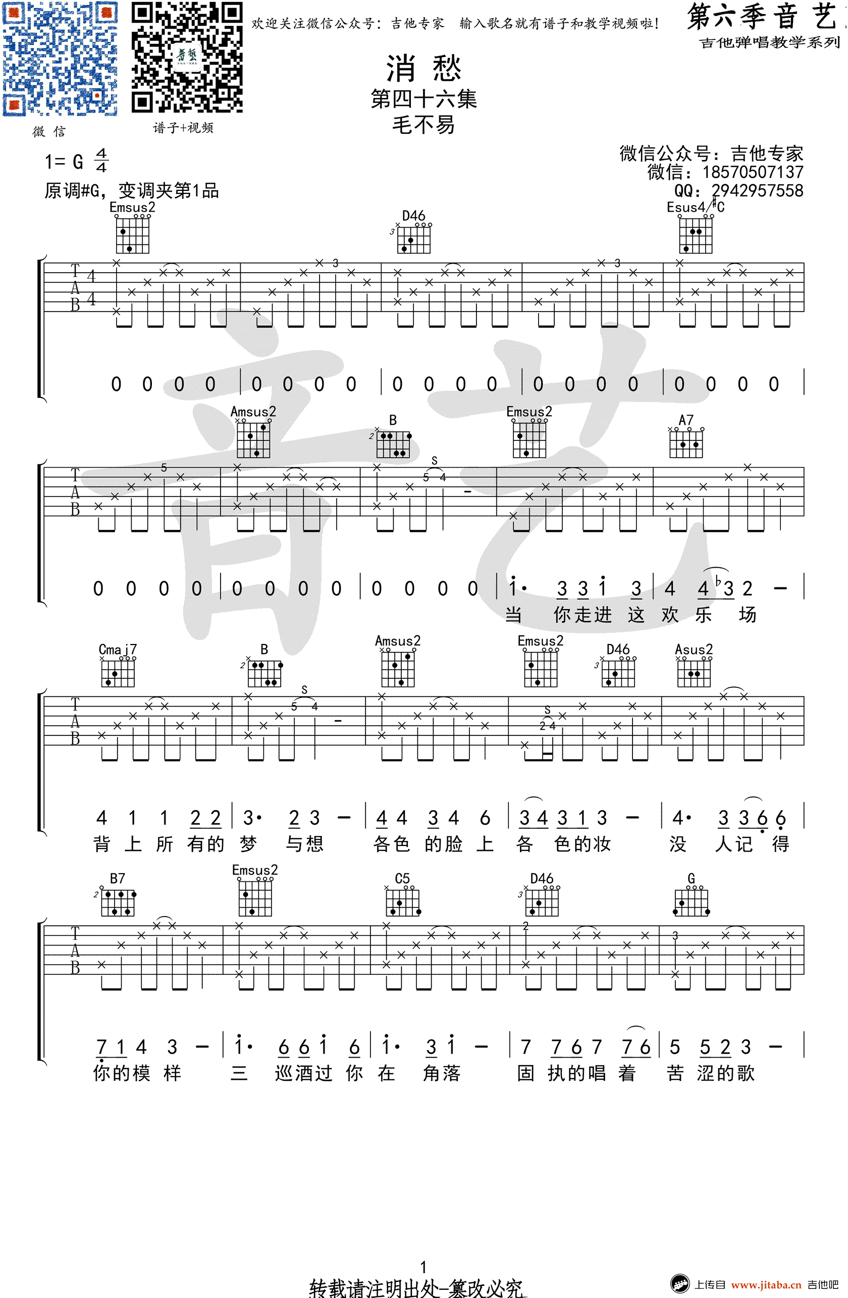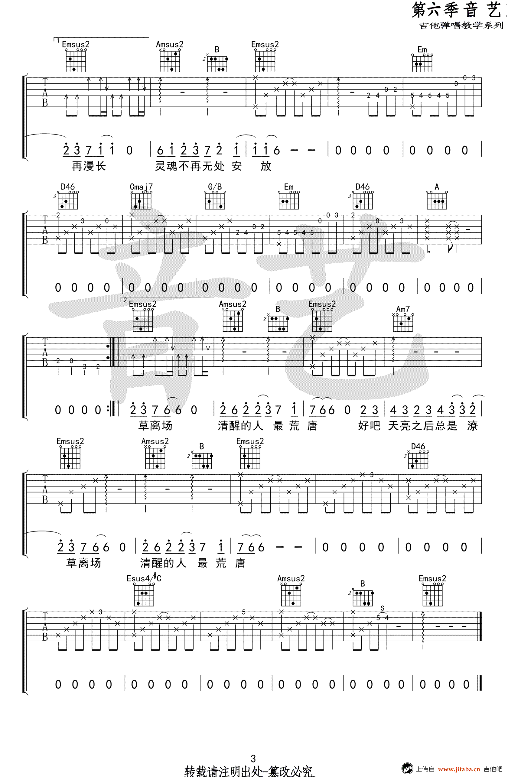 毛不易吉他谱,毛不易演唱,《明日之子》优秀原创作品。毛不易六线谱,高清弹唱谱共三张图片。歌曲原调#G,变调夹夹第一品,选用G调指法。感谢音艺吉他编配,吉他吧网站上传。 歌曲的和声调式编配的真心不错,大小调的转换很到位,和弦外音也有特点,所以就尽量按原版来编配的,不过来也不算难,弹不了的小伙伴可以把和弦简化,比如Emsus2就用Em。