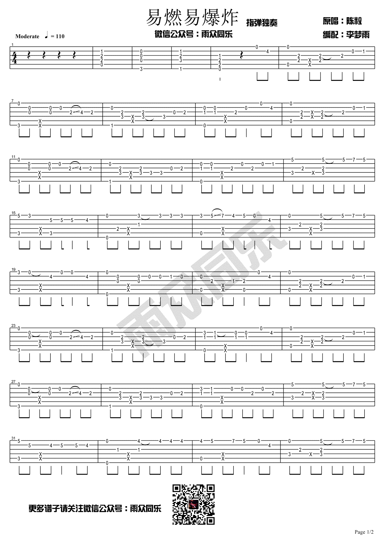 易燃易爆炸指弹谱,陈粒民谣歌曲代表作,跌宕起伏的旋律,瞬间点燃你心中的小宇宙,易燃易爆炸吉他独奏谱,高清图片谱,六线谱由雨众同乐编配,吉他吧网站整理上传。 一首《易燃易爆炸》,极致对立,极致爱恨,这就是陈粒,不疯魔,不成活。独一无二的她,恣意傲慢,天真无邪。