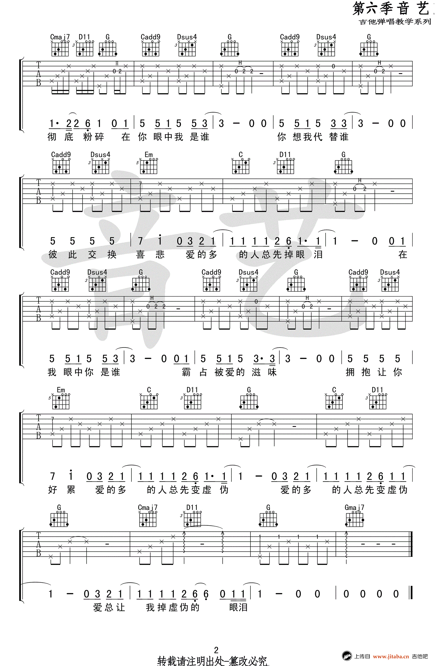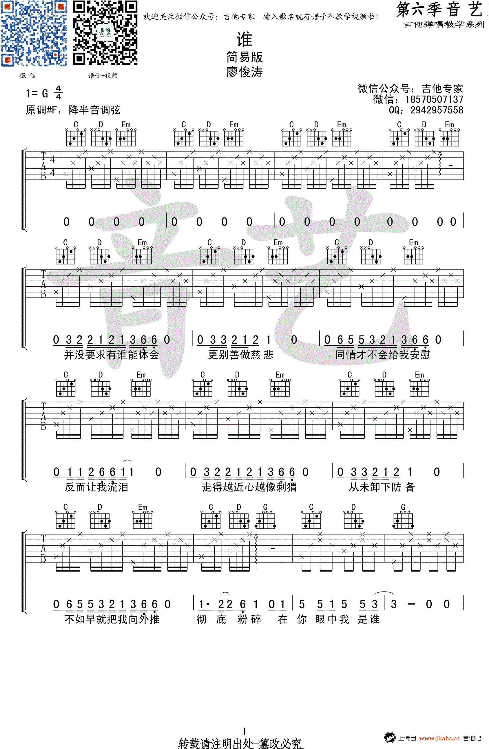 廖俊涛《谁》吉他谱,六线谱高清版,两张图片谱,谁吉他弹唱谱,G调简易版,降半音调弦,《明日之子》廖俊涛原创作品,一首很有故事感的歌曲,音艺吉他编配,吉他吧网站收藏推荐。 能唱出世俗,能唱进的人心的歌都受人们欢迎,廖俊涛的这首《谁》,歌词并没有多么深奥,但某一句词会在最不经意之间戳中内心。