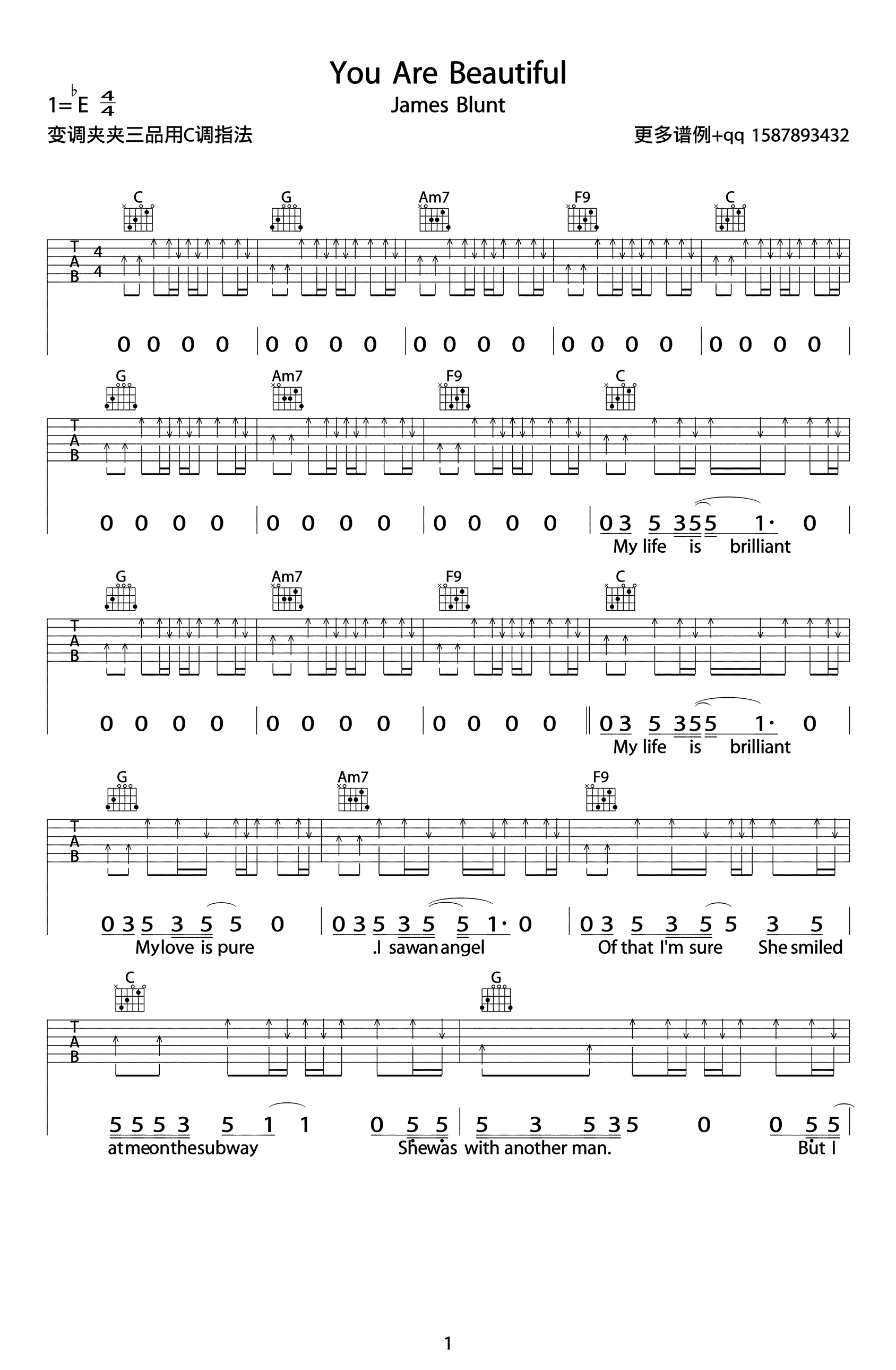You Are Beautiful吉他谱,英国歌手James Blunt(詹姆斯·布朗特) 演唱的一首非常好听的英文歌曲,You Are Beautiful吉他弹唱谱,原调降E,变调夹夹三品,用C调指法。高清图片谱共三张谱例。 是啊,我视线被她占据,在我们擦身而过的瞬间。把这首歌送给心里的你,这份隐藏在心里的情感, 我愿意永远留一个位置,不过期,或许直到心跳停止,爱你的我 。