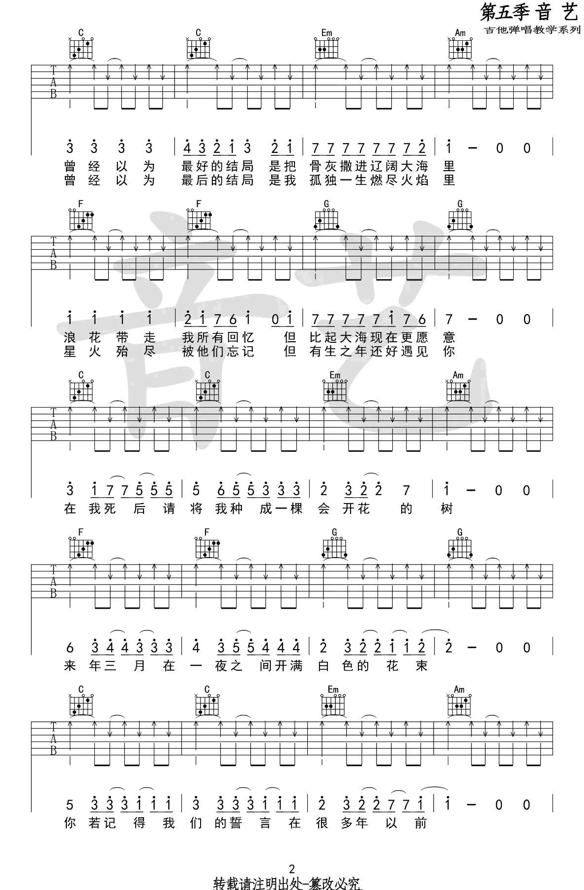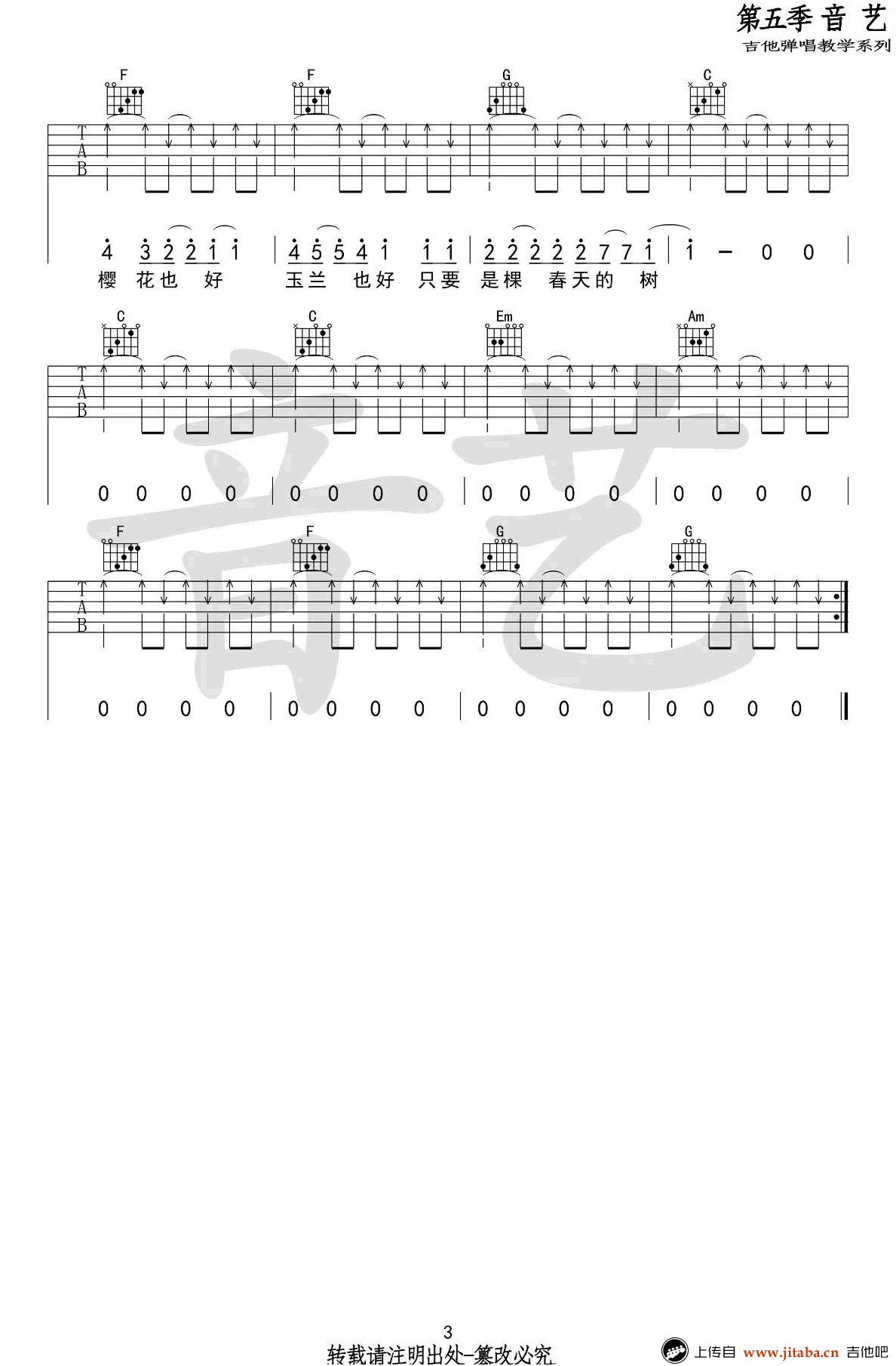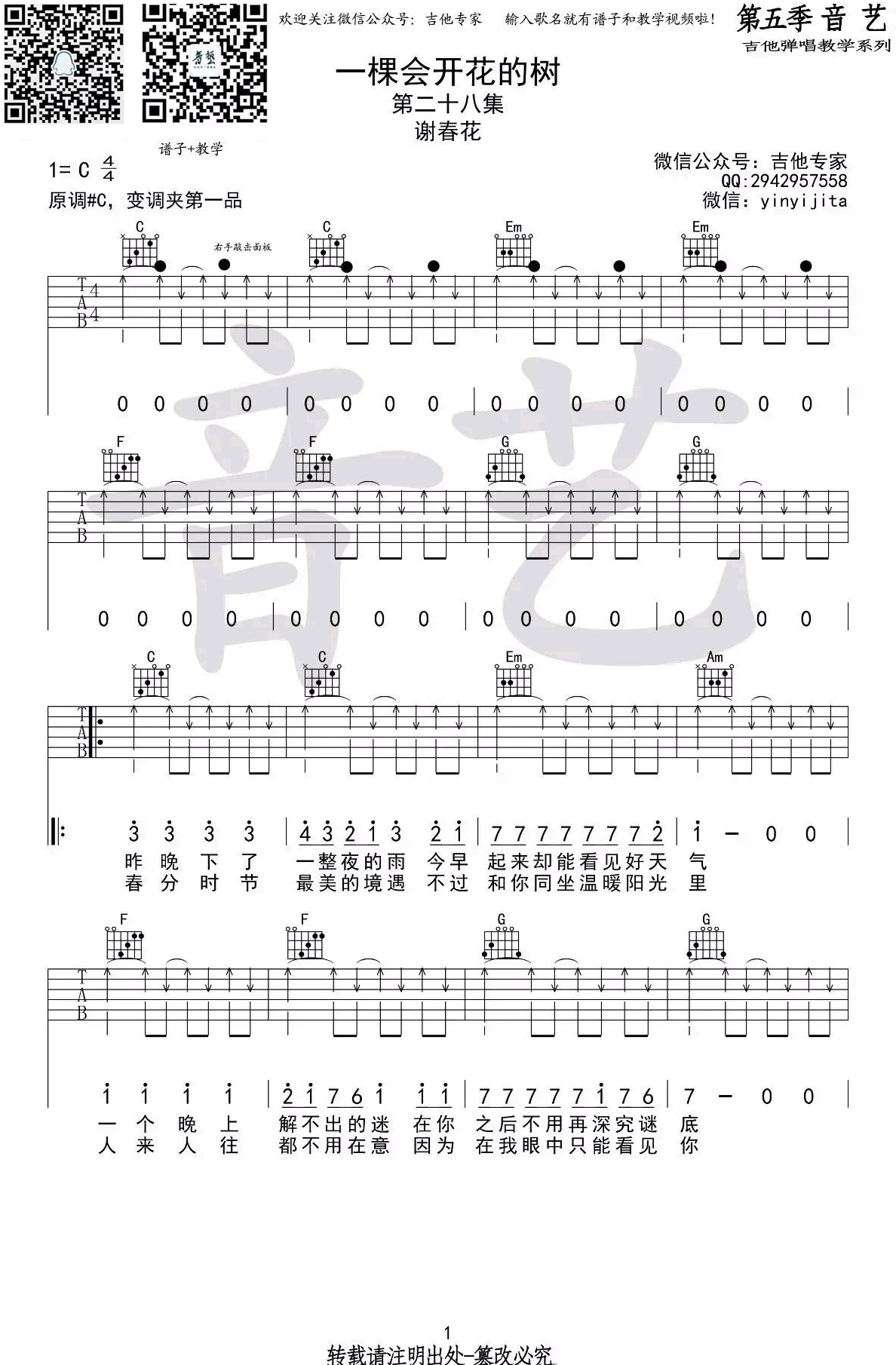 一棵会开花的树吉他谱,谢春花演唱,原调#C,变调夹夹第一品,选用C调指法。一颗会开花的树六线谱,高清图片谱。感谢音艺吉他编配出品,吉他吧网站整理上传。 感谢摇滚猫老师:这首歌曲并不难,也比较好唱。谢春花的版本是吉他和手鼓伴奏的。我们在扫弦的时候也可以在第一拍和第四拍加一个敲击面板就可以啦!