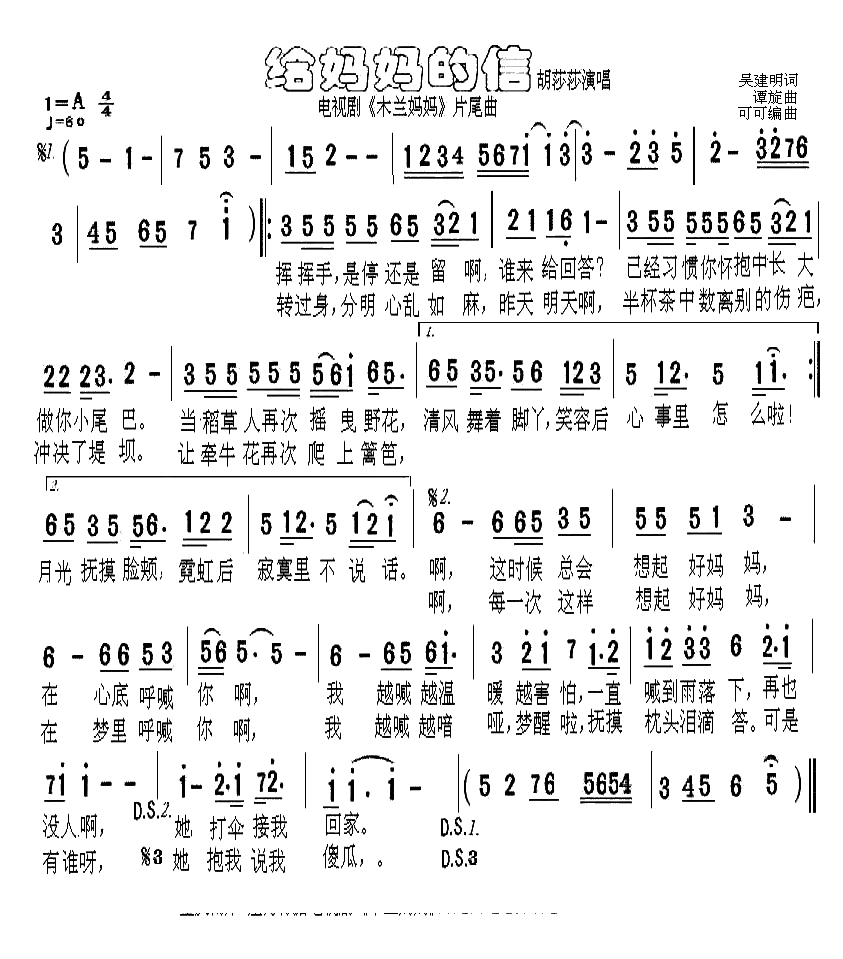 给妈妈的信简谱-胡莎莎演唱-电视剧《木兰妈妈》片尾曲简谱