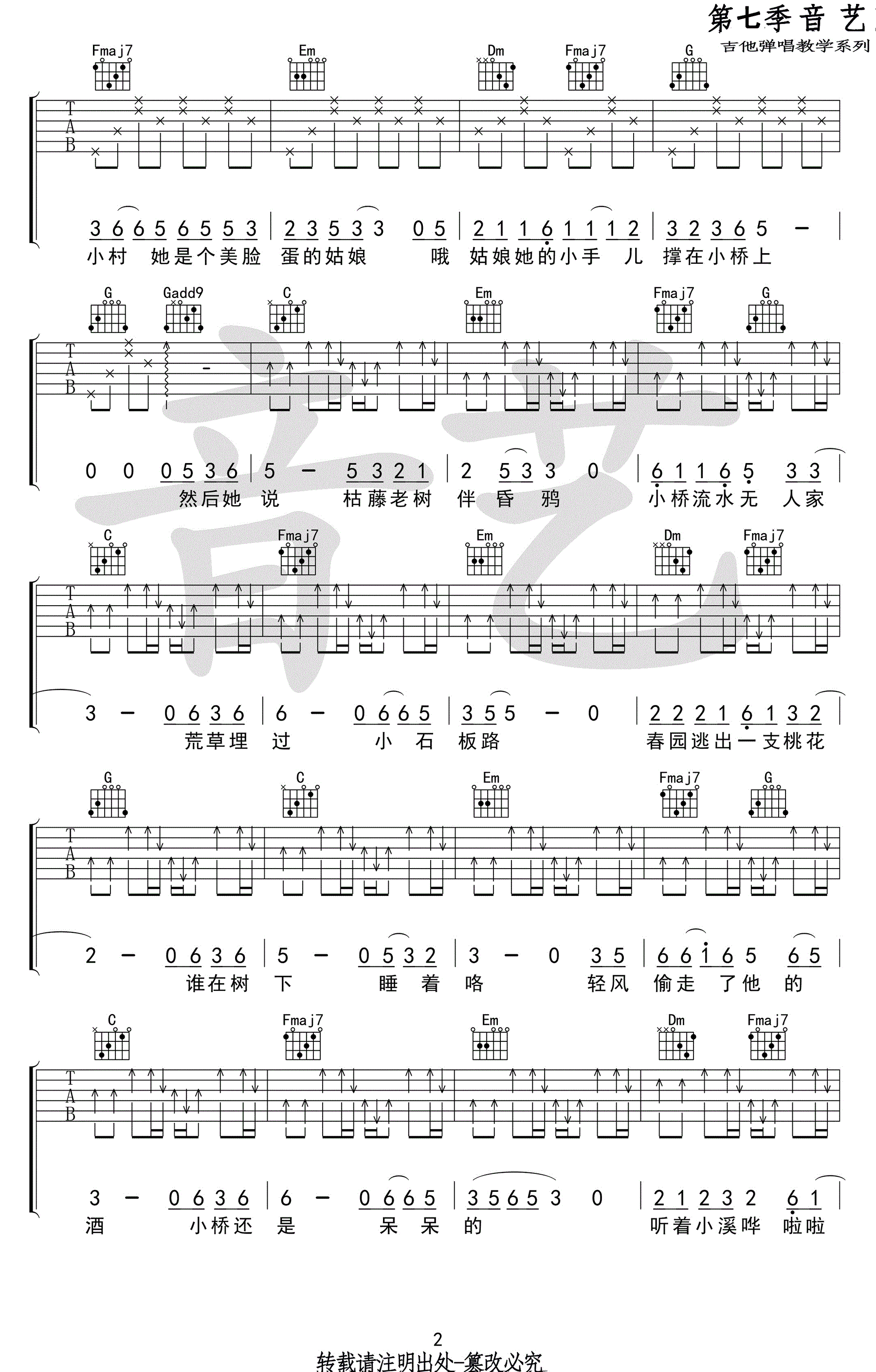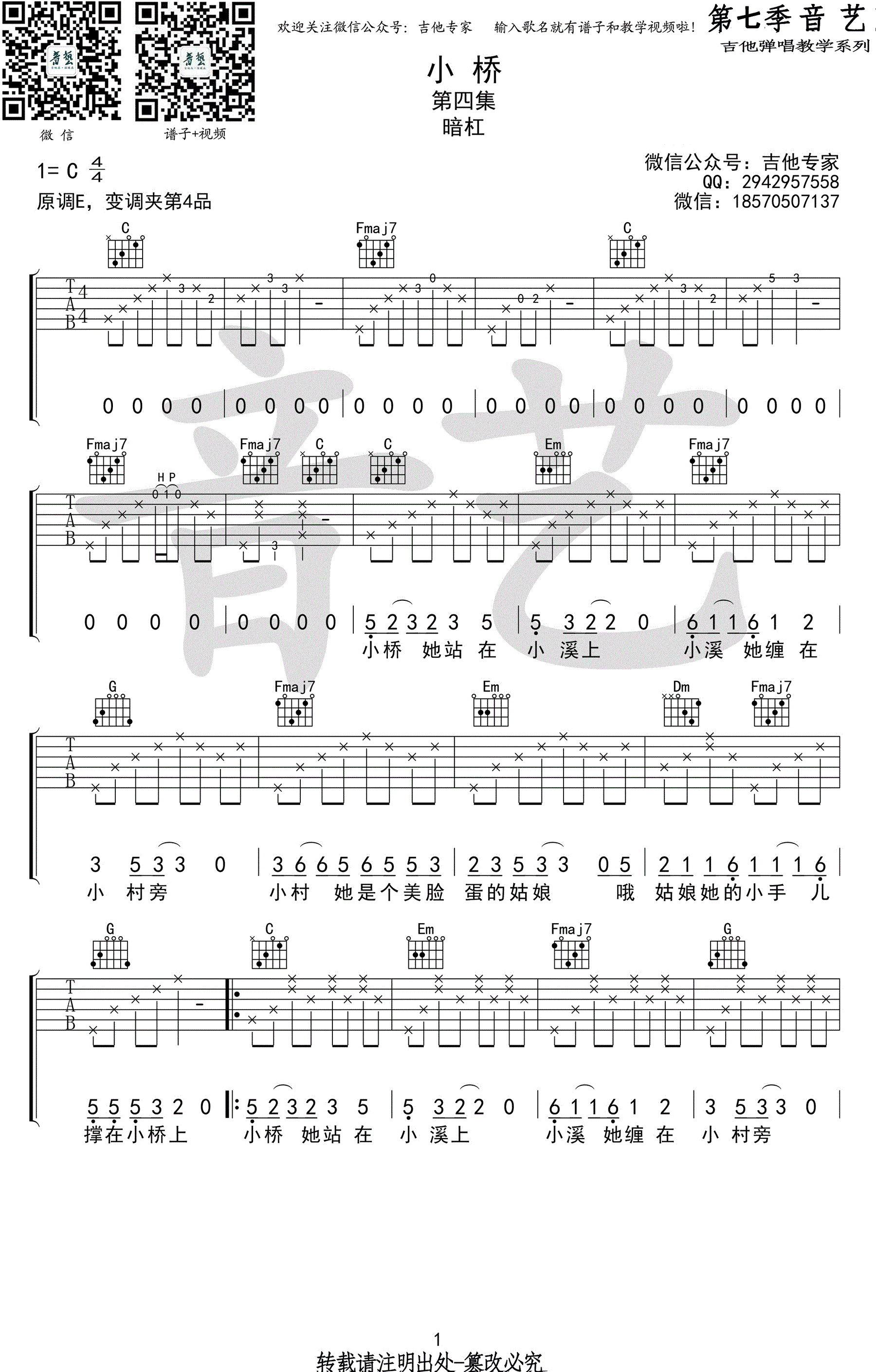 暗杠《小桥》吉他谱,原调E,变调夹夹四品,C调指法编配。小桥六线谱,三张高清图片谱例。延续《阿婆说》的经典,暗杠这首《小桥》带你梦回老家。感谢音艺吉他出品,吉他吧上传推荐。 真的是一首可以听着睡着的歌,柔软的词藻,朴实中不失优雅,小桥这样的一种静物,被拟人以一个温闻委婉的姑娘,不仅阔于山野,也可以藏匿于爱情,静心弹唱这首歌,用心感受,什么是美,什么是爱,什么是自然。