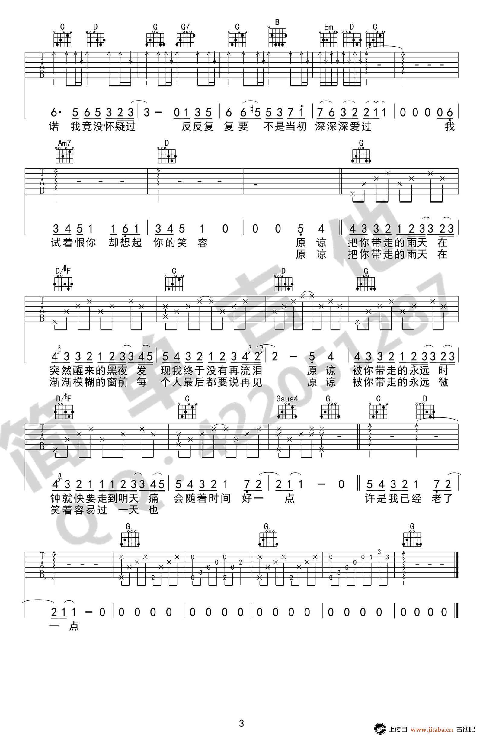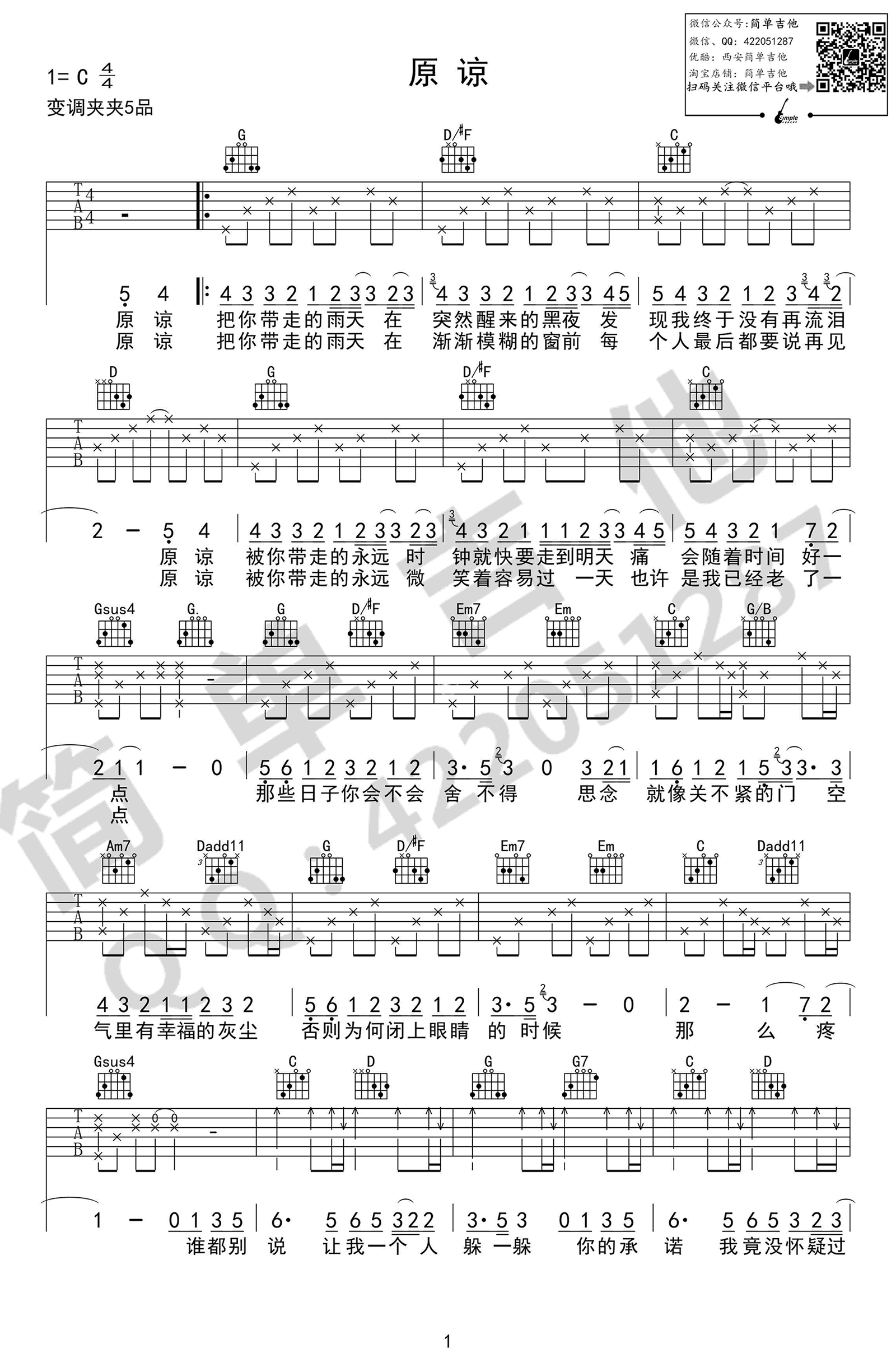 原谅吉他谱,陈玉华演唱,原谅吉他弹唱谱,原调C,变调夹夹五品,采用G调指法,三张高清图片谱,简单吉他编配,吉他吧网站上传推荐。 即使很多人不熟悉张玉华,也必定听过这首《原谅》,翻唱自日本组合kiroro的《一滴眼泪》,过去这么多年这首歌依然触动人心,有多少人的回忆都在这首歌里,又有多少人因为这首歌有了回忆。