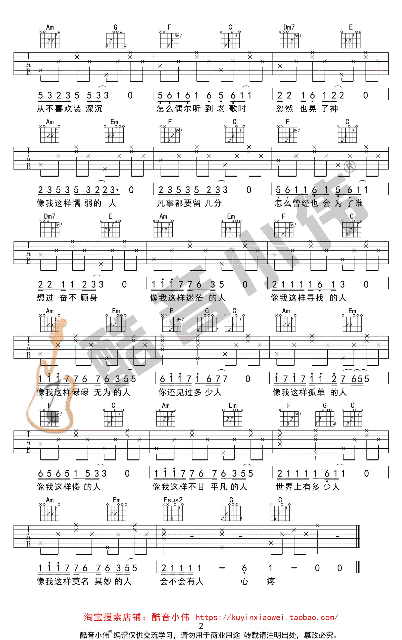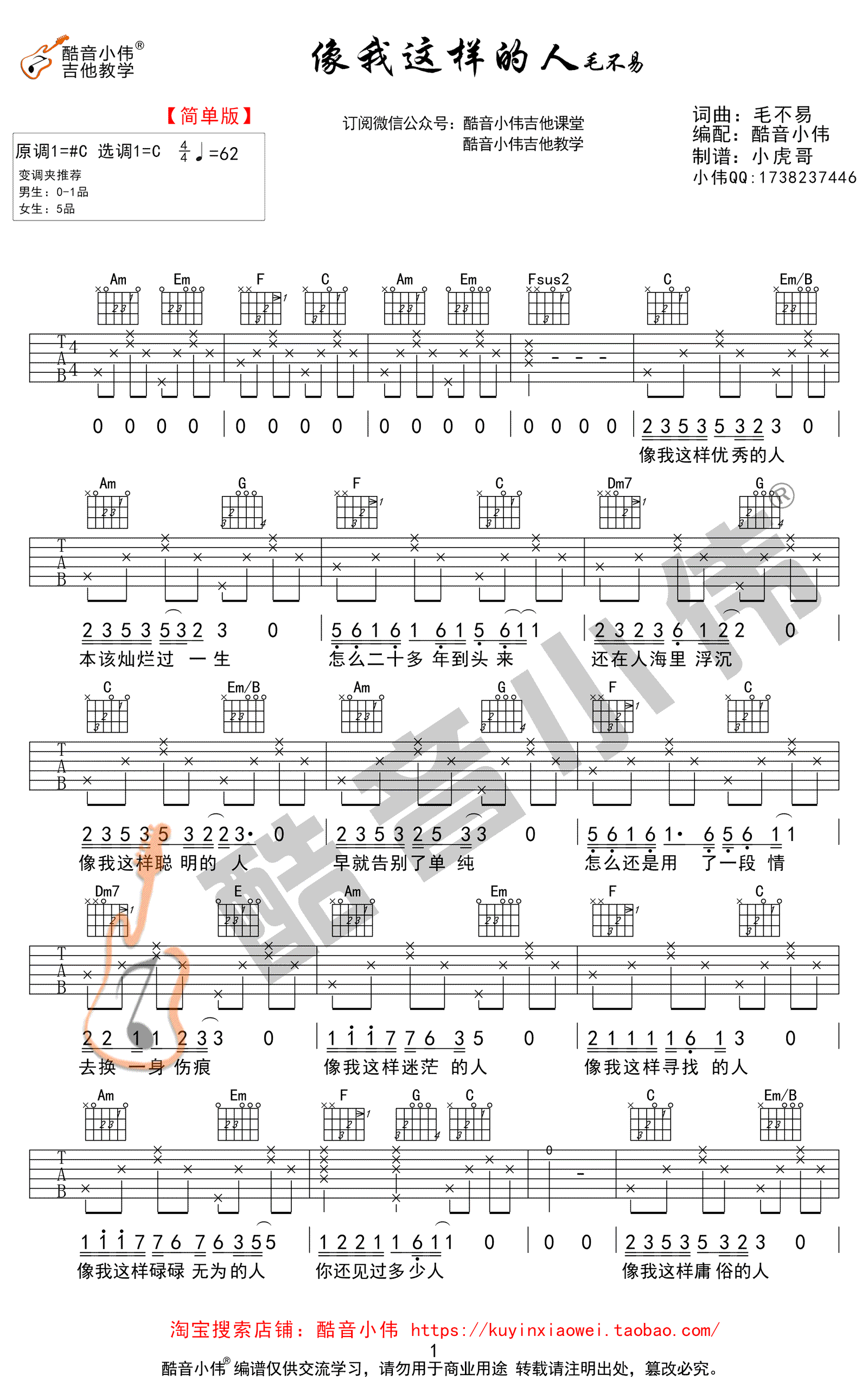 像我这样的人吉他谱,毛不易的一首热门歌曲,本曲谱为C调简单版编配,适合入门级的琴友弹唱练习。像我这样的人六线谱,高清弹唱他图片谱,歌曲原调升C,变调夹推荐男生0-1品,女生5品。感谢酷音小伟出品,吉他吧为琴友们推荐分享。 要走过多少的路,经历多少的故事,才能唱出平凡中的深情。敬岁月一杯酒,愿此生波澜不惊。