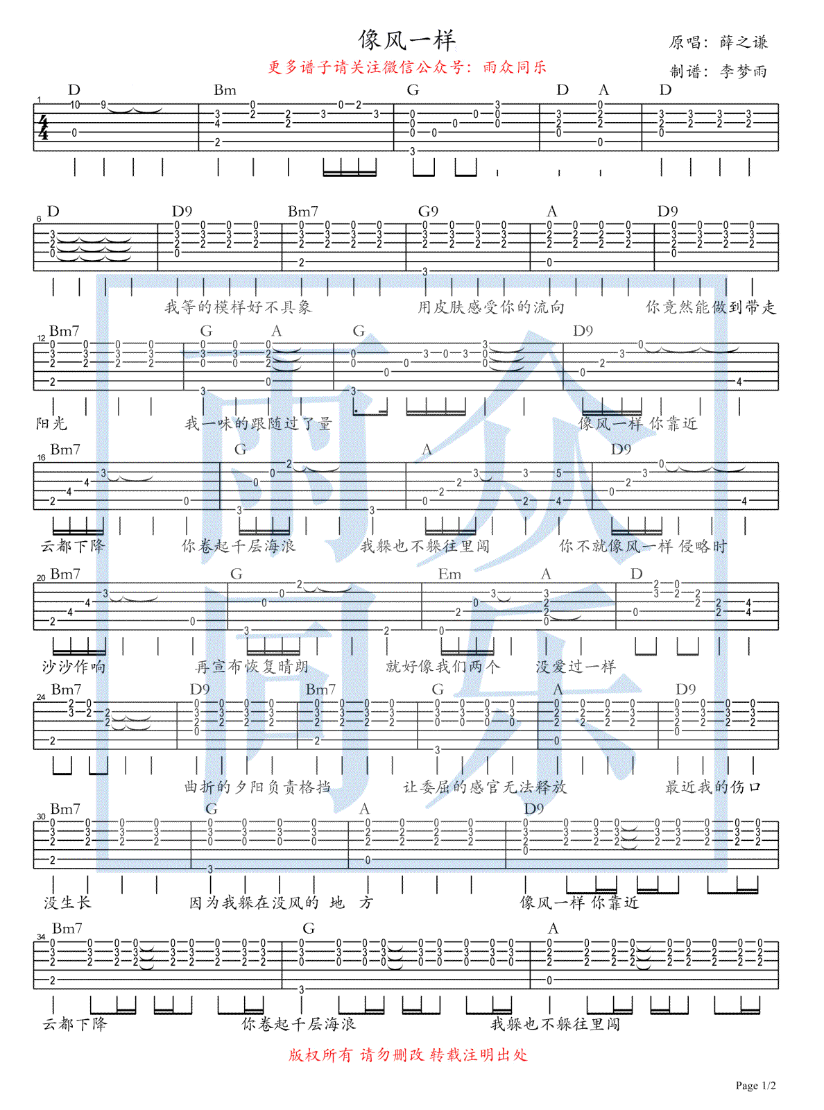 薛之谦《像风一样》吉他谱,一首舒缓忧伤的薛氏情歌,像风一样六线谱,吉他弹唱谱两张图片。感谢雨众同乐出品,吉他吧上传分享。 命运如感情的风暴,她来时猝不及防、摧枯拉朽。还来不及思考,便被这强大的吸引力卷入其中,全身心的投入,没有丝毫保留。自愿的忽略她残酷暴虐的一面,顾不得伤口的隐痛和被灰尘沾染的羽翼。只为能追上她的脚步、能更接近中心。