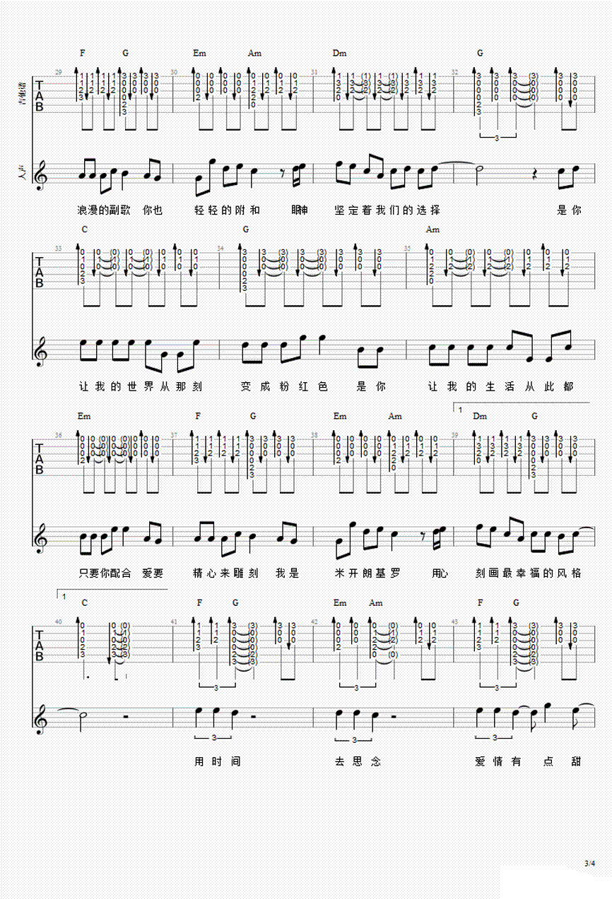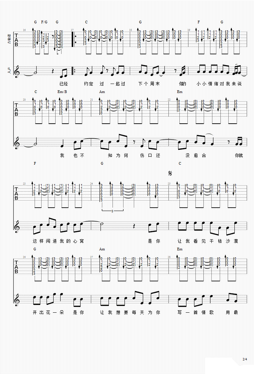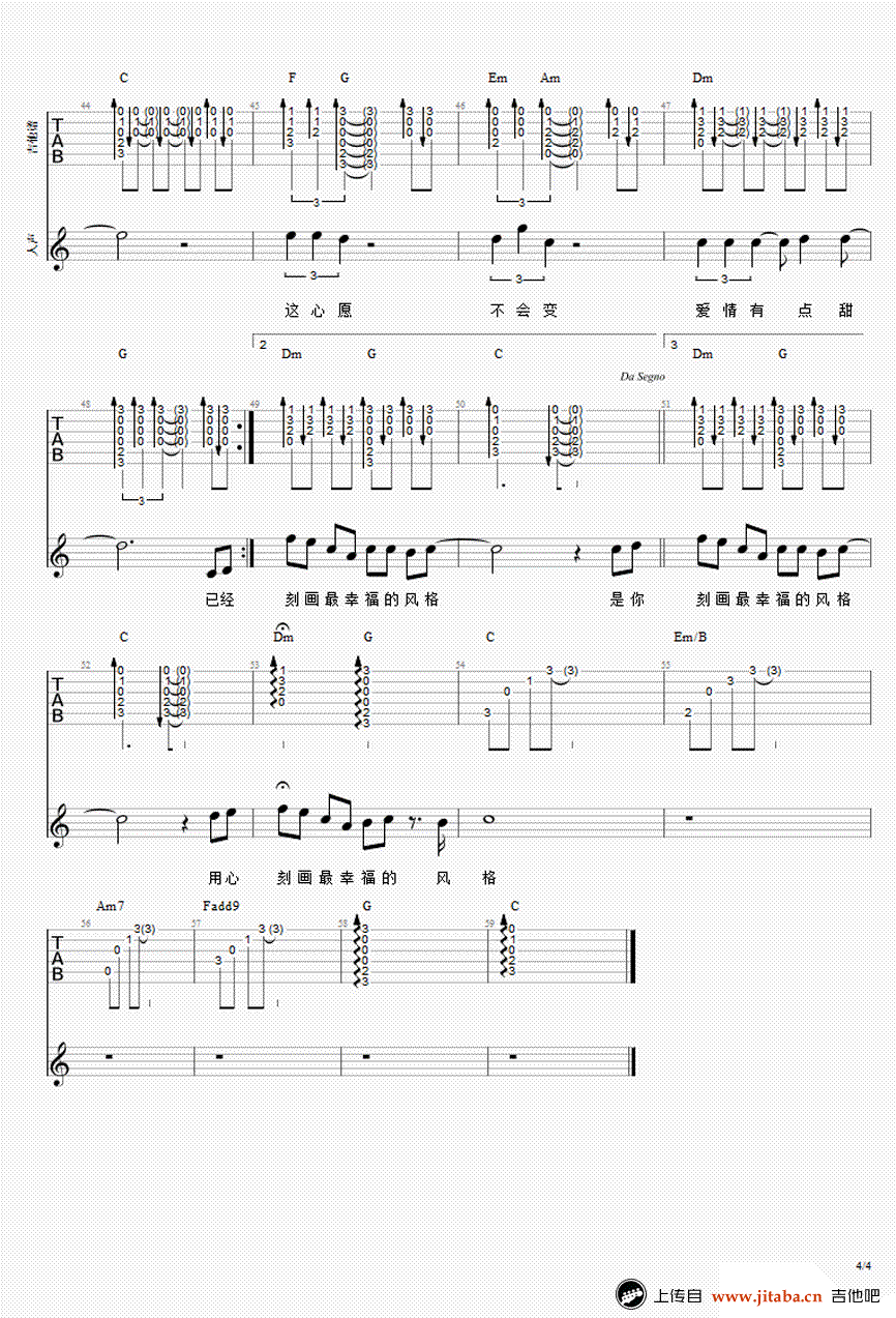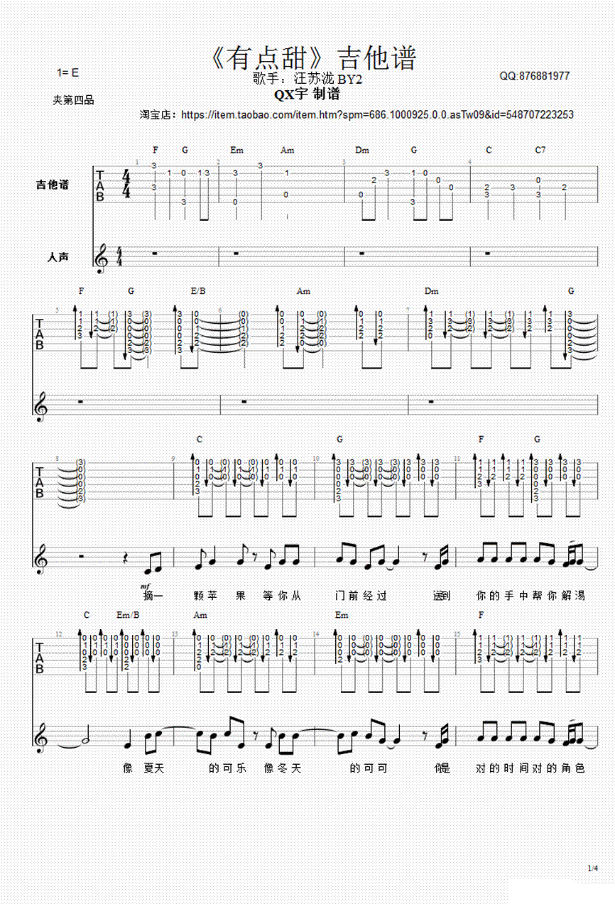 有点甜吉他谱,汪苏泷演唱,E调,变调夹夹四品,一首非常浪漫甜蜜的告白情歌,有点甜六线谱,完整版四张图片谱。感谢QX宇制谱,吉他吧推荐上传。 清新的旋律,纯纯的歌词,就是有这样的一首歌,能让你听出初恋的,羞涩的味道。是你让我看见干枯沙漠开出花一朵。 是你让我每天想要为你写一首情歌。简单的小情歌足以带给我们舒适和愉悦。