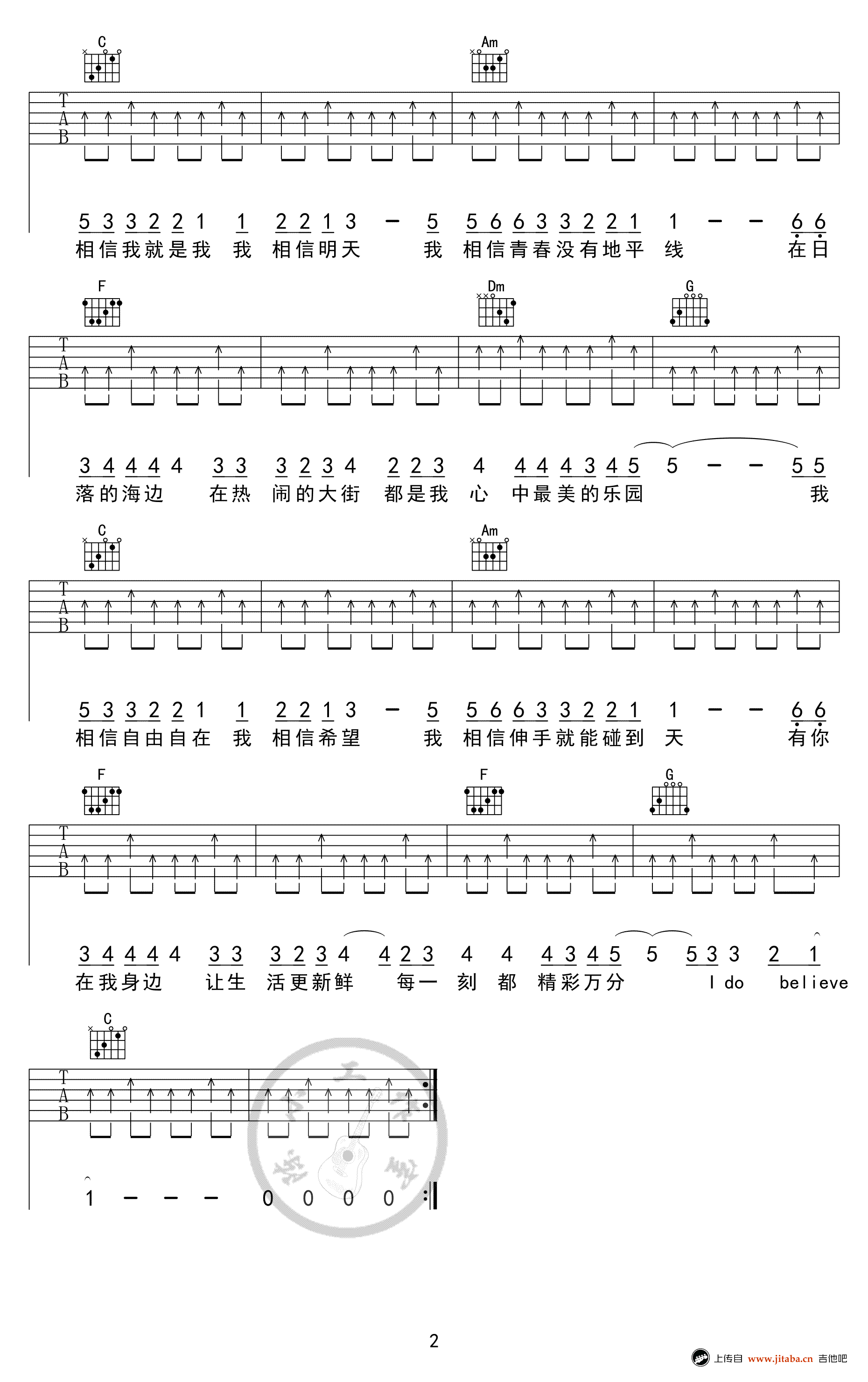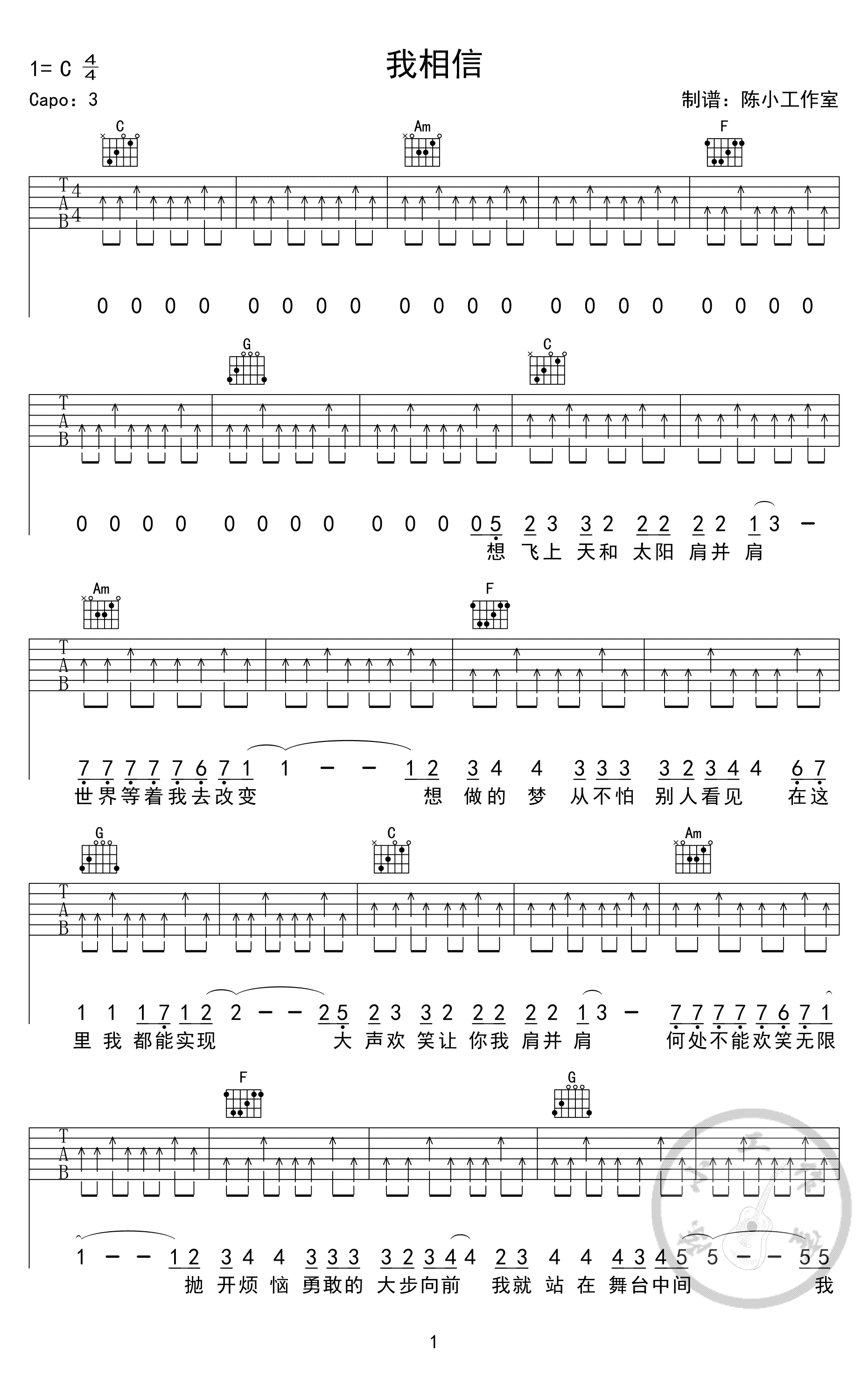 杨培安《我相信》吉他谱,C调指法编配,变调夹夹三品。我相信吉他弹唱谱,高清图片六线谱,感谢陈小工作室出品,吉他吧上传推荐。 “想飞上天和太阳肩并肩,世界等着我去改变”。铁肺王子杨培安拥有横跨三个八度的音域,高音激昂辽阔,一曲《我相信》把积极向上、永不妥协的拼搏精神带给所有相信梦想相信自我的追梦者。