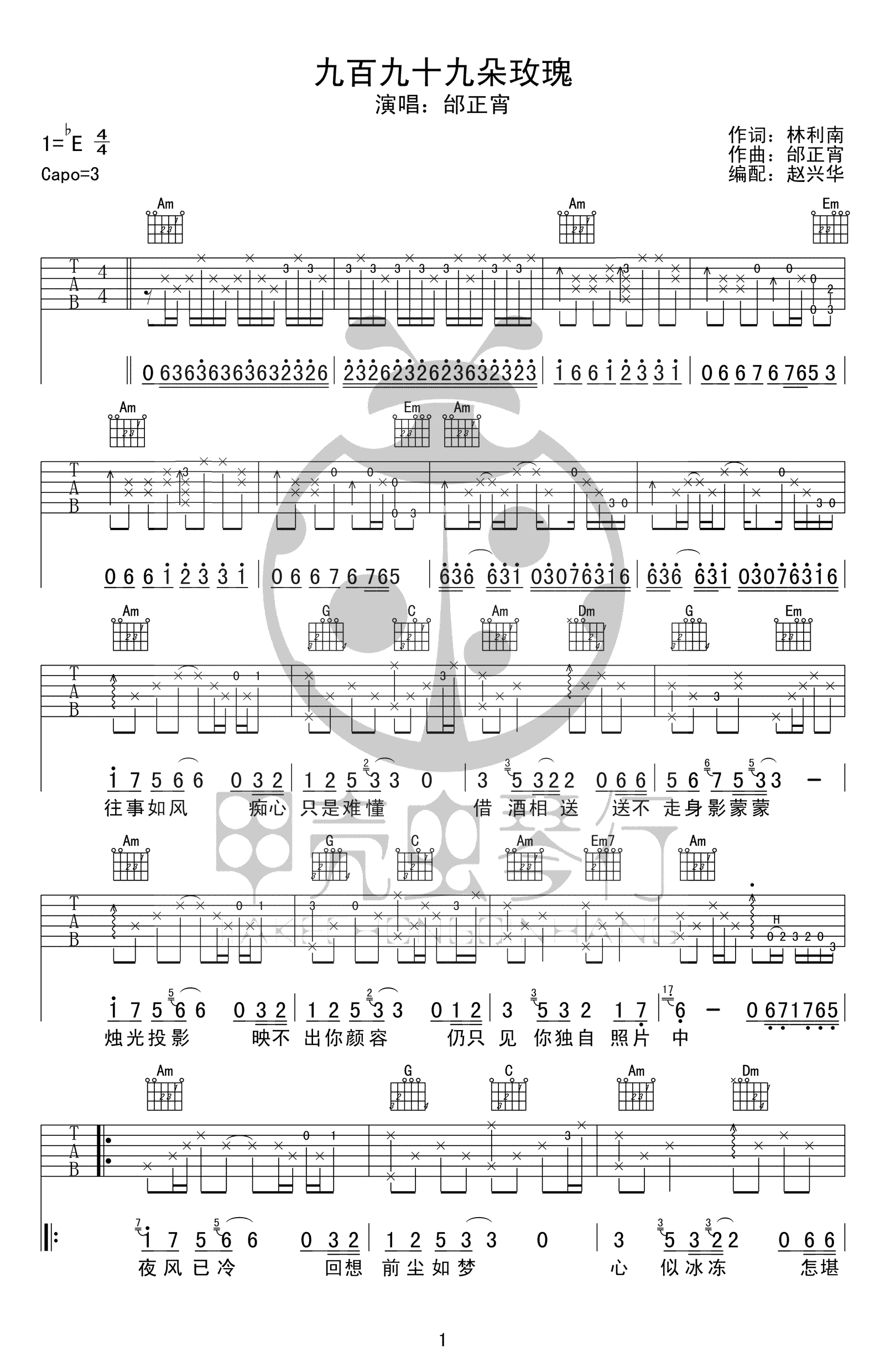 九百九十九朵玫瑰吉他谱,邰正宵的一首经典怀旧老歌,在90年代风靡大江南北,九百九十九朵玫瑰六线谱,高清弹唱图片谱,bE调性,变调夹三品。感谢赵兴华编配,吉他吧网站上传。 一首脍炙人口的情歌,影响着一代人的记忆,承载了无数人的青春回忆。“我早已为你种下,九百九十九朵玫瑰” 这是几句绝大多数中国人耳熟能详的歌词,传唱几十年经典不衰,唱过了一代人的青春。 不管时空经过多少转变,我们还是会一瞬间回到过去。