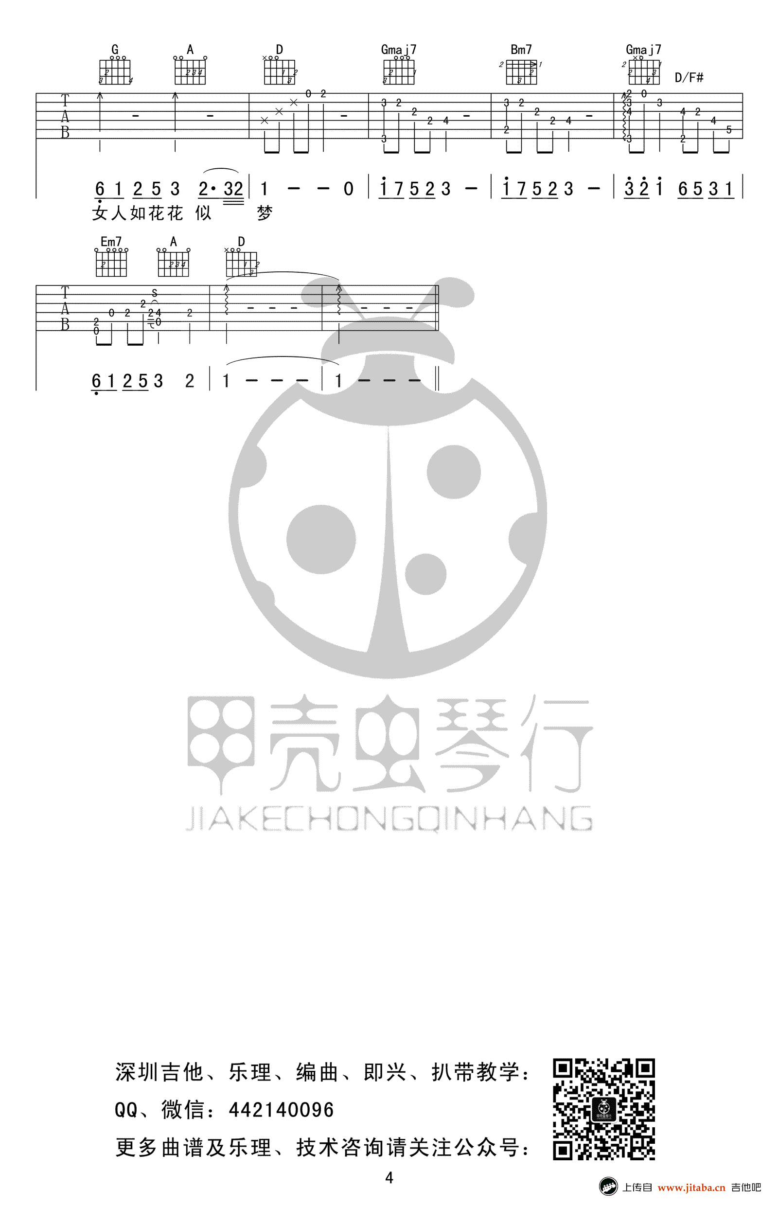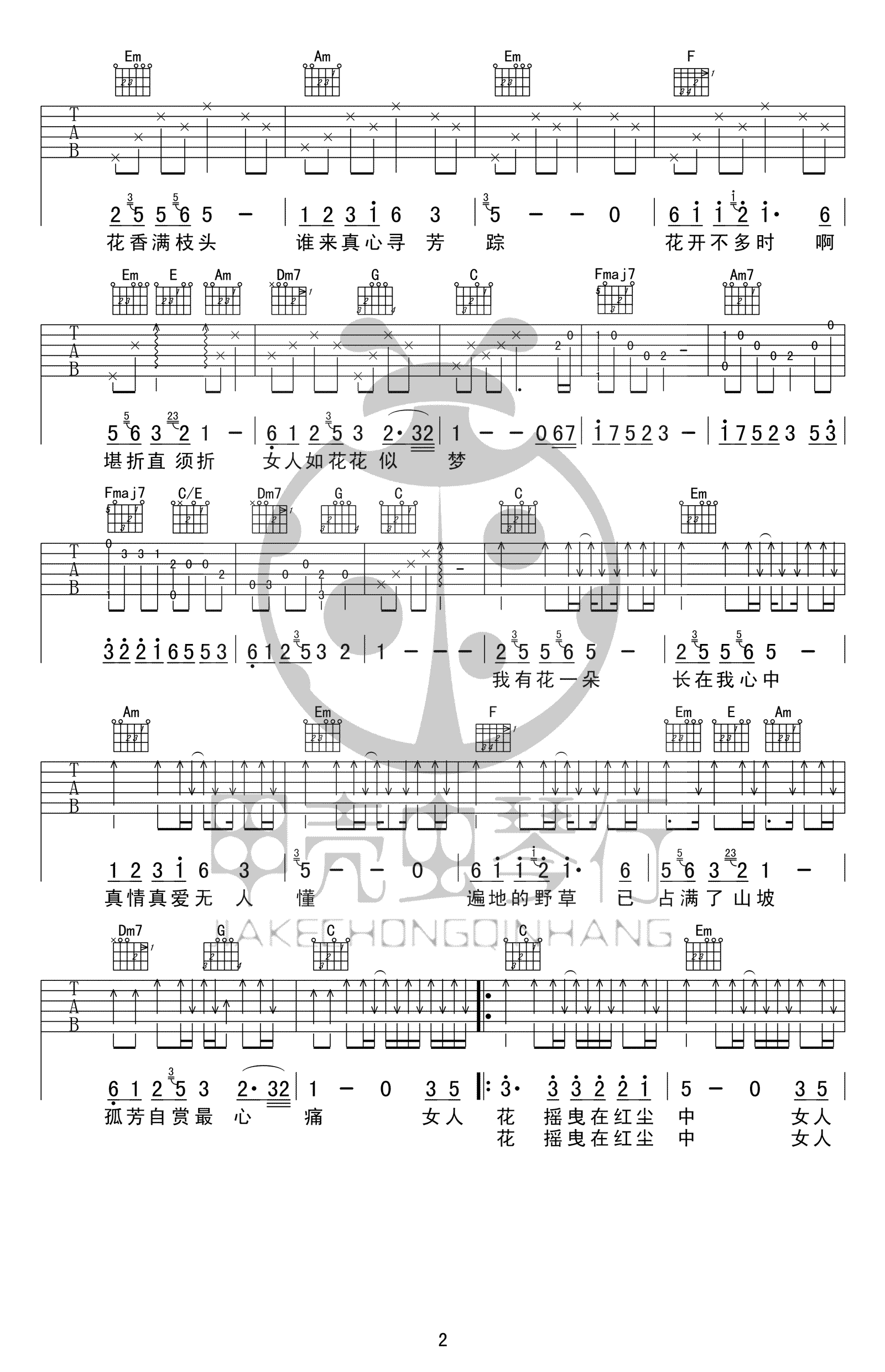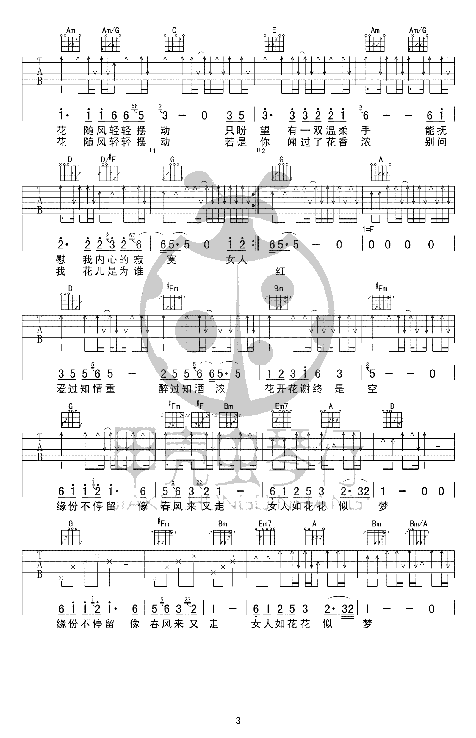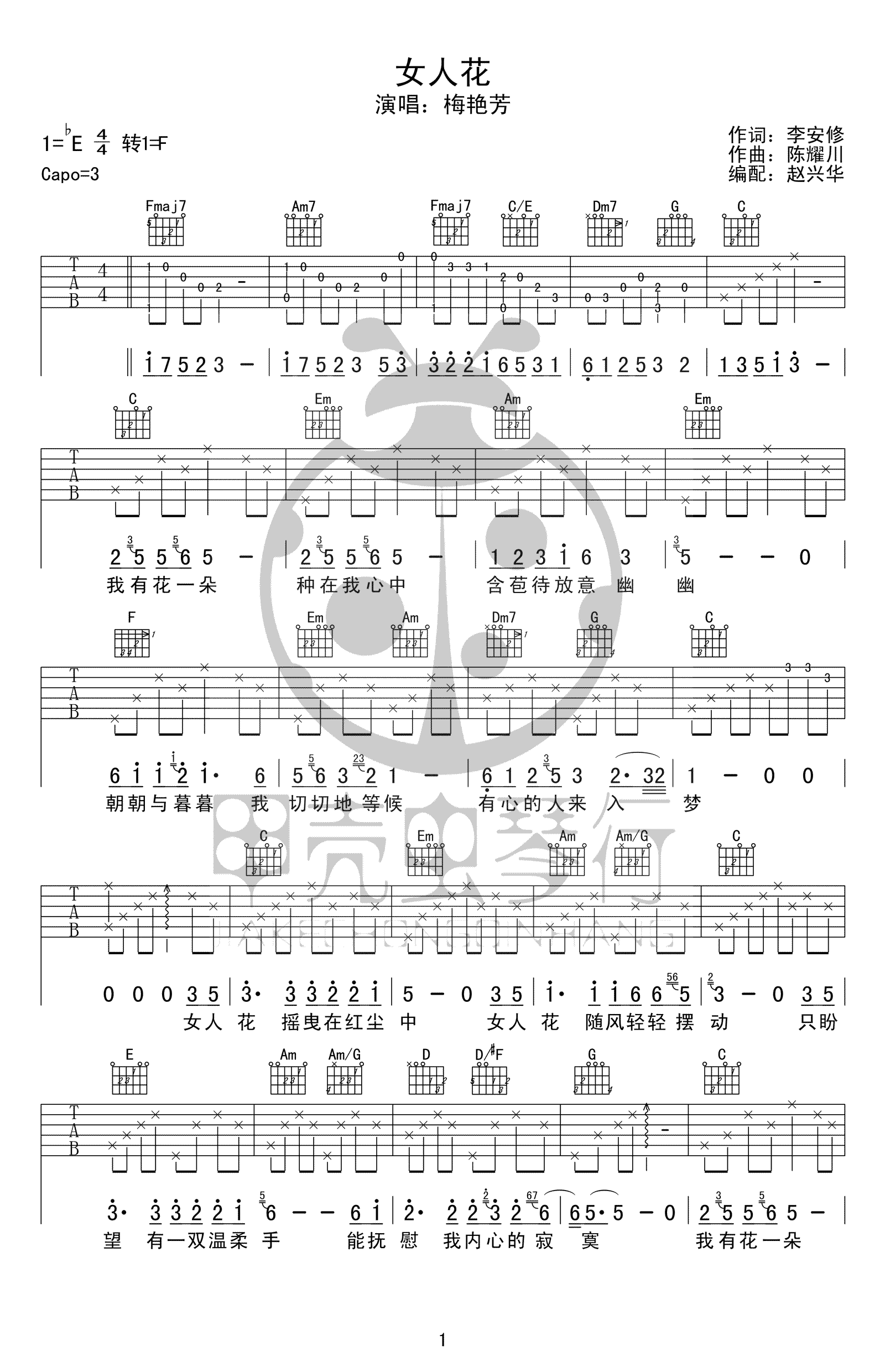 梅艳芳《女人花》吉他谱,六线谱编配,高清图片谱,完整版共四张谱例。女人花吉他弹唱谱,本谱调性降E调,变调夹夹三品。感谢赵兴华编配,吉他吧为琴友们上传分享。 每一个心里都住着一颗老灵魂,只有老歌才不世俗,百听不厌。珍藏在很多人的心底的一首华语金曲,梅艳芳温柔如水的演绎,使这首歌成为后无来者的经典。