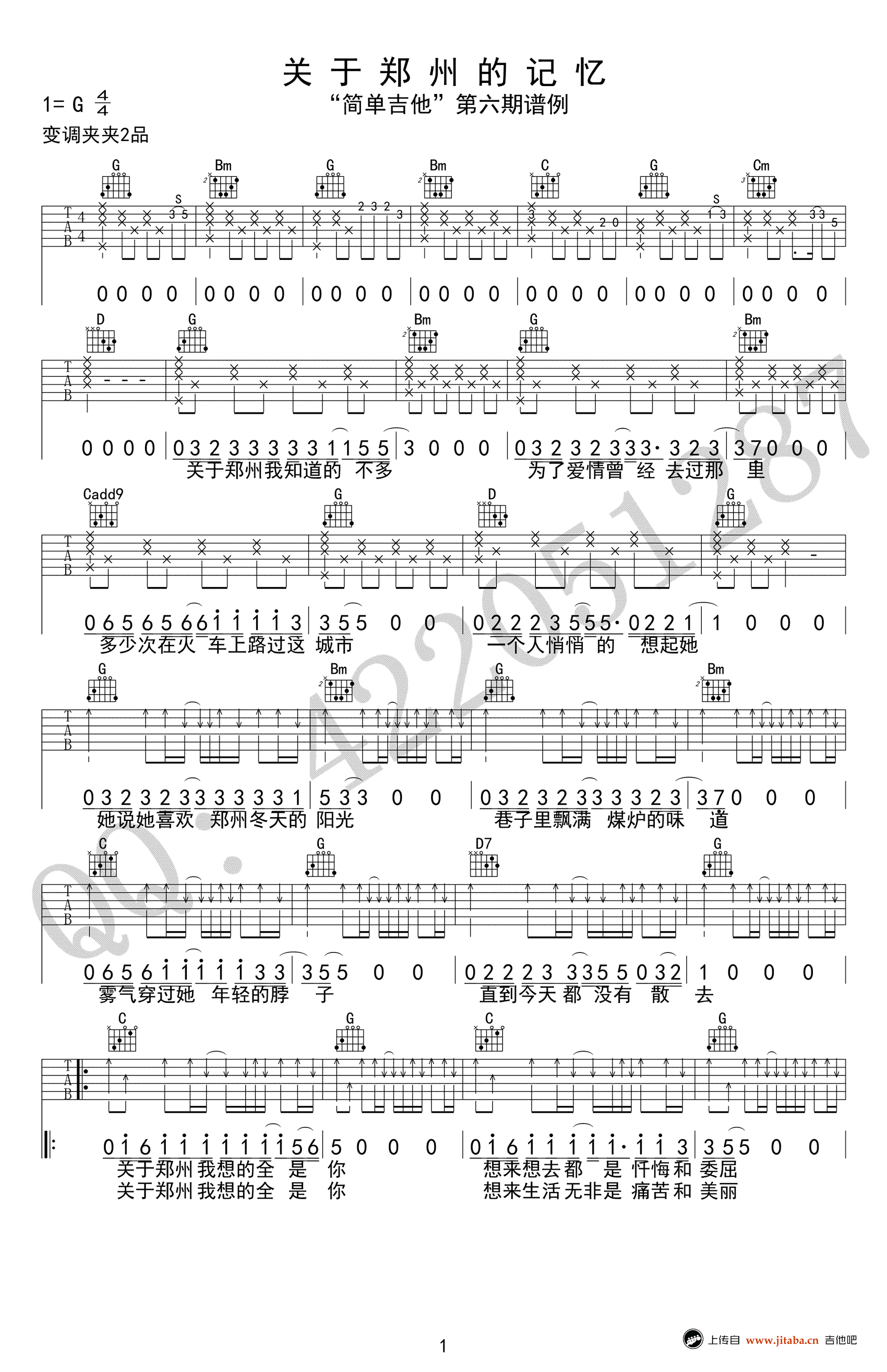 关于郑州的记忆吉他谱,李志的一首歌曲,G调指法,变调夹夹第二品,关于郑州的记忆六线谱,高清弹唱谱,感谢简单吉他编配,吉他吧网站推荐收藏。 为了爱情,你曾去过哪里?听李志的歌,想着与自己有关的故事,每一个跟着唱的人心里应该都有个不想提及的地方和无法忘记的人吧。