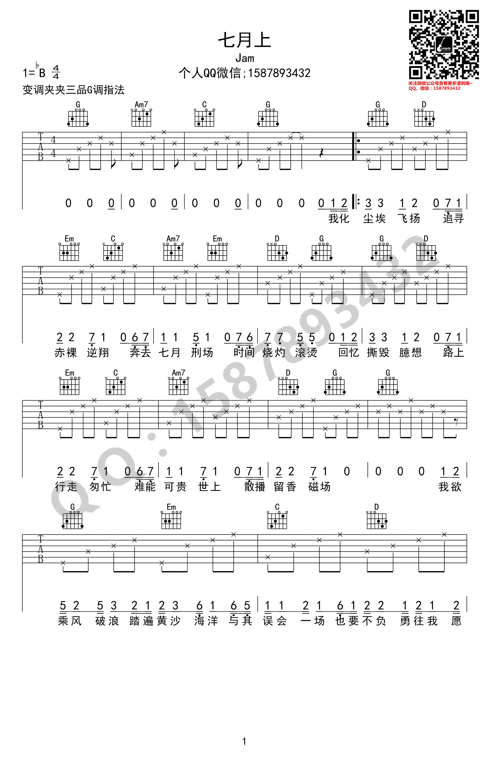 七月上吉他谱,JAM词曲演唱,歌曲原调降B,变调夹夹三品,选用G调指法。JAM的一首热门民谣歌曲,七月上吉他六线谱,两张高清图片谱。 JAM的歌对于情感的表达有一种洒脱,又或是说充满了一种江湖气息,也难怪被誉为民谣界的“女侠”,而这首《七月上》也是女侠的代表作,喜欢这首歌曲的琴友们弹唱练习起来吧。