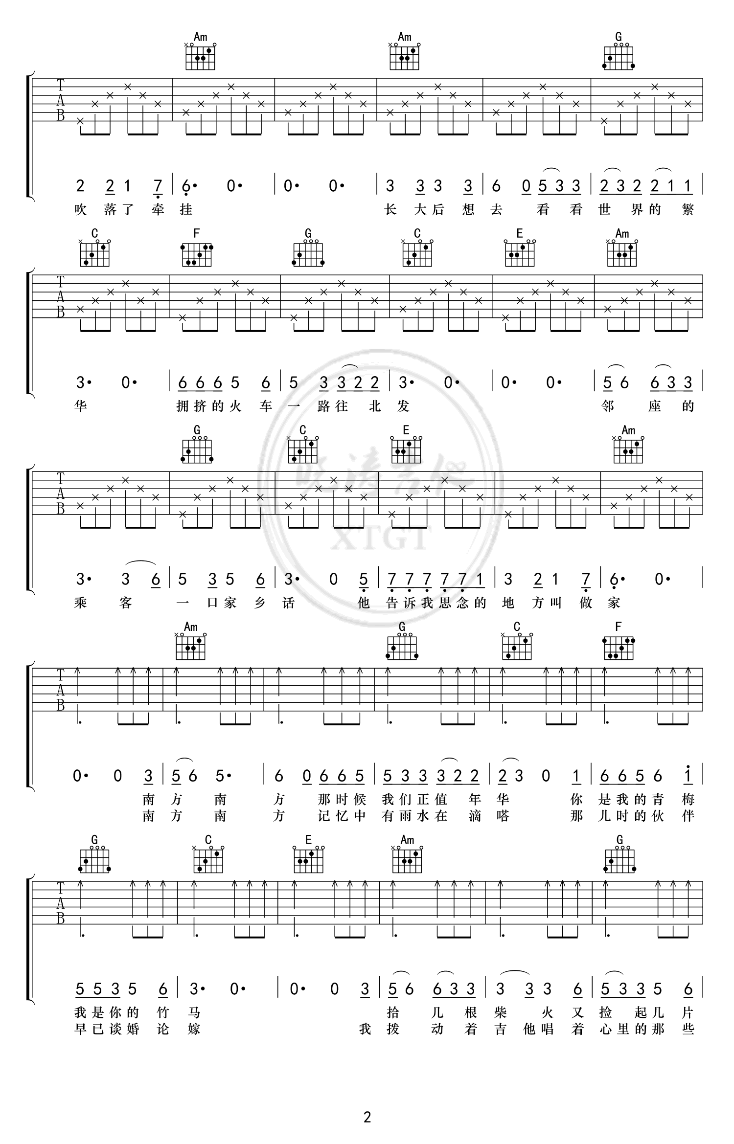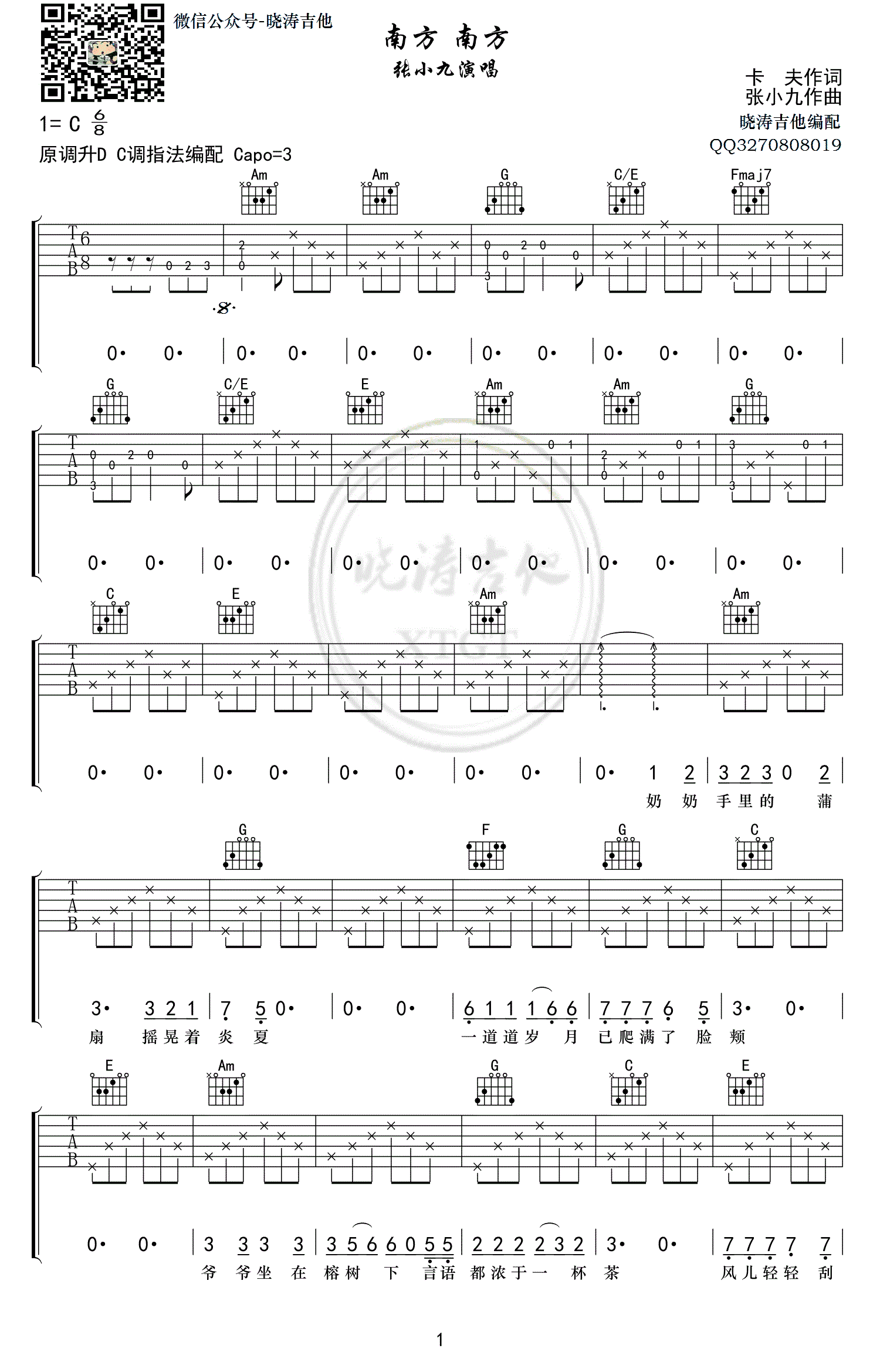 南方南方吉他谱,独立音乐人张小九演唱,一首思念故乡追忆似水年华的民谣原创歌曲,南方南方六线谱,歌曲原调升D调,C调指法编配,变调夹夹三品。晓涛吉他编配,吉他吧上传推荐。 南方这一词历来都是民谣热词,这首南方南方旋律不激不亢,从少时时光开始入手,怀念过去、想念从前的人和事,满腹故事。