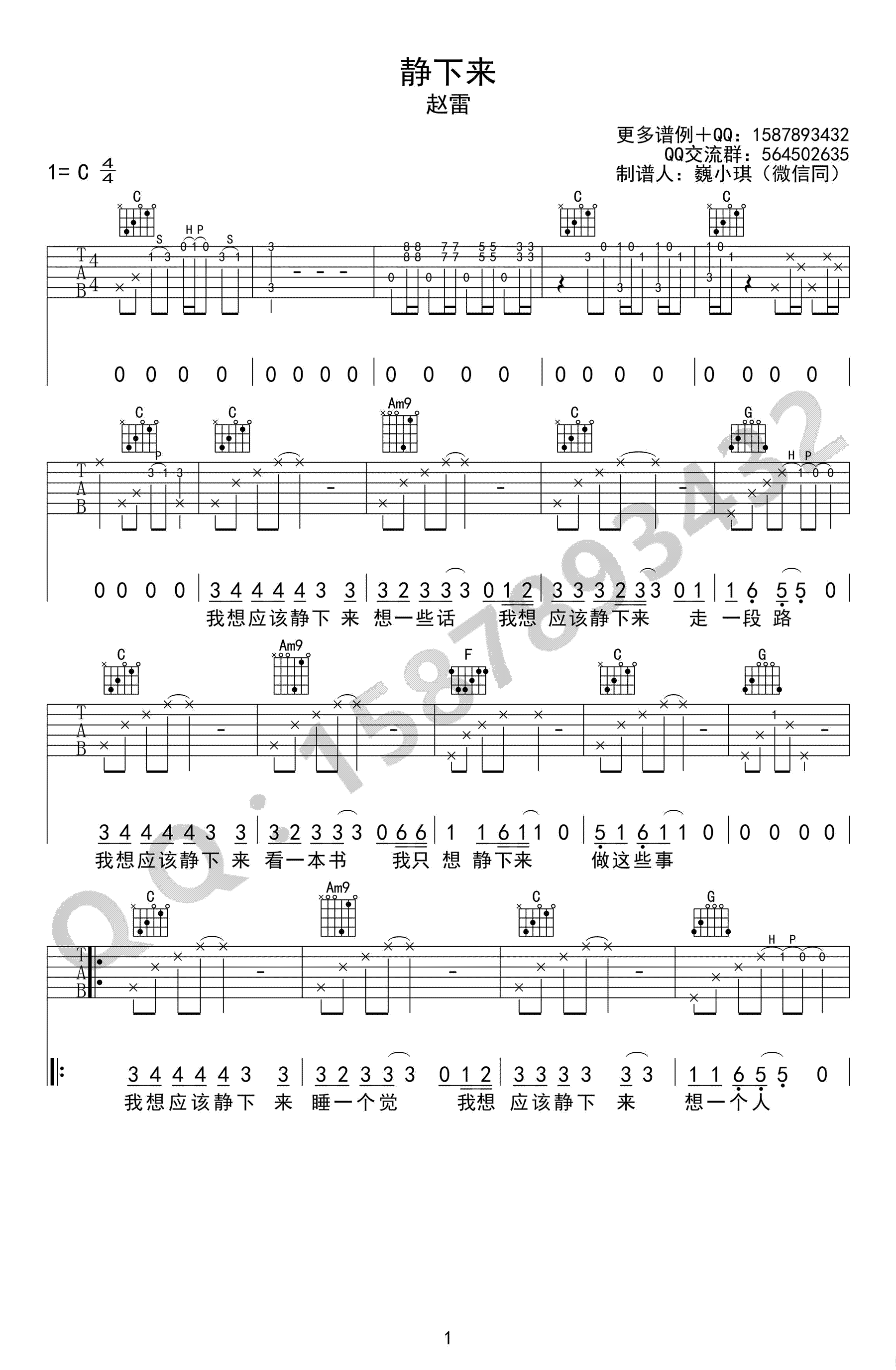 赵雷《静下来》吉他谱,C调指法编配,2017年赵雷的新歌单曲,一首让人灵魂沉静的民谣弹唱,《静下来》六线谱,高清弹唱谱,三张图片谱。感谢巍小琪制谱,吉他吧网站推荐上传。 这是赵雷多年前的创作,曾被大乔小乔演唱,如今在经历过这两年的喧嚣与名利之后,重新编曲演绎正式发表。在身不由己的疲惫之中,从音乐中找到出口,透过安静的旋律望向来时路,便能不忘初心,回归起点。