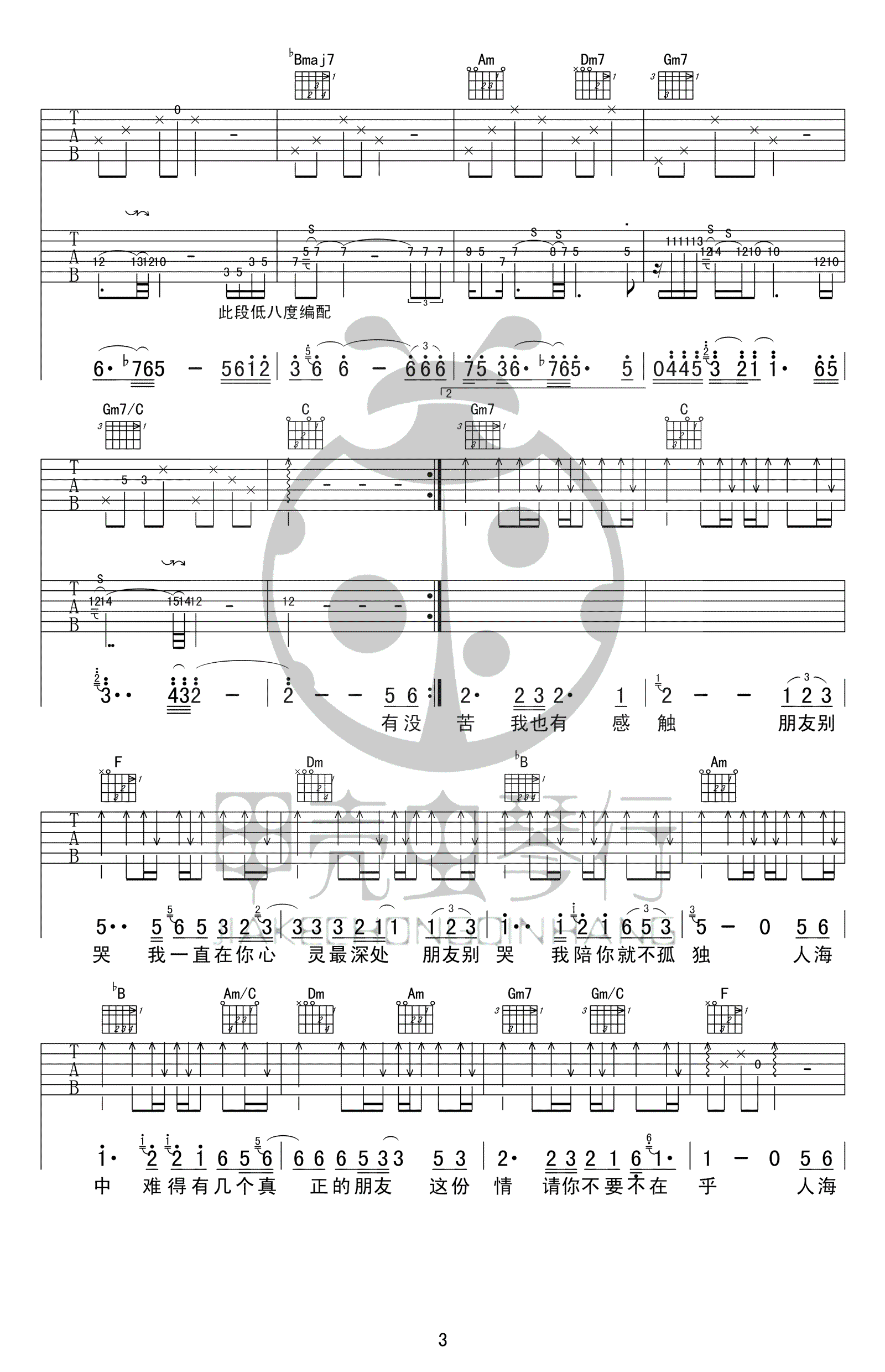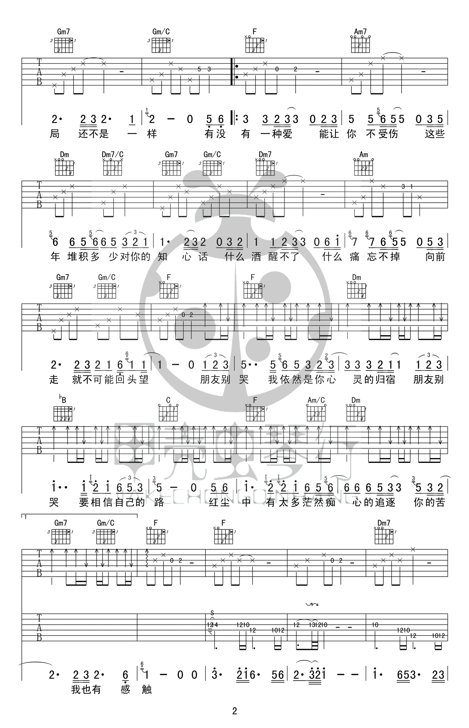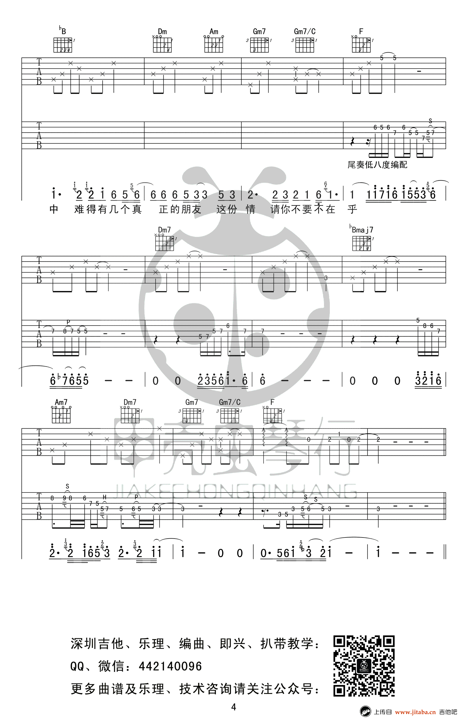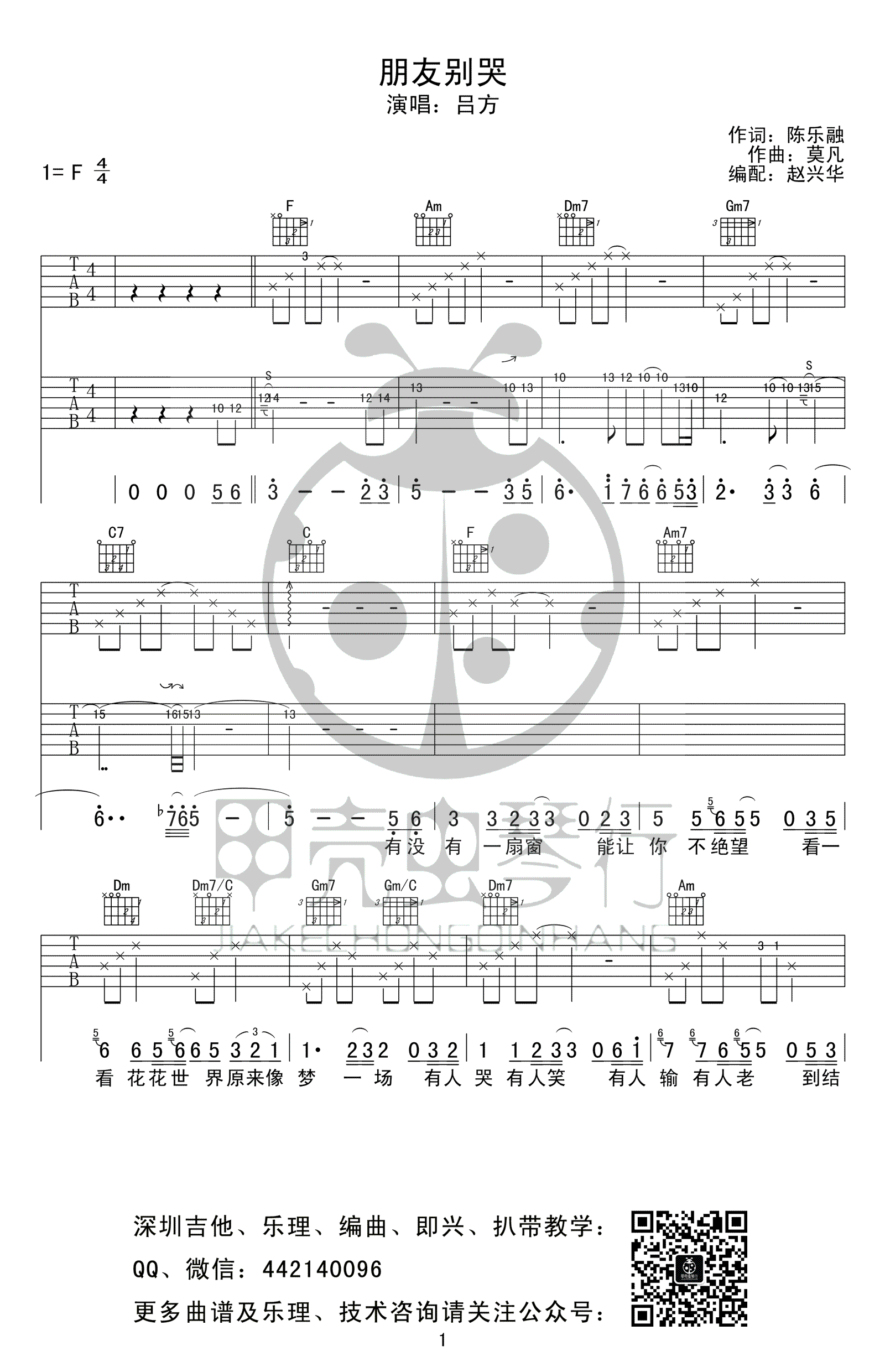 吕方《朋友别哭》吉他谱,F调弹唱谱,高清图片谱,一首道出了友谊真谛的歌曲,暖人心窝,朋友别哭六线谱,完整版共四张图片谱。感谢j赵兴华编配,吉他吧网站推荐收藏。 相识满天下,知心能几人,唱给岁月和友情的经典老歌,歌词质朴感人,虽然没有什么华丽的词句,但每一个字都沁入到心灵最深处的地方,真切温暖。