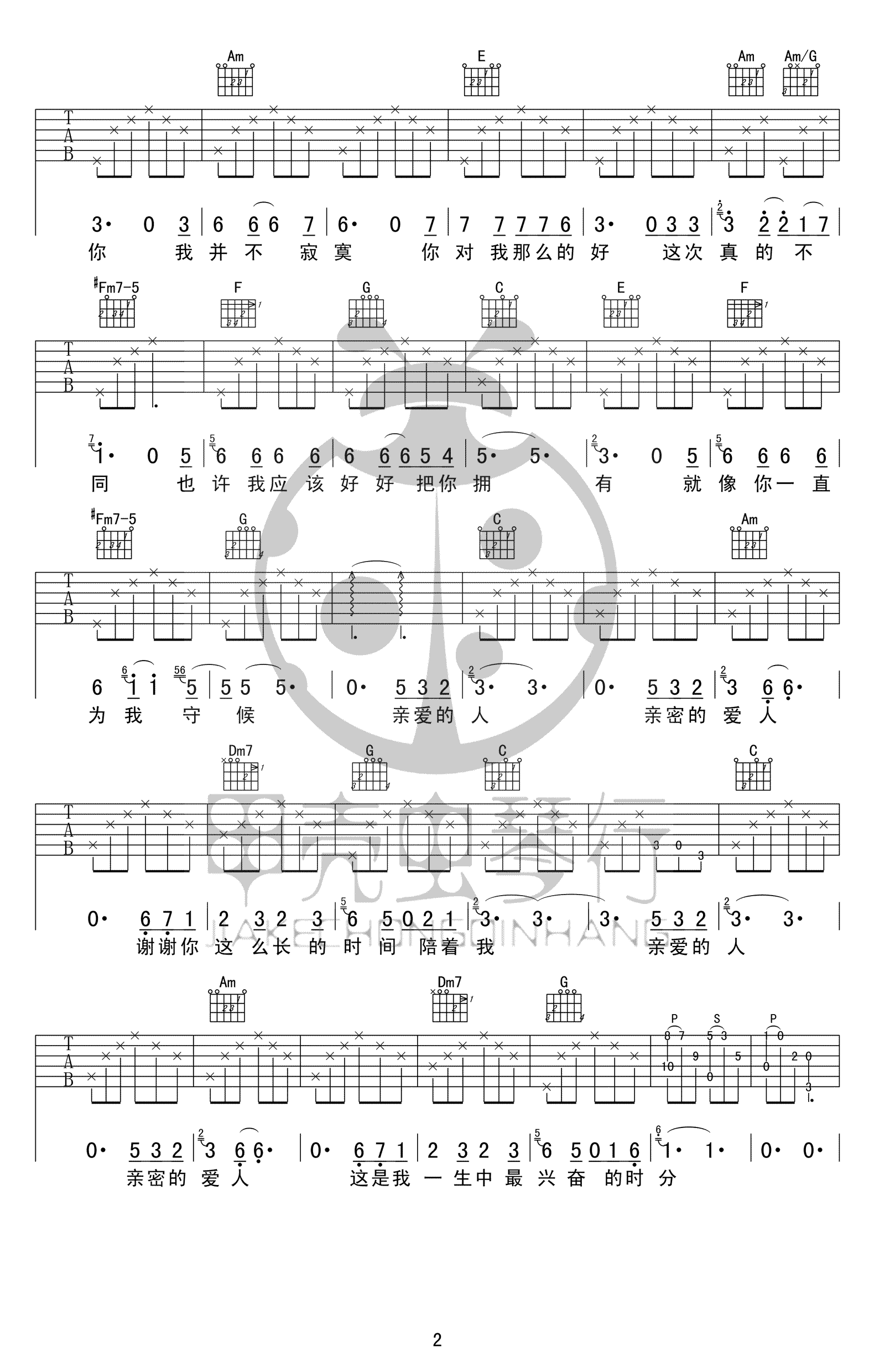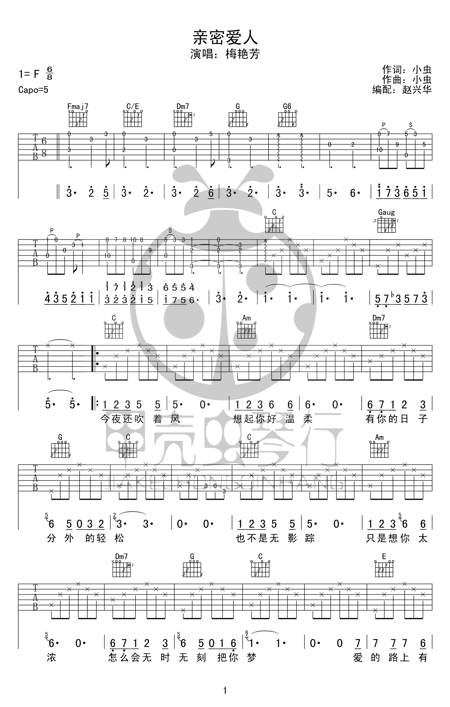 亲密爱人吉他谱,梅艳芳的一首经典代表歌曲,本谱调性F,Capo夹五品。亲密爱人六线谱,高清弹唱谱,三张图片谱例。甲壳虫琴行出品,赵兴华编配,吉他吧收藏推荐。 《亲密爱人》由小虫作词作曲,我们在梅艳芳那低沉的嗓音中听到情感的细腻和甜蜜,甜蜜中带着暖暖的温馨。抹不去的记忆,怀旧经典老歌,带你回忆往事,重温那个时代!一起弹唱老歌,一起用心聆听那些逝去的时光故事!