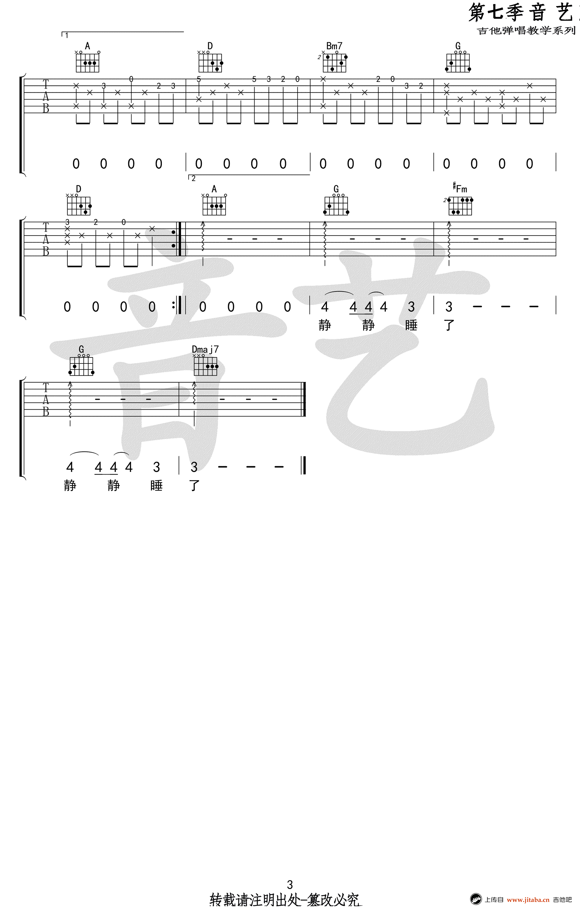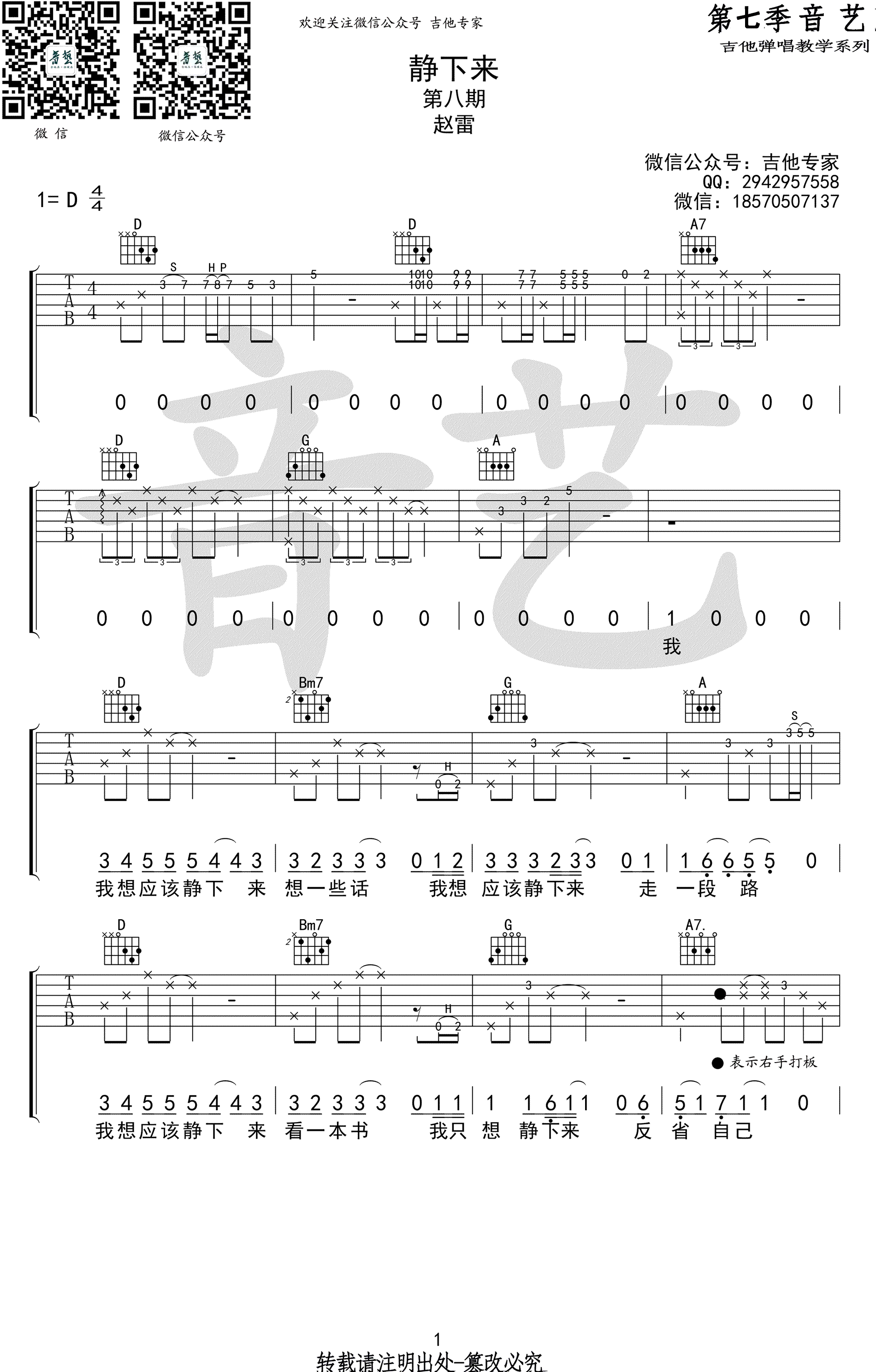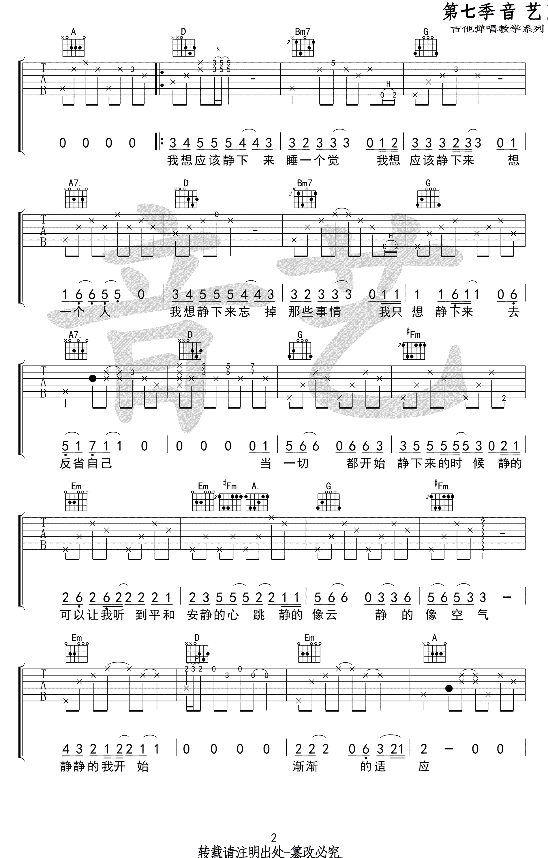 赵雷《静下来》吉他谱,D调指法,吉他弹唱谱高清版,静下来六线谱,三张图片谱。赵雷几年前的词曲创作民谣歌曲,大乔小乔原唱收录于专辑《渔樵问答》,老歌新编。感谢音艺吉他出品,吉他吧上传分享。 这首歌就如歌名一样,旋律温婉动听,温柔中透出力量,叩问着自己的心灵,将希望与力量带给每一个需要温暖的人。